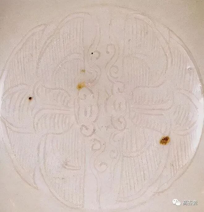 印花则是先将花纹图案刻划于陶范上,然后再将坯泥压于陶范上成型,使花纹印在器物里面,是一种集装饰与成型于一道工序上的先进工艺。许之衡《饮流斋说瓷》云:“宋瓷之佚丽者,莫如粉定,粉定雕花者,穷研极丽,几于鬼斧神工。”所谓粉定,是指其胎质白似粉,其釉为白玻璃质的定窑白瓷佳品,而穷研极丽几于鬼斧神工,指的就是定瓷的刻花及印花工艺。宋代柴、汝、官、哥、定五大名窑,多以颜色釉瓷而享名于世,唯独定窑为白釉瓷,如果没有这些精湛的刻、划、印等装饰工艺,定窑是很难与其他名窑比肩的。