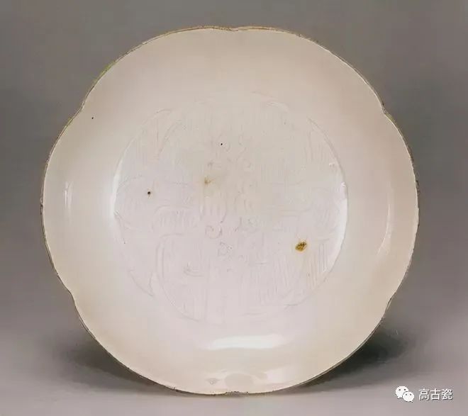 白釉划花对蝶纹北宋“官”字款花口盘口径10.5厘米,足径5,7厘米,高2.7厘米。芒口毛足,平底。口壁呈五曲花瓣形,内底饰两只相对展翅的蝉纹,矮圈足,内划行书“官”字。