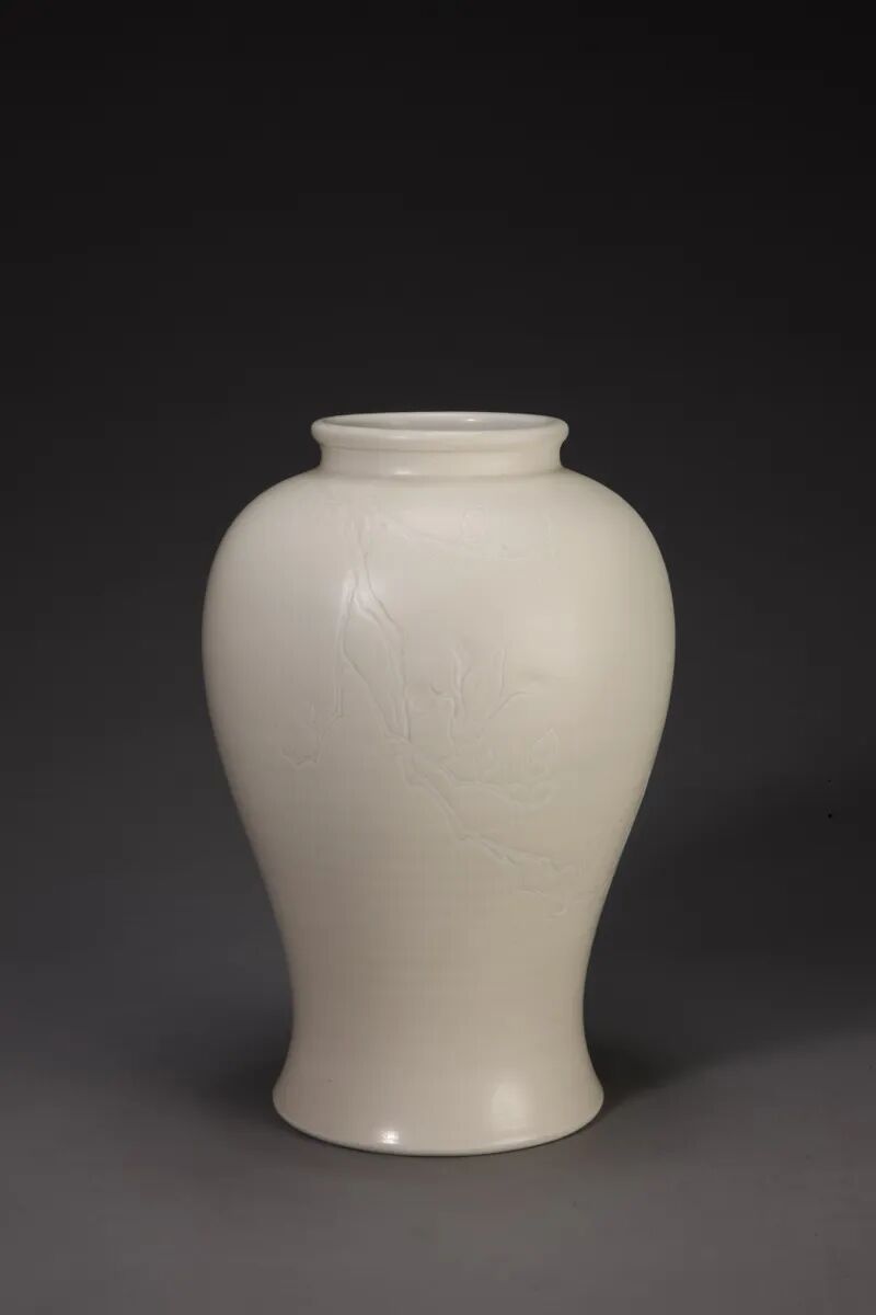 此尊造型古雅,釉质如象牙般温润,纹饰构图别致,玉兰素雅俏丽,增添了纯白釉瓷的风韵。德化窑白瓷一般均小巧玲珑,如此大件琢器是明德化白瓷中罕见的精品。