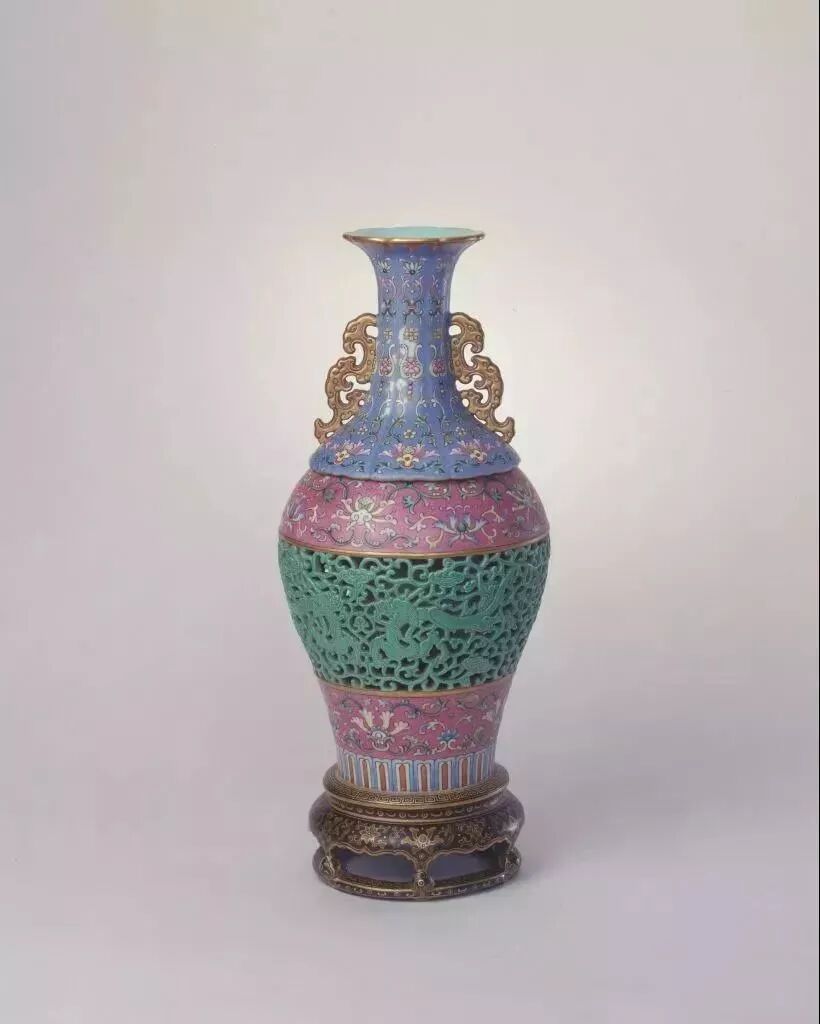 清乾隆粉彩镂空云龙纹夔凤耳转心瓶