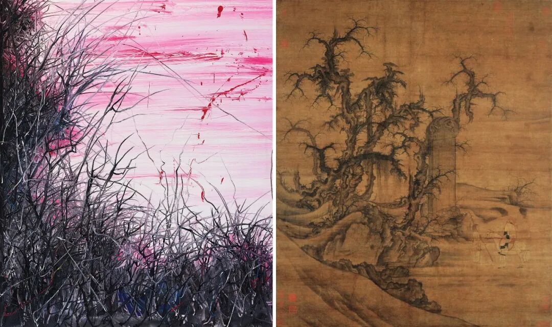 《风景之二》(局部)与 五代 李成《读碑窠石图》(局部)日本大阪市立美术馆藏
