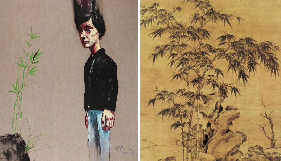 《人,竹子》(局部) 与 元 李衎《双钩竹图轴》(局部)