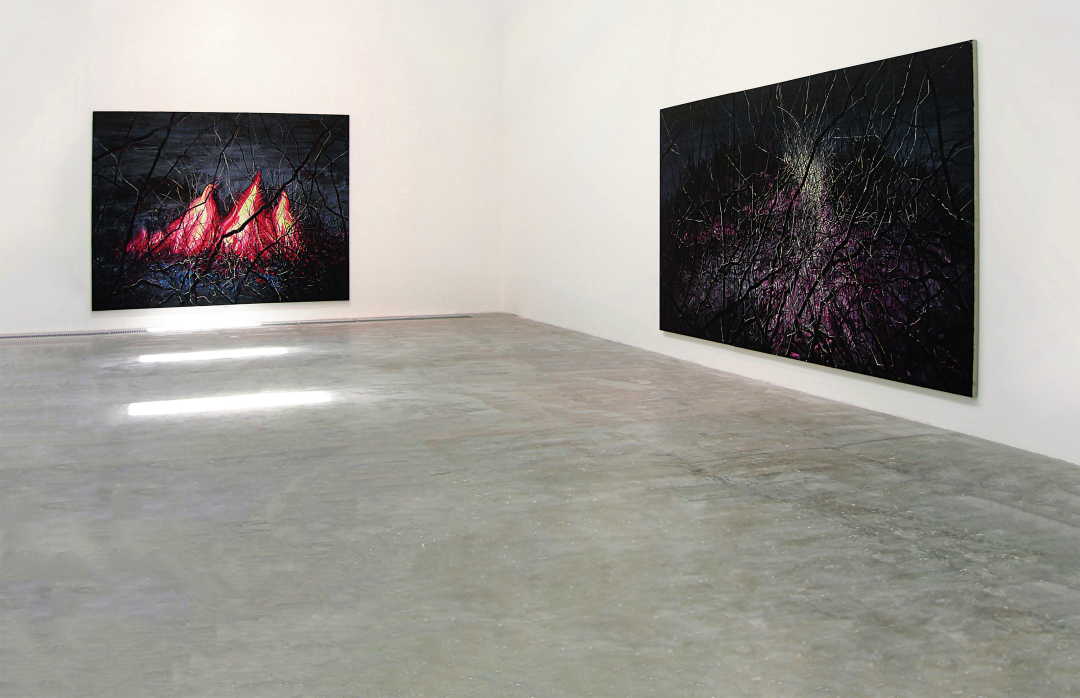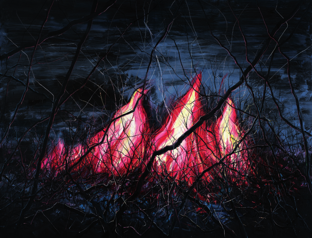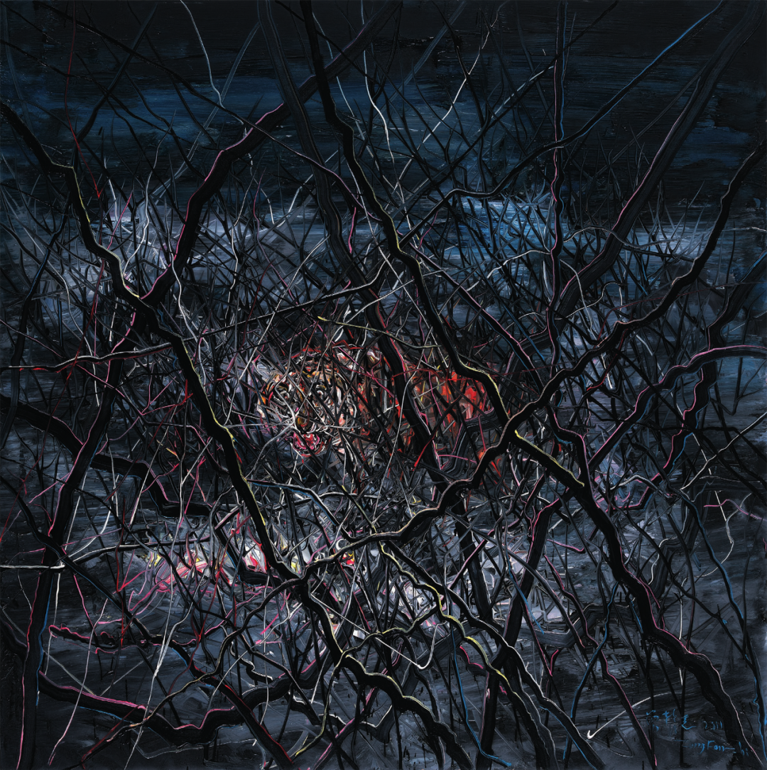 2008年创作的“乱笔”系列巨作《火》即为其中翘楚。在创作的过程中,曾梵志将风景本身的不确定性逐渐淡化,试着从更深的中国传统文化的角度做重新阐述,以寄望在浮华的社会背景下,让绘画本身得以本质上的回归。全幅再现了野火漫天的旷野,干枯的枝条痉挛地伸向天空,白炽的火焰在夜风中跳跃,丛林密布的大地上留下颤动的暗红积碳。