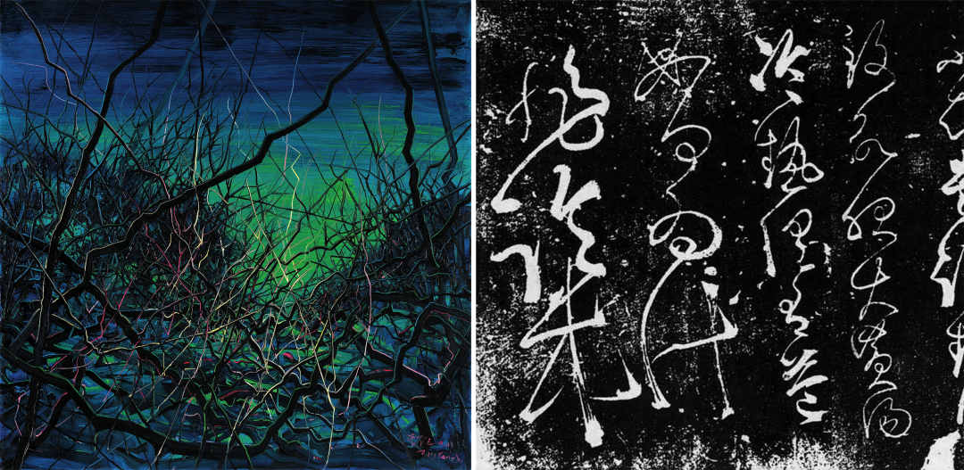 《无题11-4-4》(局部)与唐 张旭《肚痛贴》拓本(局部) 台北故宫博物院藏