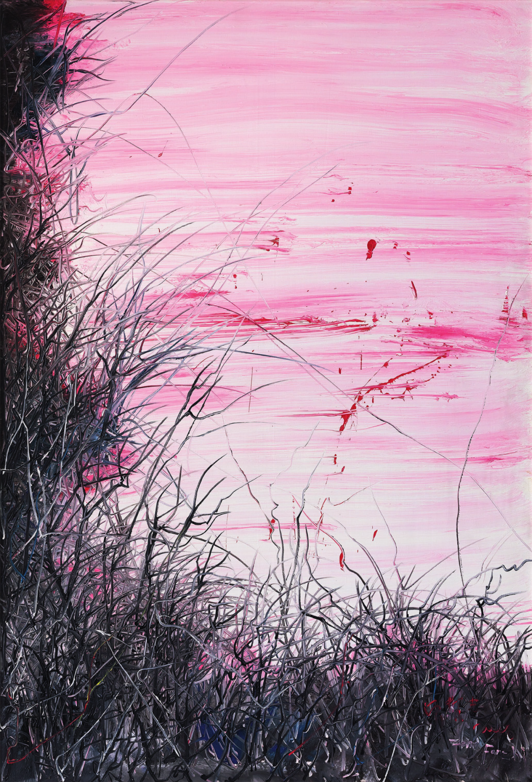 从作于2006年的《风景之二》中,可以看到曾梵志对自然的观察细致深入,虽以“乱笔”抽象为语言,然而皆以真实的细部为前提。画家曾通过观察藤蔓类植物来研究线条的用法,又在草书狂放不羁的笔势中汲取了关于画面动势的灵感,因而画面中的草丛用线浑然天成。不同于其它乱笔绘画满篇的线条交错游走,此幅画面多出留白,与线条密布之处形成了虚、实、疏、密的巧妙对比,在追求画面张力的同时亦有意设置视觉上的平衡与含蓄意境,颇具古人“逸笔草草,不求形似,聊以自娱”的超然心境。关于画面中的风景曾梵志曾说:“那些不是眼目所及的风景,而是内心世界的映射。这种瞬间的妙悟是一趟精神上无止尽的探求之旅。”