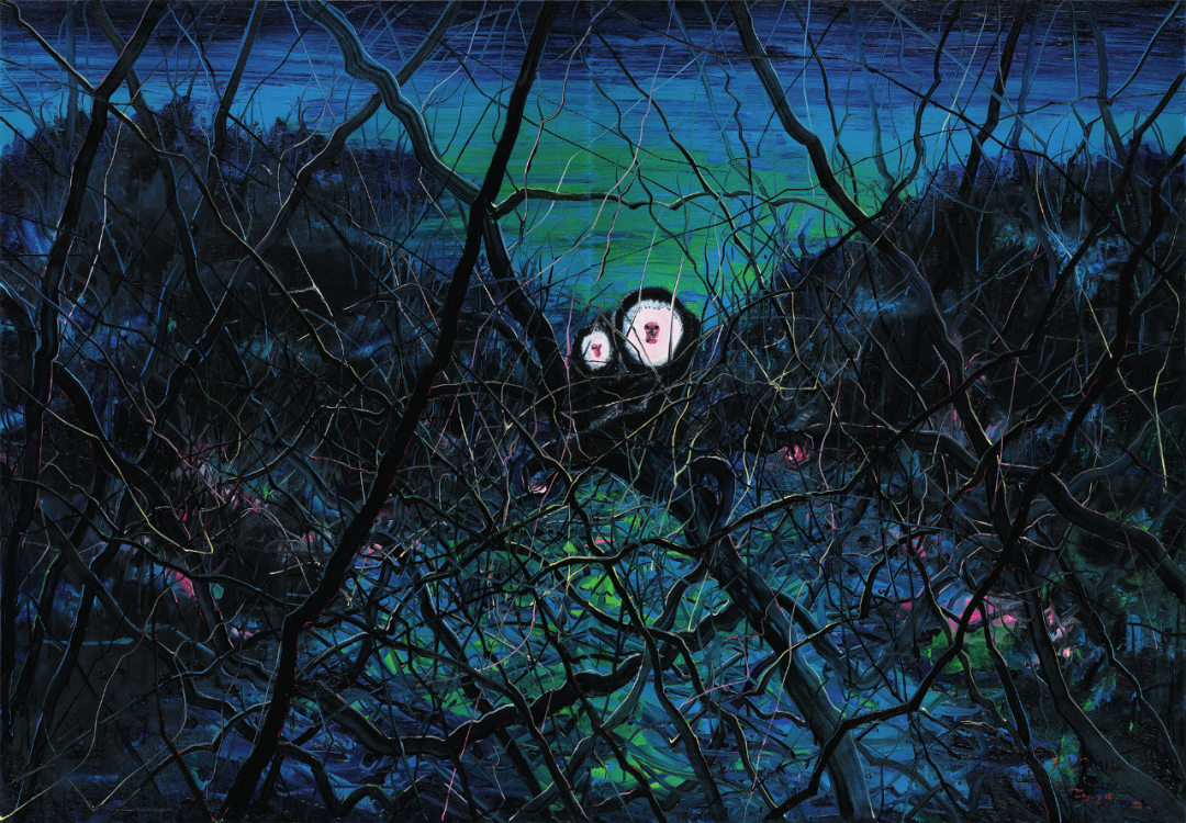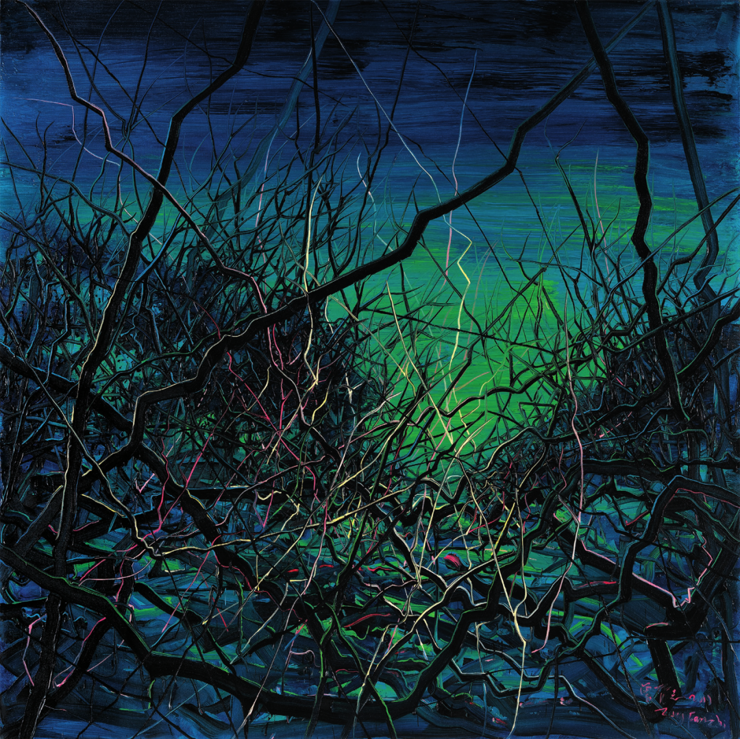 除了在“乱笔”中加入各色形象,曾梵志亦有一系列“无题”作品专注于纯粹风景的表现。在2011年创作的《无题11-4-4》中,大片的蓝色、绿色衬托着深色背景上纵横交错的枝桠,在画面空间中显得既明亮又荒凉。鲜艳的色彩困在荆棘里,挡住了观者的视线,即诡异又醒目。此时此刻,“乱笔”风景不再指向某一特定的对象与观念,亦不拘泥于任何规则与既定逻辑,使预设性与偶发性共同作用出画面效果,既在“有意”与“无意”、人工与自然之间建构了一种新的艺术语言与新的艺术方法论。