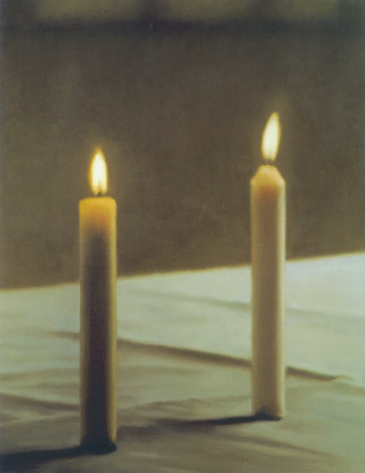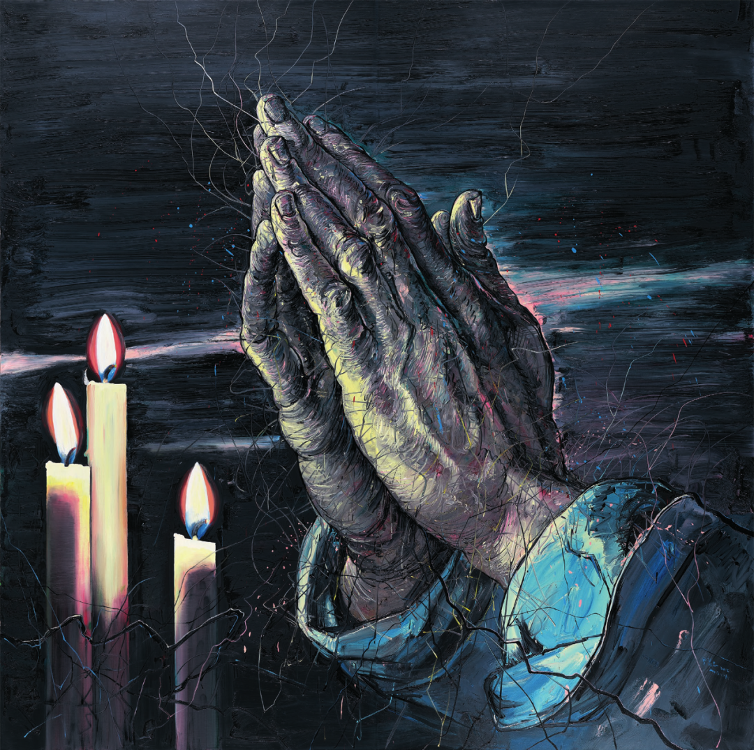 与此同时,极具质感的厚涂颜料还生动地呈现出肉身衰老时的微妙变化(如皮肤的暗淡、肌肉的松弛等),虽是脱胎于大师原作,但仍极具新鲜感与视觉冲击。此外,画面左侧出现的三个发光的蜡烛,又暗指另一位德国艺术家格哈德·里希特(Gerhard Richter)的“蜡光”系列。在最终完成的画面中,手、蜡烛与“乱笔”线条之间构成了难以言喻的动态平衡。蜡烛的圣洁与坚忍,手的沧桑与虔诚和线条的干扰与破坏,形成了全新的艺术内涵,似乎喻示着信仰者在当代的真实困境——蜡烛点燃并维持着信念之光坚定不移;心灵的祈祷姿态藉着手来表达;混乱、繁复、躁动的线条隐喻着当代人类共同面临的现实与精神困境。