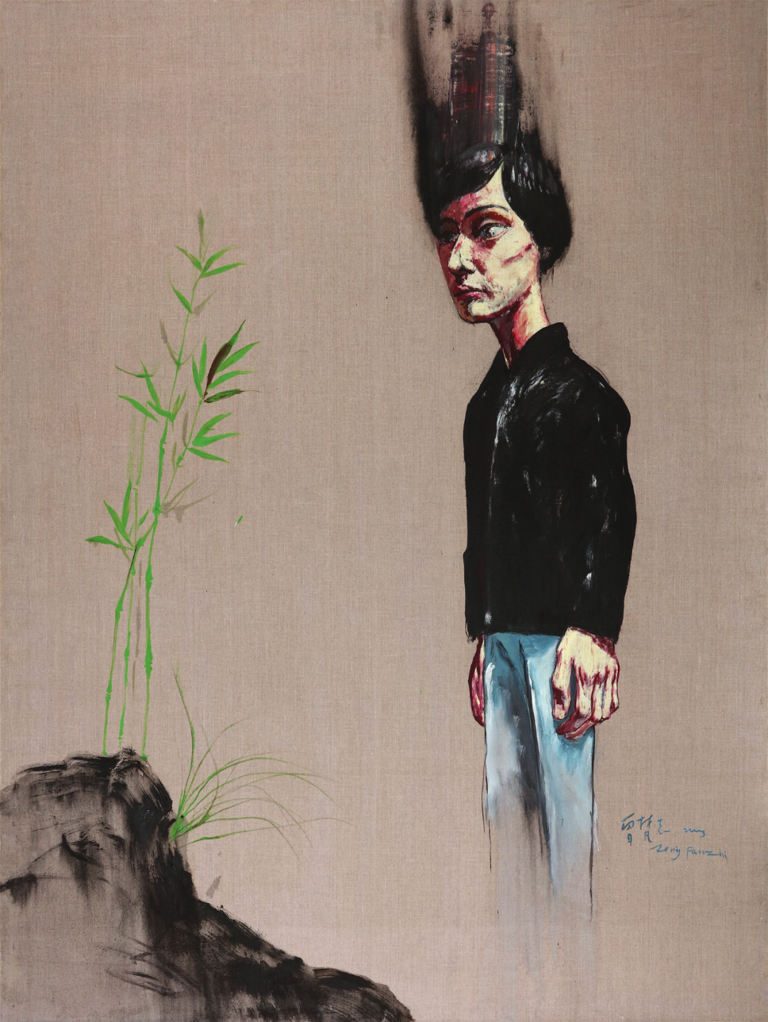 在创作于2005年的《人,竹子》中,画中主人公面朝石间几只细竹,神情凝重。全幅构图简洁明快,人物结构却不再完整,头部笔触模糊,腿部以下也渐渐虚化。主体一方面逐步浮现,一方面又似消散如烟,发展出一种近乎中国禅宗的减笔写意风格。画家以近于白描线条笔触来勾勒竹子,画面中有大面积留白,笔触轻疏淡薄,在肖像的上下方大幅度的拉刷油彩,传达瞬间消逝的视觉印象,渗透对人生消逝、变幻无常的感伤情绪。