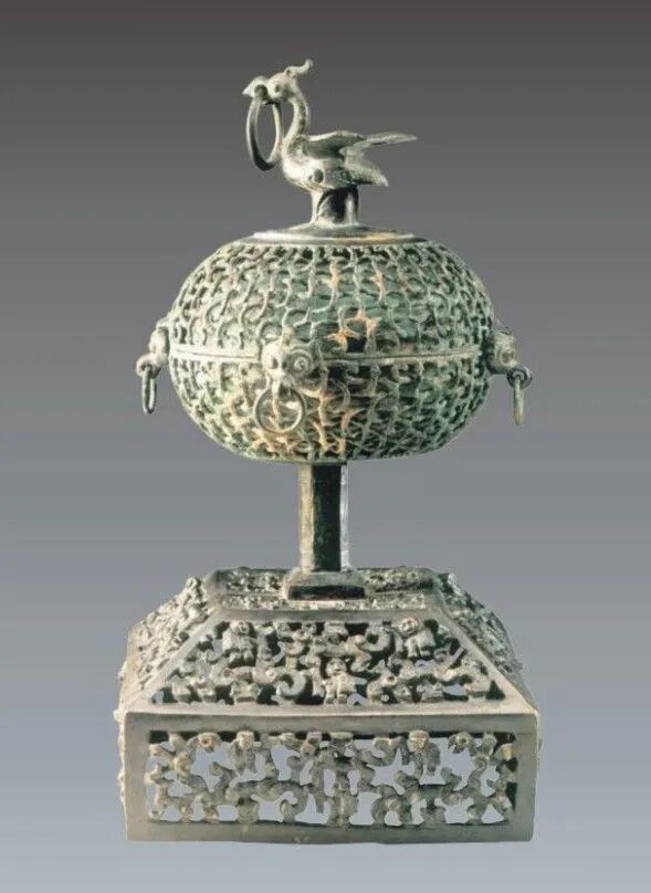 熏炉底座为覆斗形镂空雕刻,采用失蜡法铸造而成。