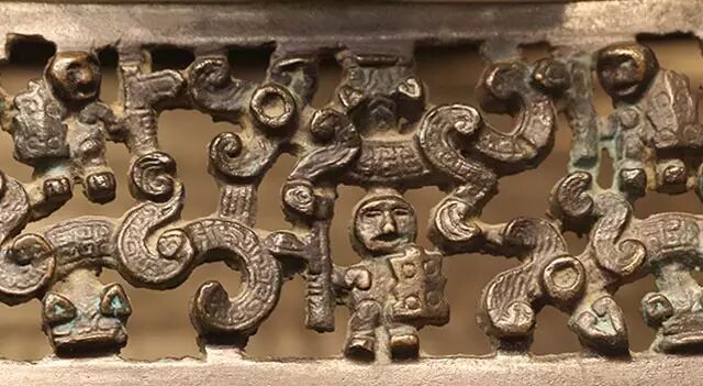 底座分为立面与斜坡面,雕刻中轴对称图案,外侧为小兽及夔凤,内侧为虎纹,中间部分有一手持盾另一手持戈的武士像。