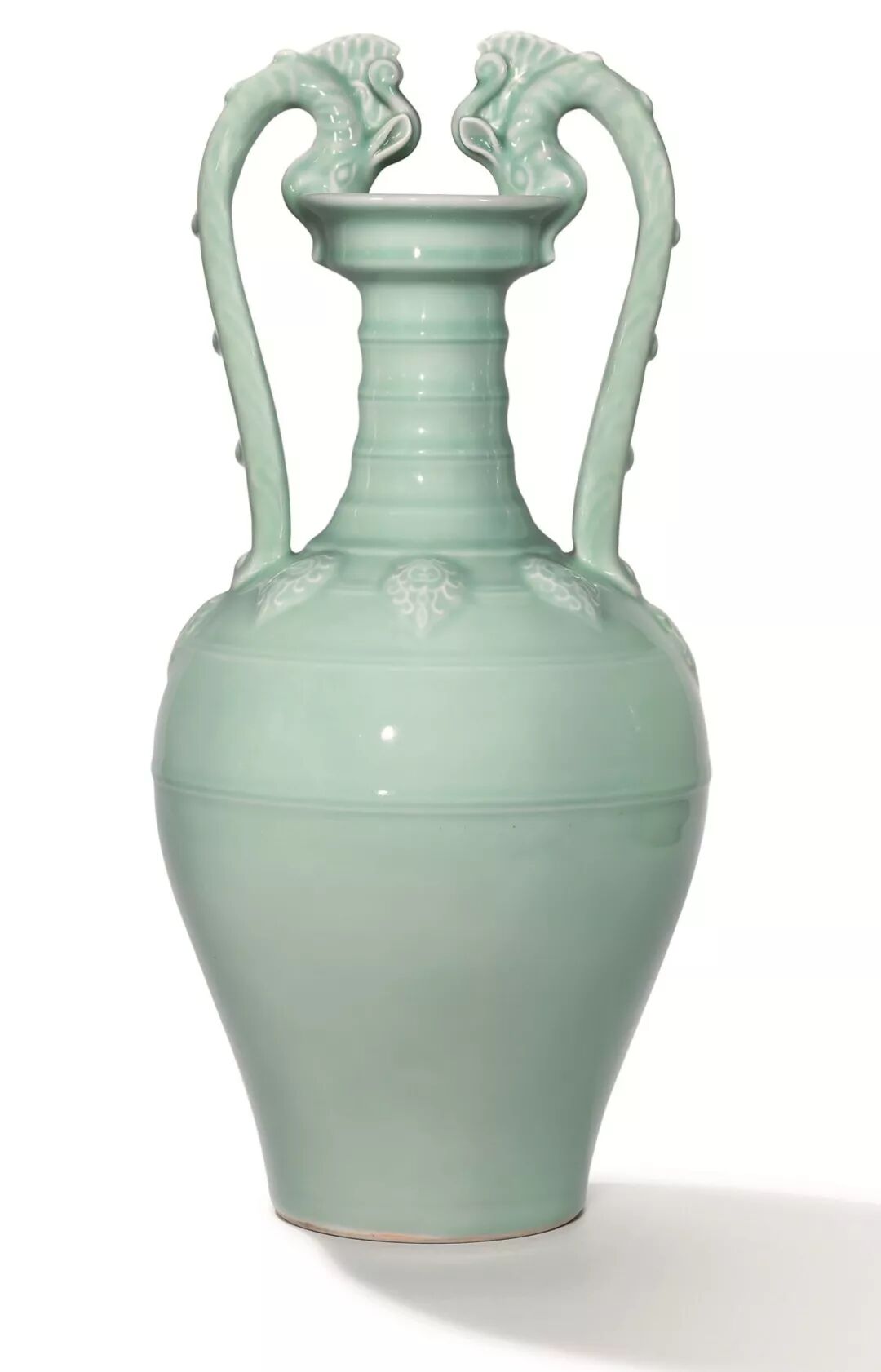 后期多家大拍卖公司都有单色釉专场推出,这以后单色釉瓷器也成为瓷器拍场大项,时不时出现亮眼的拍品,2017年香港佳士得秋拍中,一件清雍正粉青釉贴花双龙盘口尊,以1.24亿天价成交,这件精美绝伦单色釉瓷器,刷新了明清官窑单色釉瓷器的世界纪录!