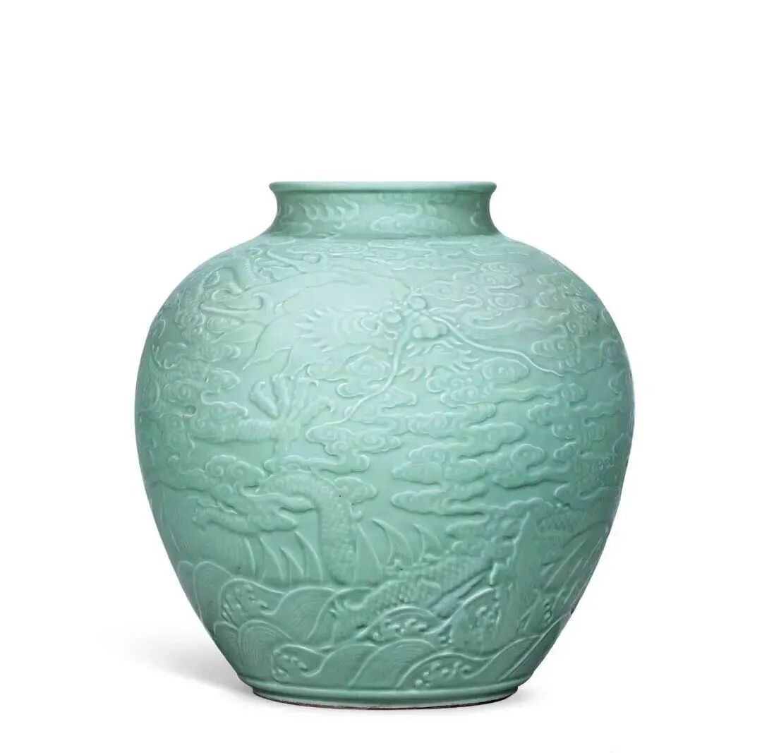 清乾隆 粉青釉浮雕“苍龙教子”图大罐