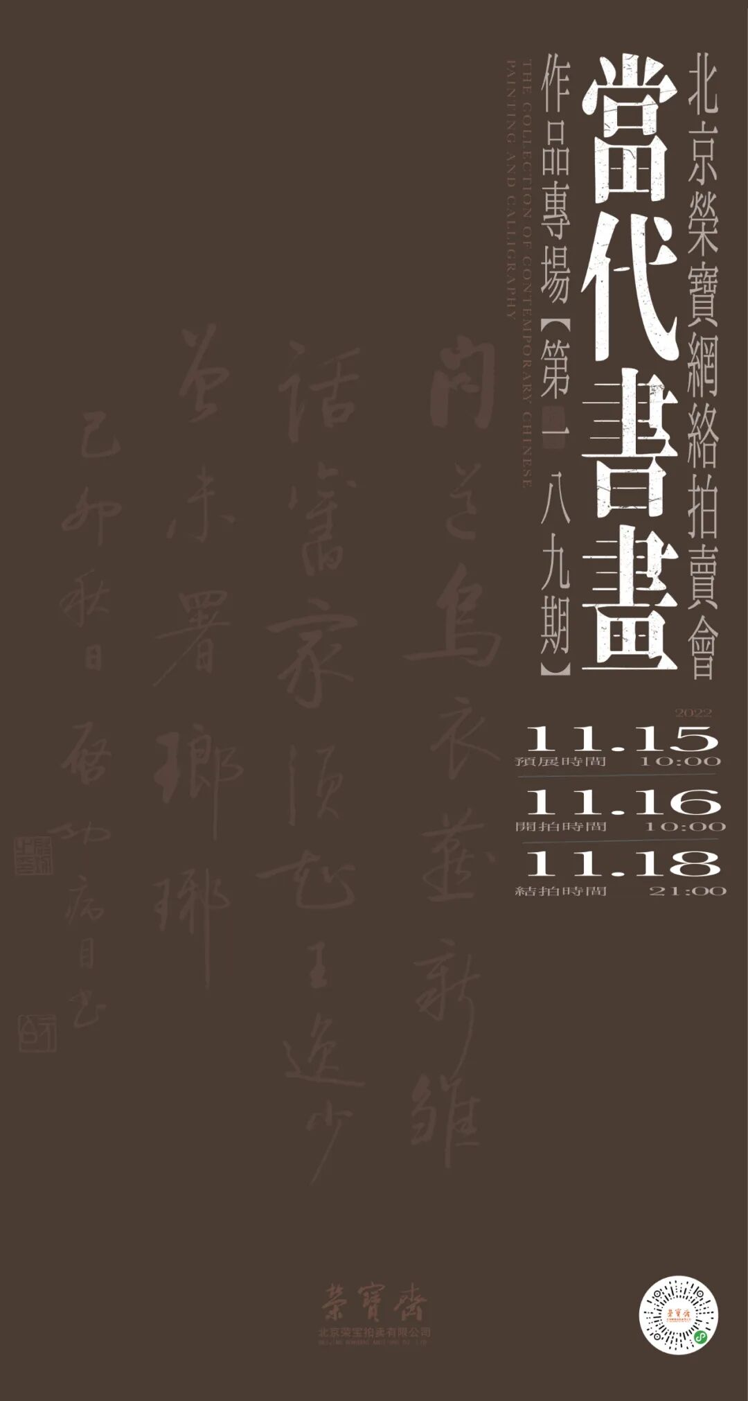 北京荣宝·当代书画作品专场网络拍卖会(第一八九期)将于11月15日10:00-11月16日10:00开启线上预展,并于11月16日10:00开拍,11月18日21:00结拍。