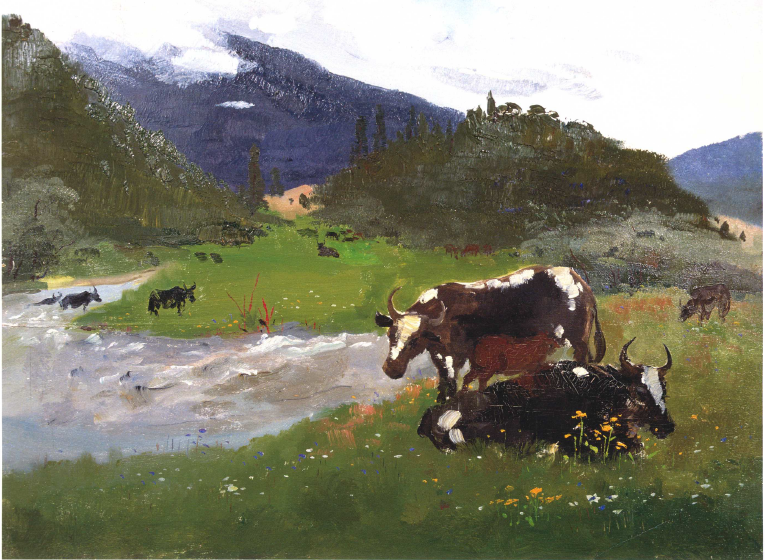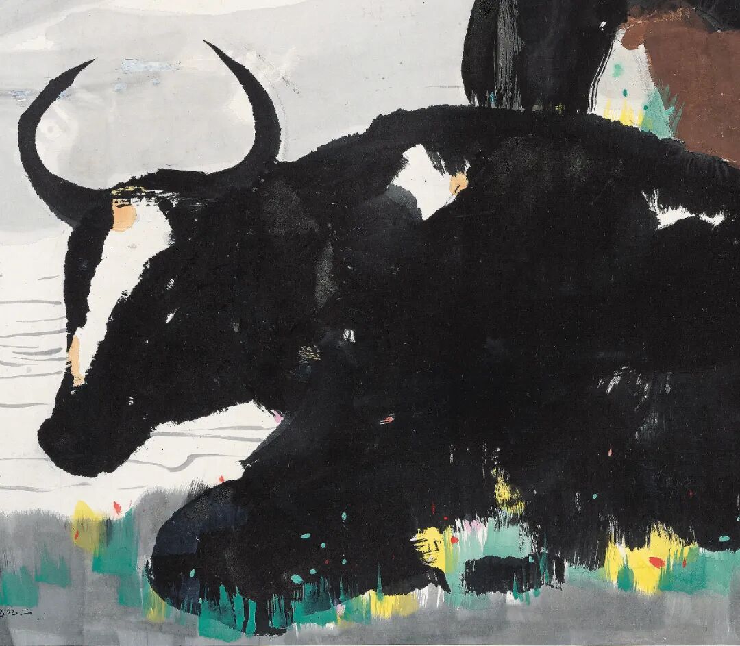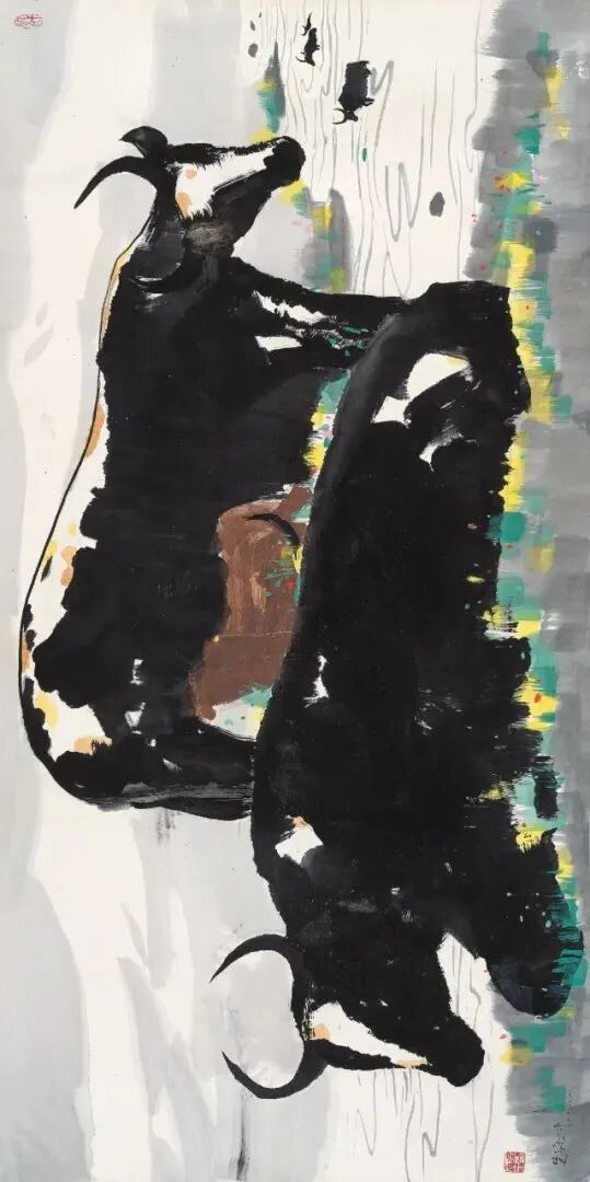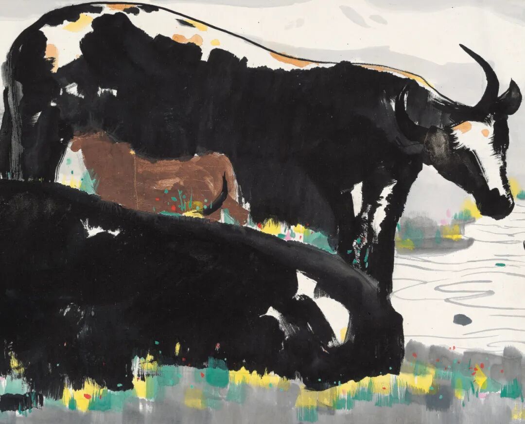 1.《东方情思──吴冠中画集》第45页,斯民艺苑,一画廊,1993年9月。2.《中国近代名家书画全集──吴冠中──寻故人》,翰墨轩,1995年。3.《吴冠中精品选集》第232-233页,艺达作坊,1996年10月。4 .《吴冠中作品收藏集》第2 1 0 - 2 1 1 页, 人民美术出版社,2003年9月。5.《吴冠中全集》(第7卷),第146页,湖南美术出版社,2007年。6.《自家江山——吴冠中诞辰100周年作品集》第93页,2019年。西方绘画在重视表现形式感的同时,也极重对于体积感的刻画。此幅《双牛图》,是吴冠中先生作品中极少的以展现如雕塑般体积和厚重感为刻意和着重追求的一件难得的艺术佳作。吴先生以用面塑造形体和动态的方式,将生活中常见的水牛打造得如钢铁浇铸一般,不仅使人联想起颐和园湖畔守卧百年的铜牛。铜牛会千年不朽,吴先生的艺术更会万年长青。