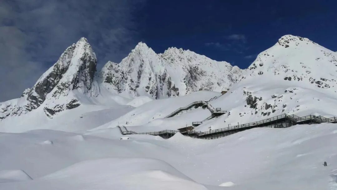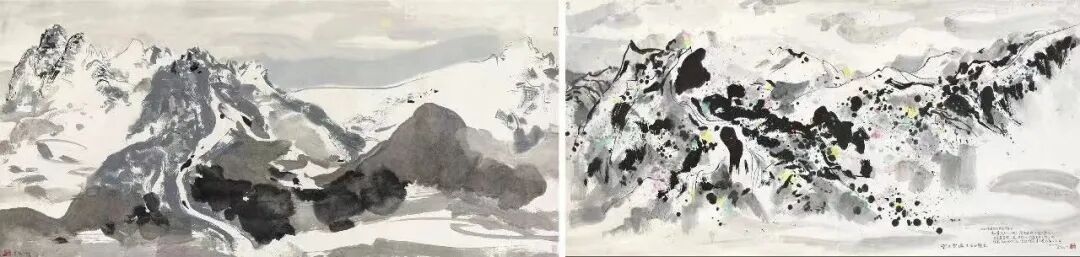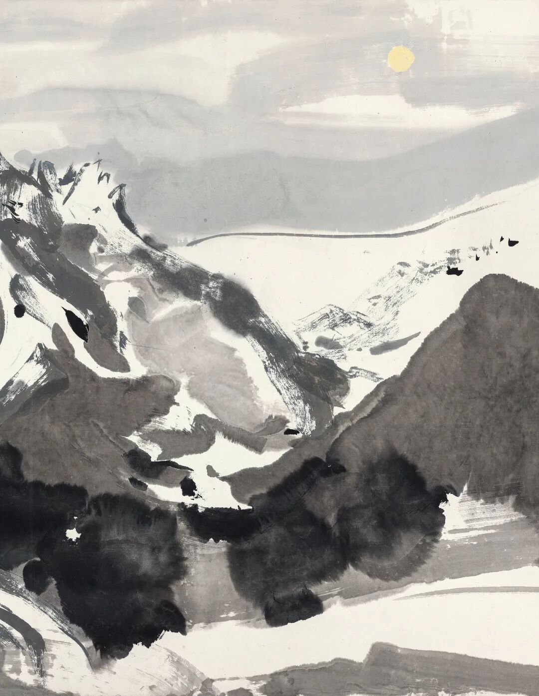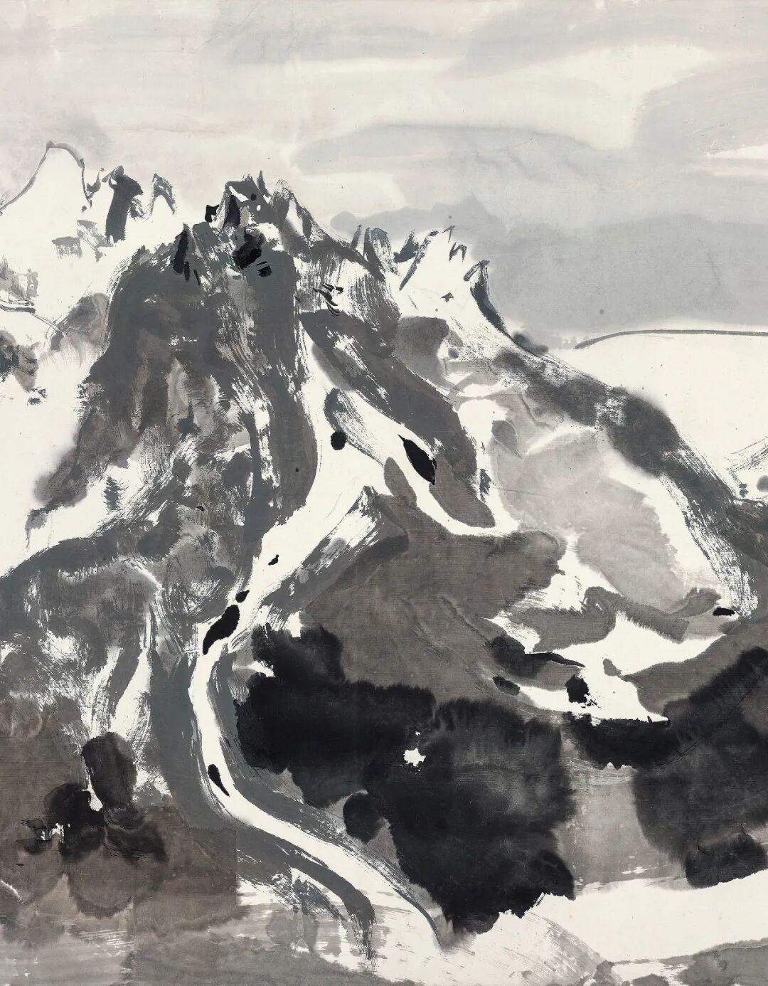 1978年,我终于到达了玉龙。离了版纳,我经大理、丽江,从危险的林场道上搭乘运木材的卡车直奔玉龙山。我由一位青年画家小杨(即杨福泉)陪着,住到黑、白水地方的工人窝棚里,床板下的草和细竹一直伸到床外,吃的是馒头和辣酱,菜是没有的。都无妨,就是玉龙山一直藏在云雾里,不露面。你不露面,我不走。小雨、中雨、阴天、风夹微雨,我就在这阴沉沉的天气中作油画。大地湿了就像衣裳湿了,色彩更浓重,树木更苍翠,白练更白。就这样连续一个多星期,我天天冒雨写生,画面和调色板上积了水珠,便用嘴吹去。美丽的玉龙山下,湿漉漉的玉龙山下,都被捕入了我的油画中,我珍爱这些诞生于雨天的作品。我们的窝棚有一小窗,我就睡在窗口,随时观察窗外。一个夜晚,忽然月明天蓝,玉龙山露面了,通身洁白,彷佛苏珊出浴。我立即叫醒小杨,便冲出去就地展开笔墨写生,小杨搬出桌子,我说不用了。激动的心情恐类似作案犯的紧张。果然,只半个多小时,云层又卷走了一丝不挂的裸女,她再也没有露面。一面之缘,已属大幸……此幅作品在构图方式上并未选择延续传统水墨的完整性,山脉、水流的走向,以及其中近大远小的透视关系,同样与中国传统水墨形成有趣的差异,相较传统水墨更为平铺的画面和层层迭加而上的山脉,吴冠中的新水墨所建立起的黑与白的对照,线与块的对照,以及动与静的对照,赋予作品强烈的空间深度以及视觉上的张力。这便是他所认为的美,“包含了对比、和谐、起伏、节律以及多样统一”。右图:吴冠中《玉龙雪山》,北京保利拍卖2016春拍成交价:RMB 34,500,000《月下玉龙山》不单承载了吴冠中对玉龙雪山的敬畏与仰慕之情,也使看似不兼容的西方油彩与东方水墨因此跨越了传统与现代。