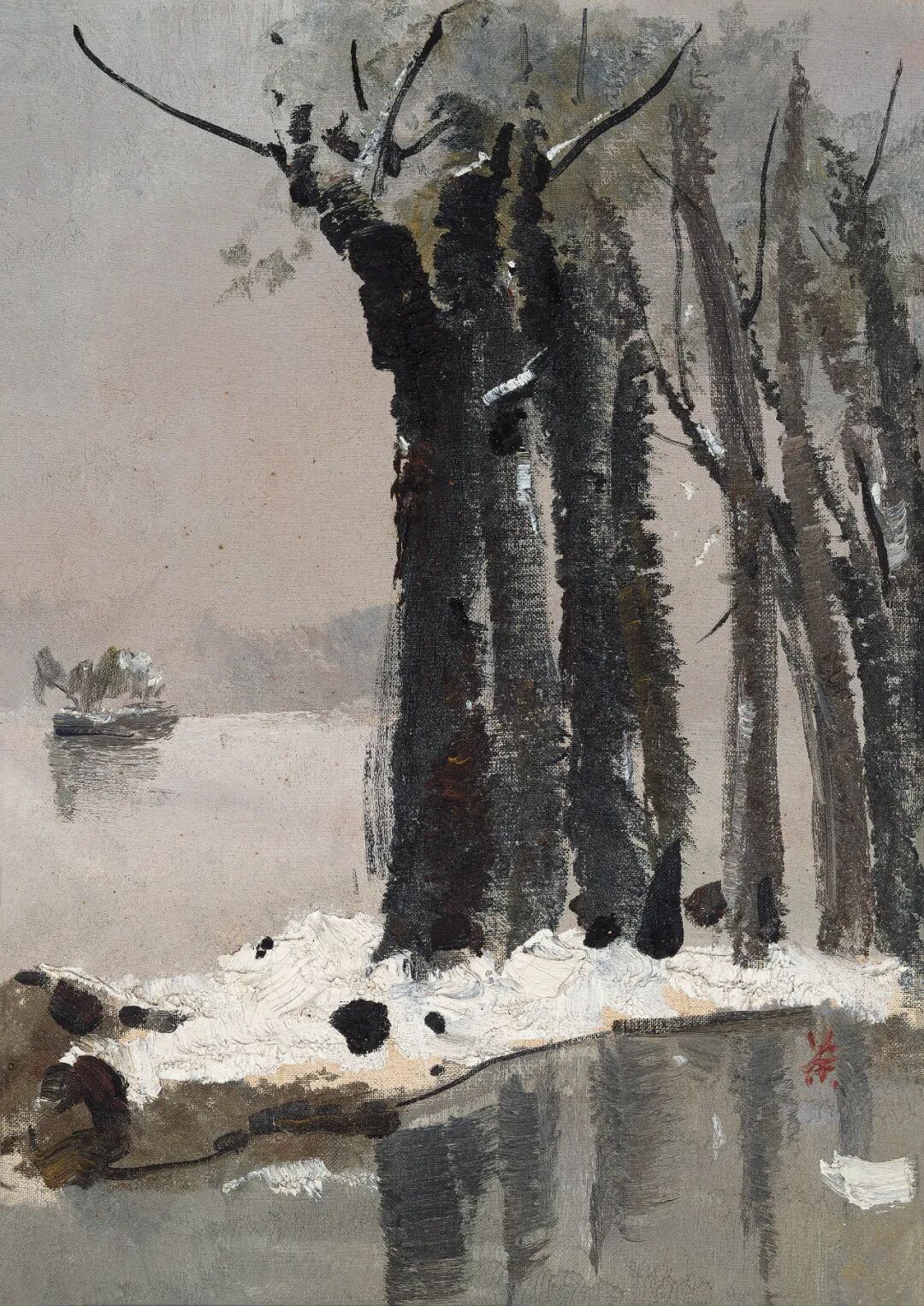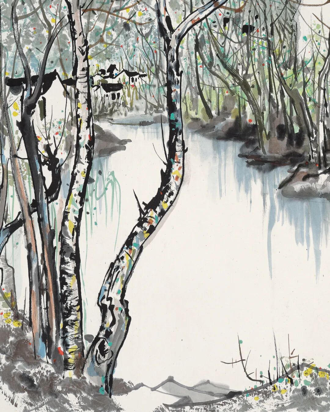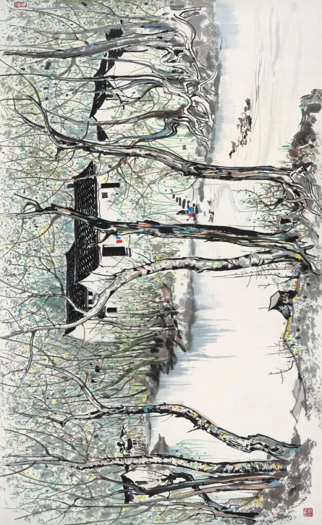 出版:《中国书画的收藏鉴定与投资学》第344页,上海画报出版社,2007年1月。《北京雪》描绘了吴冠中先生故居前什刹海的雪景,表现色彩与意境,取源于西方艺术精蕴;其树干枝桠则表现造型与精神,更多是中国艺术之追寻。以斑驳细碎的笔触点染出枝桠的粗糙质感,勾勒其曲折清奇、疏朗之形态。冬雪与寒枝,在中国诗词有独特的象征隐喻。![]()