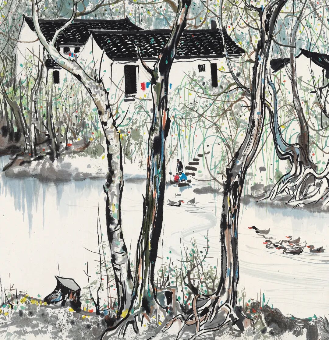 1、《吴冠中作品收藏集ⅠⅡ》,第38页,人民美术出版社,2003年。2、《吴冠中全集》(第5卷),第184页,湖南美术出版社,2007年。“故乡”是吴冠中作品中最常被表现的题材之一,这股乡愁被他转化成画笔下的白墙黑瓦、小桥流水和春柳飞燕等美景,很难想象,一个人的童年要过得多么美好,才至于如此不愿忘怀,也正因此成就了其个人艺术创作的亮点,也成全了无数艺术爱好者的欣赏点。《故乡》为描绘江南村落景色为内容的作品,是吴先生以线写景、用线颇多、变化丰富且极尽繁密的一幅精心绘制的极具代表性的重要的精品画作。画中,初春时节的农家村落掩映在嫩芽的初绿、新枝交错的繁茂的勃勃生机之中。根须盘生、枝干挺秀,茂密处似一道用生命筑起的天然屏障,空灵中,是清澈、舒缓得不见一丝水波的如镜河面,只有岸边三、两劳作的大人与孩子,以及嬉戏、畅游水中的群鸭,无意中搅动了这浓浓的春梦,似在提醒和告诉人们,这就是画家记忆中温馨与恬静的故乡的真实和美丽。此幅《故乡》,吴先生用线的丰富、精致细密、繁茂,使人们在震惊、叹服、盛赞的同时,不得不承认其精品中的超凡品质。