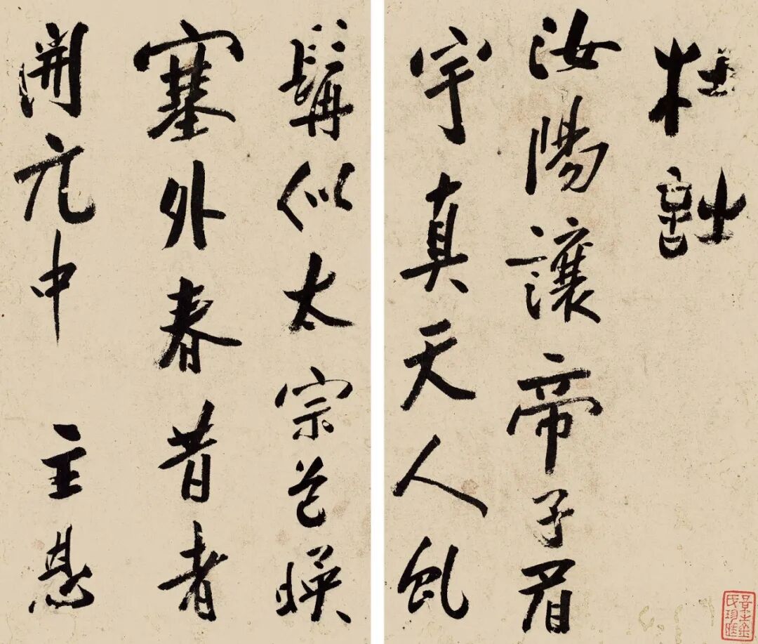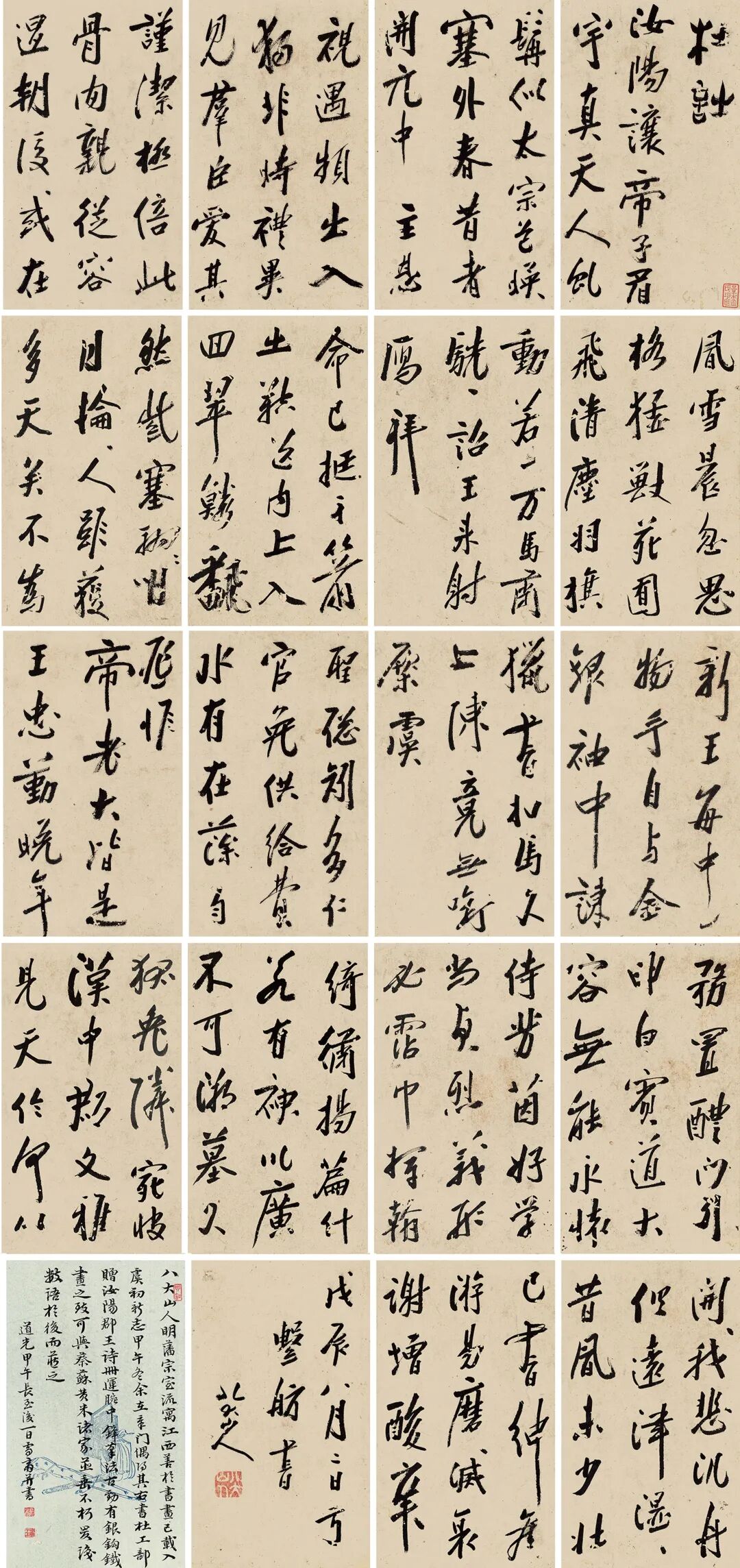 八大山人《行草<杜诗>册》录杜甫《赠太子太师汝阳郡王琎》诗,款署:“戊辰(1688年)八月二日”,时八大山人年六十三岁,为其第四时期典型书风代表作。![]()