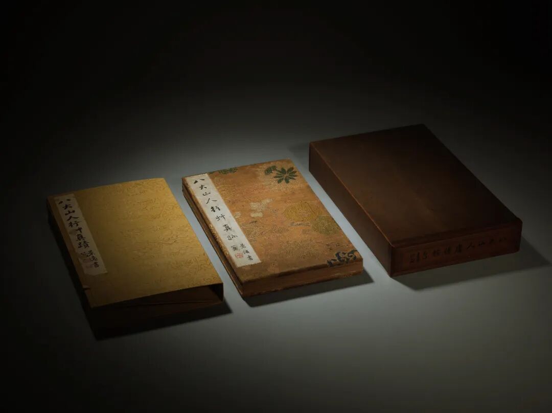 册页(十开十九页)水墨纸本25×14.4 cm.×191.杨瑞、江上琼山旧藏。江上琼山题盒并题函套签条,沈景修题册页签条。杨瑞题跋。2. 保留清代册页裱工并附日本盒。册页背面题字:此册于道光十四(1834)年季冬二十一日在西江市中购得,花银十一两。4. 江上琼山(1862-1924),名景逸,字希古甫,号琼山。室名:数峰青处。日本著名南画家。与晚清时期中国画家吴昌硕、陆恢等尤为深交。跟守山湘(马十风)学习中国绘画,跟冈田篁所学习书法。5. 沈景修(1835-1899)字蒙叔,号汲氏,嘉兴人,善书,俯仰古法,从衡正曹,真行入古,得杨少师韭花帖真传,偶写花卉,效法悲盦。6.“湘碧山房”或为日本著名作家谷崎润一郎的斋号。谷崎润一郎(1886-1965),日本近代小说家,唯美派文学主要代表人物之一,《源氏物语》现代文的译者。代表作有《刺青》、《细雪》等。曾在1958年、1960-1965年7次提名诺贝尔文学奖。谷崎是三井银行上海支店长土屋计左右(与吴昌硕交善)的同学,喜好中国文物。“眼高百代古无比,书法画法前人前”是石涛对八大山人艺术的赞誉,评价之高,世所罕见。八大山人不仅是一位杰出的画家,在书法方面更是独辟蹊径,其书用笔不作锋芒,结构纵逸欹侧,以冷峻、空寂的风格,树立了文人书法的新格局,展现出圆融高古、独树一帜的面貌。![]()