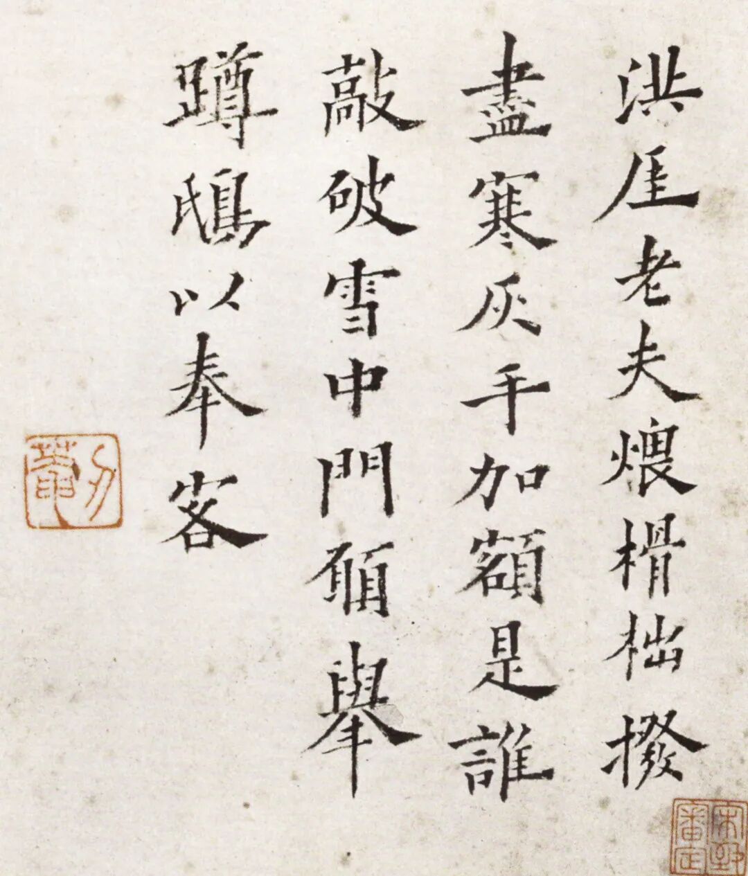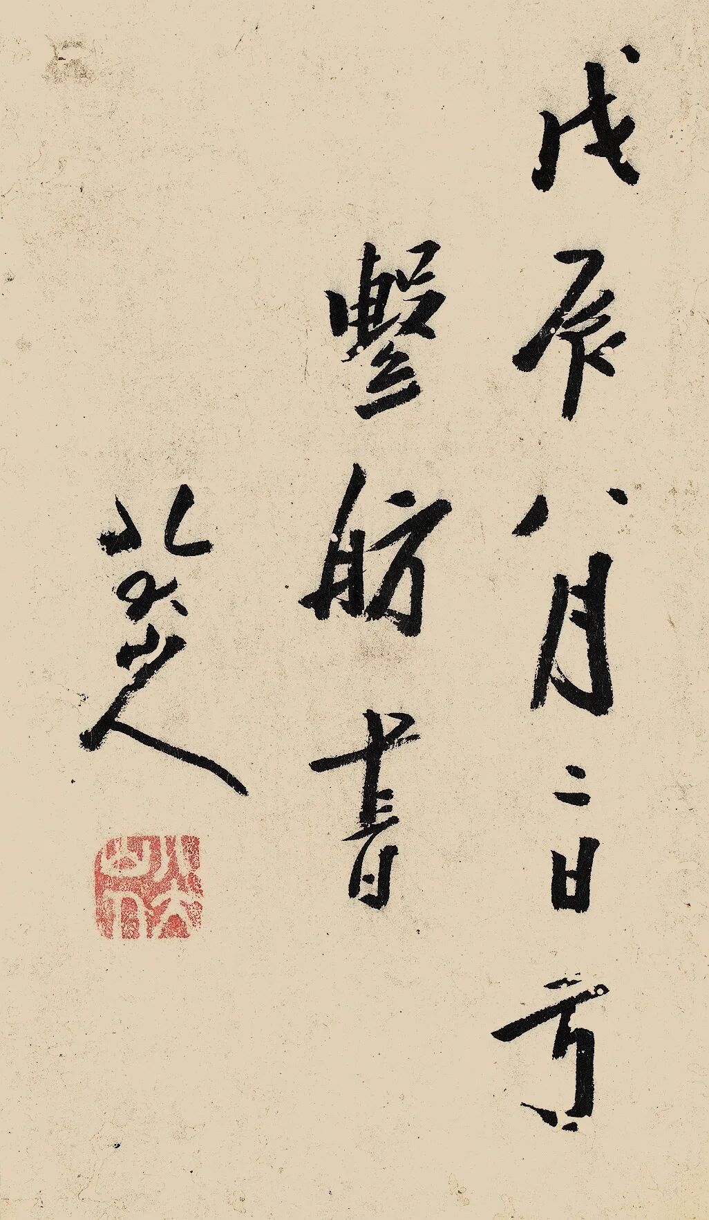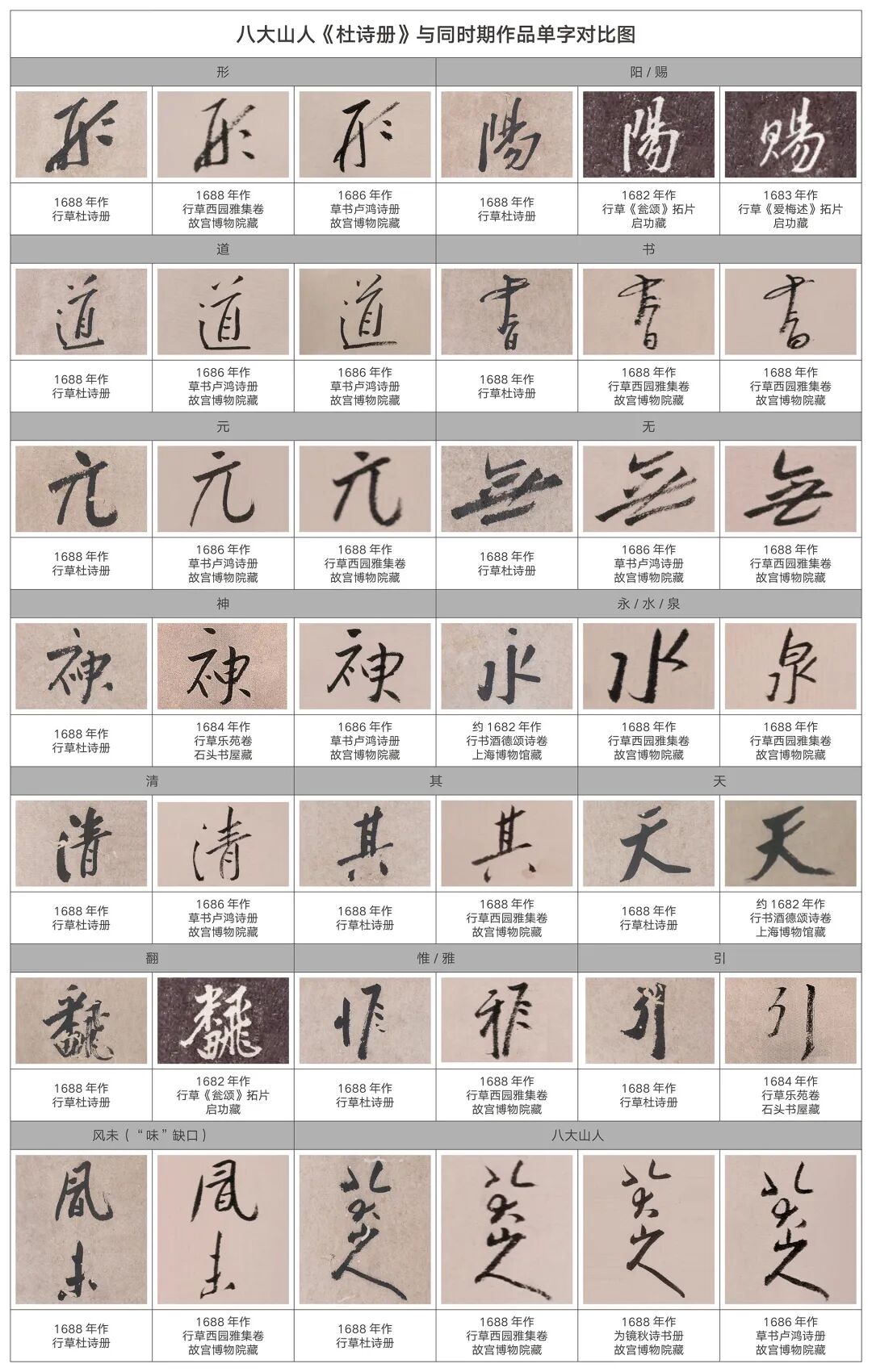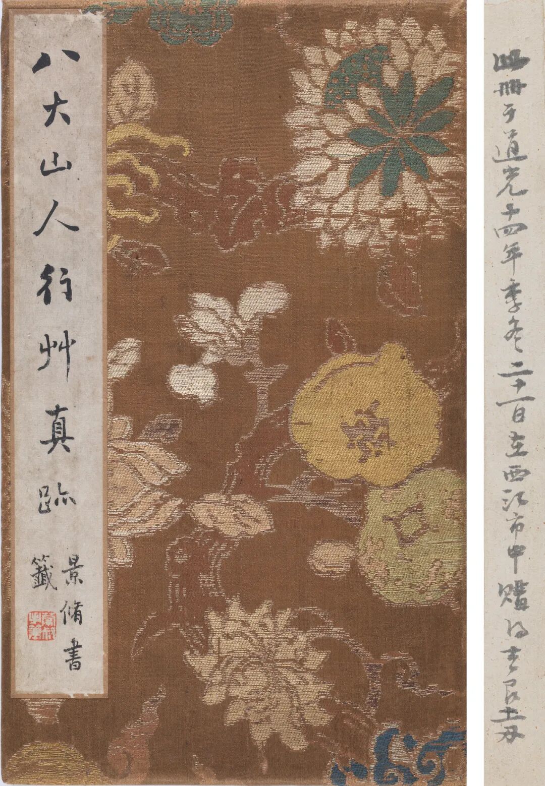 此作与1688年8月5日创作的故宫博物院藏《行草西园雅集卷》时间仅差三天,《行草<杜诗>册》在前,《行草西园雅集卷》在后,二者皆以行草书之,前者行楷为主,偶作草书,敦厚持重;《行草西园雅集卷》多以草书为主,灵活放纵,恬静松弛。二者再与故宫博物院藏其于1686年作《草书卢鸿草堂诗册》相较,明显可以看出此时书风的高度一致性。《行草<杜诗>册》全篇以行书为主,融合黄庭坚与晋人的风格,用笔生涩有力,结构开张阔达,方圆浑厚的笔势恰好奠定了第五时期的标准面貌,从这个角度看,《行草<杜诗>册》在其确立八大书法风格中起到了承前启后与推波助澜的作用。在制式上,《行草<杜诗>册》与启功藏1682年作的《行草<瓮颂>》拓片和1683年作的《行草<爱梅述>》拓片完全相同,题首都为篆字,正文以行草书写。另从单字与款识的对比中也不难发现,本册与其他第四时期作品风格的一致性(图11)着实无法臆造。《行草<杜诗>册》钤白文方印“八大山人”为印鉴缺录,此印仅在本册中用过,未见于其他作品。这种现象也同样出现在约1682年作《春秋海棠图》所钤“何负”印中。此册由江上琼山题盒并题函套签条,沈景修题册面签条。尾有道光时人雪斋杨瑞题跋,为杨瑞、江上琼山递藏。值得一提的是,册页背面题有“此册于道光十四年(1834)季冬二十一日在西江市中购得,花银十一两”字样,在八大去世129年后,本册才第一次出现在江西厂肆中,颇值玩味。![]()