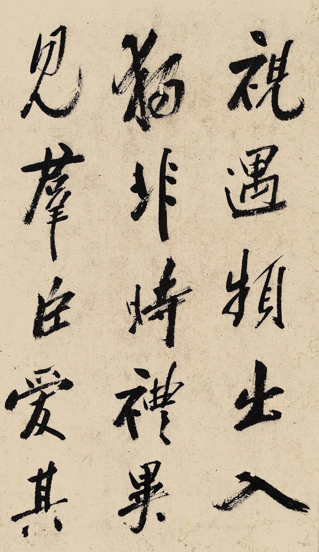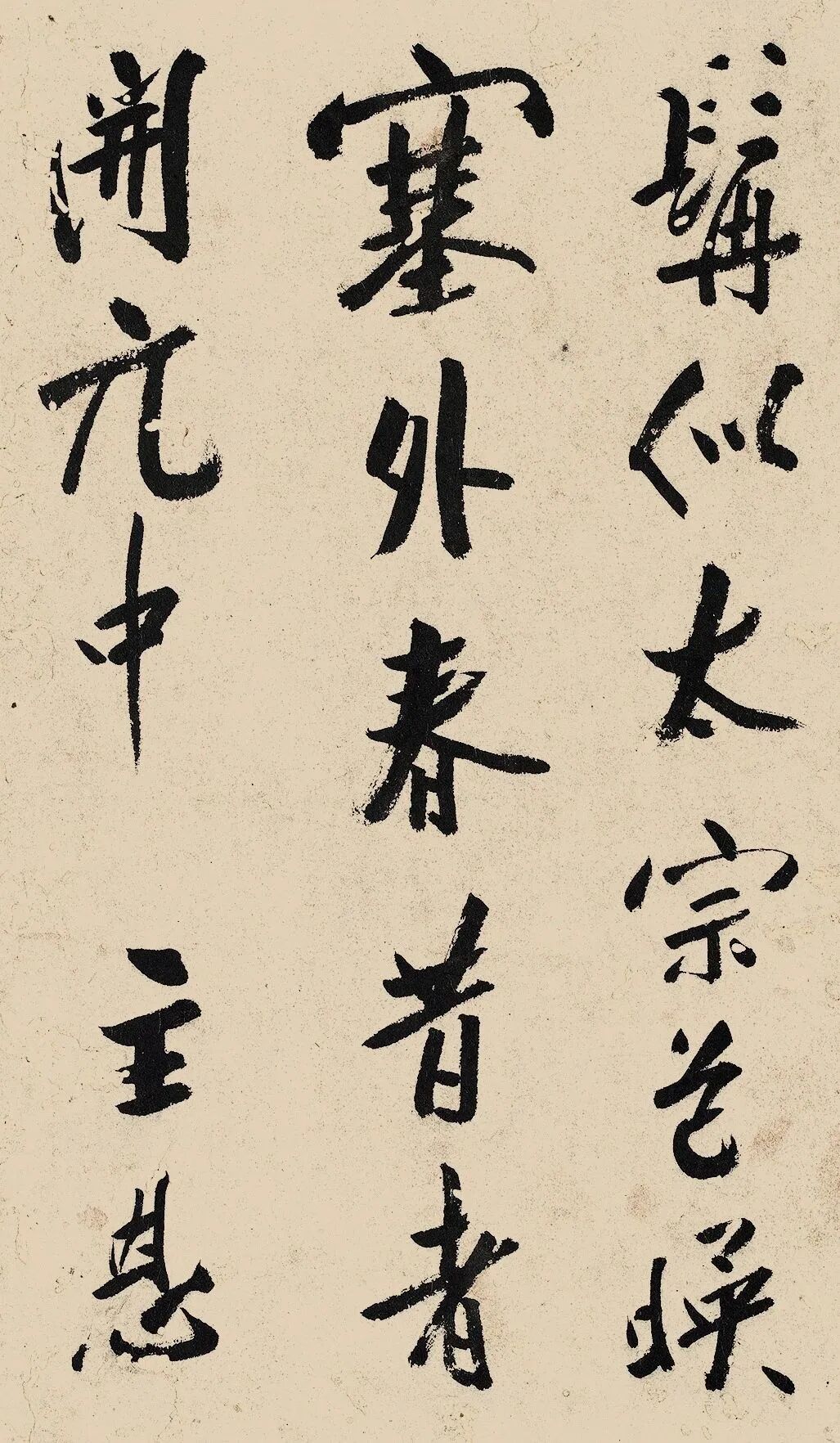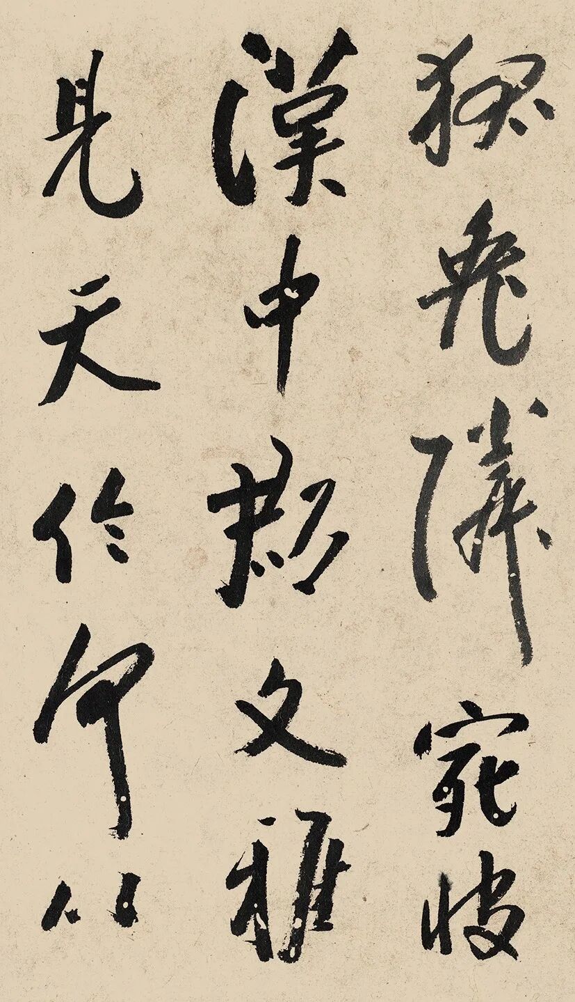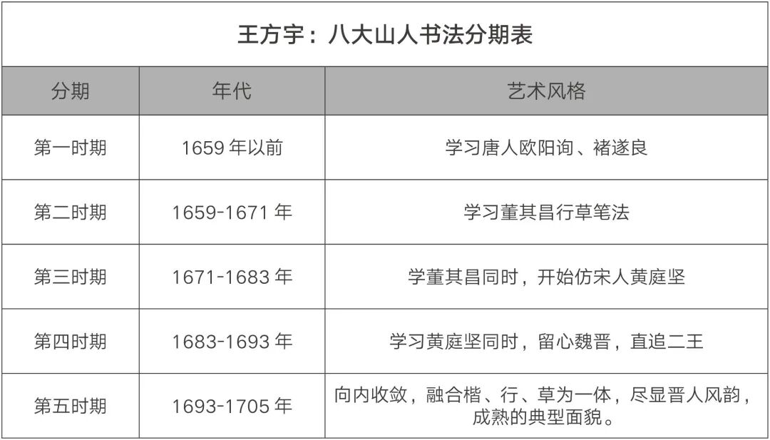 八大山人《行草<杜诗>册》(局部)八大山人传世的书法作品从最早己亥年(1659)三十四岁的《传綮写生册》起,至乙酉年(1705)八十岁的《醉翁吟》止,在其书风的发展过程中,通过对比八大山人书法作品笔法与结构的演变,比较多位学者专家的研究成果,我们以王方宇先生《八大山人作品的分期问题》一文的结论为标准,将八大山人书法划分为五个时期(图1)。五个时期以1683年为界限分为两大阶段,第一阶段有三个时期,即第一时期学欧阳询,第二时期学董其昌,第三时期学黄庭坚;第二阶段的两个时期又以癸酉年(1693)为界,之前为第四时期,之后为第五时期。本册八大山人《行草<杜诗>册》为王方宇先生所列八大山人书法创作第四时期的作品。按王方宇先生的分期法,八大山人书风的第一时期为1659年以前,第二时期为1659-1671年,第三时期为1671-1683年,第四时期为1683-1693年,第五时期为1693-1705年。各个时期典型代表作品,分述如下:第一时期台北故宫博物院藏八大山人1657年作《传綮写生册》(图2),为典型学习唐人欧阳询、褚遂良的书风代表。第二时期1657-1671年间,逐渐转向学习董其昌行草笔法,代表作参见故宫博物院藏有八大山人作《墨花图卷》题款部分(图3)。第三时期1671-1683年间,八大深得董其昌精髓的同时,开始仿宋人黄庭坚,用笔转为侧锋,结构开阔,字形倾斜。特别是上海博物馆藏其作于约1683年的《行书酒德颂卷》(图4),款有“仿山谷老人书”,为明确学习黄庭坚最有代表性的作品。除此之外,还有南昌八大山人纪念馆藏《自题个山小像》书法部分、上海博物馆藏八大山人《题夏雯看竹图》、启功先生藏《八大山人行草<瓮颂>》拓片(图5)等为代表。第四时期1683-1693年间,在学习黄庭坚书风的同时,八大山人一直留心魏晋,直追二王。董其昌、黄庭坚、二王三位一体,参杂楷书、行书、草书、章草笔意,形成了字形倾斜,结构开张,大小错落,简约复古的特点。代表作有启功先生藏《八大山人行草<爱梅述>》拓片(图6),石头书屋藏八大山人《行草乐苑卷》,故宫博物院藏八大山人《杂画册》草书对题部分(图7)、《草书卢鸿草堂诗册》(图8)、《行草西园雅集卷》(图9)以及本册《行草<杜诗>册》(图10)。第五时期1693-1705年间,经过前期不断地融合与探索,书风开始向内收敛,融合楷、行、草为一体,用笔由方转圆,结构趋于平稳,牵引连带,行气统一。尽显晋人风韵,开始走向成熟的典型面貌。此时期代表作品较多,不一一赘述。经过八大山人不断地仿古融合,求变创新,用笔上从圆到方,再从方到圆,结构上从平正到夸张,再从夸张到平正。穿插楷书、草书、章草、大草,以此循环往复,终成晚年个性鲜明的风格特征。