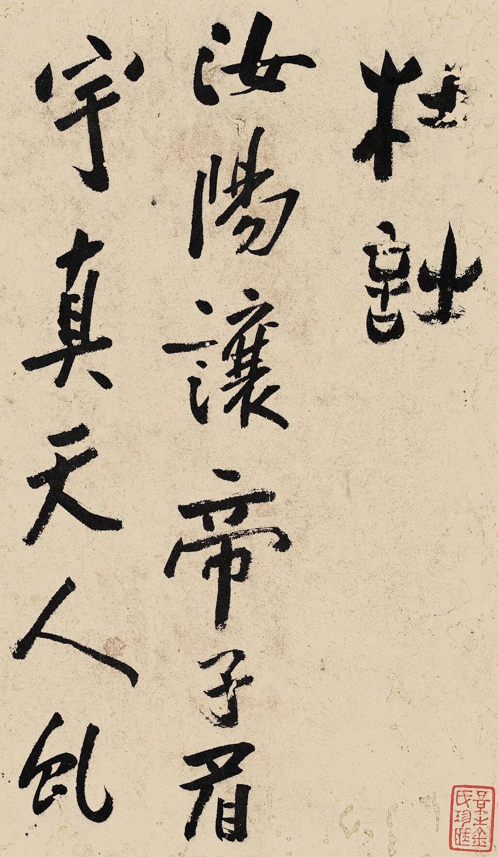 八大山人《行草<杜诗>册》(局部)所怀者李琎(?-750)字嗣恭,为睿宗孙,让皇帝李宪子。眉宇秀整,性谨洁,善射,与贺知章为诗酒之交。亦为“饮中八仙”之一。封汝阳郡王,历太仆卿。八大山人出自明太祖朱元璋第十七子改封藩地在南昌的“宁王”一支,身世与李琎有殊途同归之合;宁王朱权与兄长燕王朱棣共同发动“靖难之役”,燕王得以称帝,朱权有“让王”之贤;八大山人出宁藩“弋阳郡王”支,与李琎“汝阳郡王”仅有一字之差;宁王朱权改封南昌后“不乐藩封”而好学博古,旁通释老,尤精音律,工戏曲,与李琎雅好音乐,妙达音旨,有异曲同工之妙;八大山人是宁献王朱权九代之孙,故《个山小像》说“瀑泉流远故侯家”。![]()