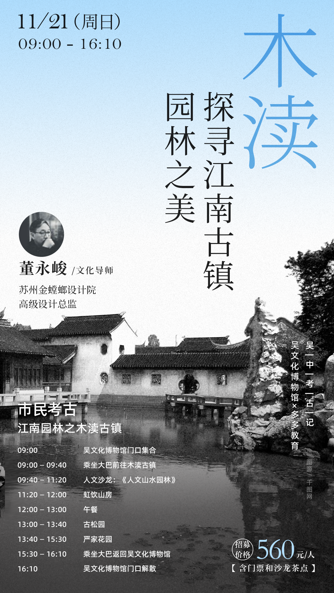 11月21日上午9:00,我们将一起走进木渎古镇,走访古镇中的私家园林,探寻江南古镇中的园林之美。