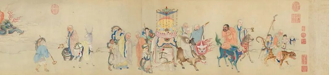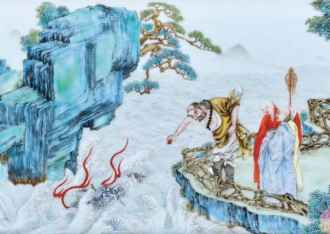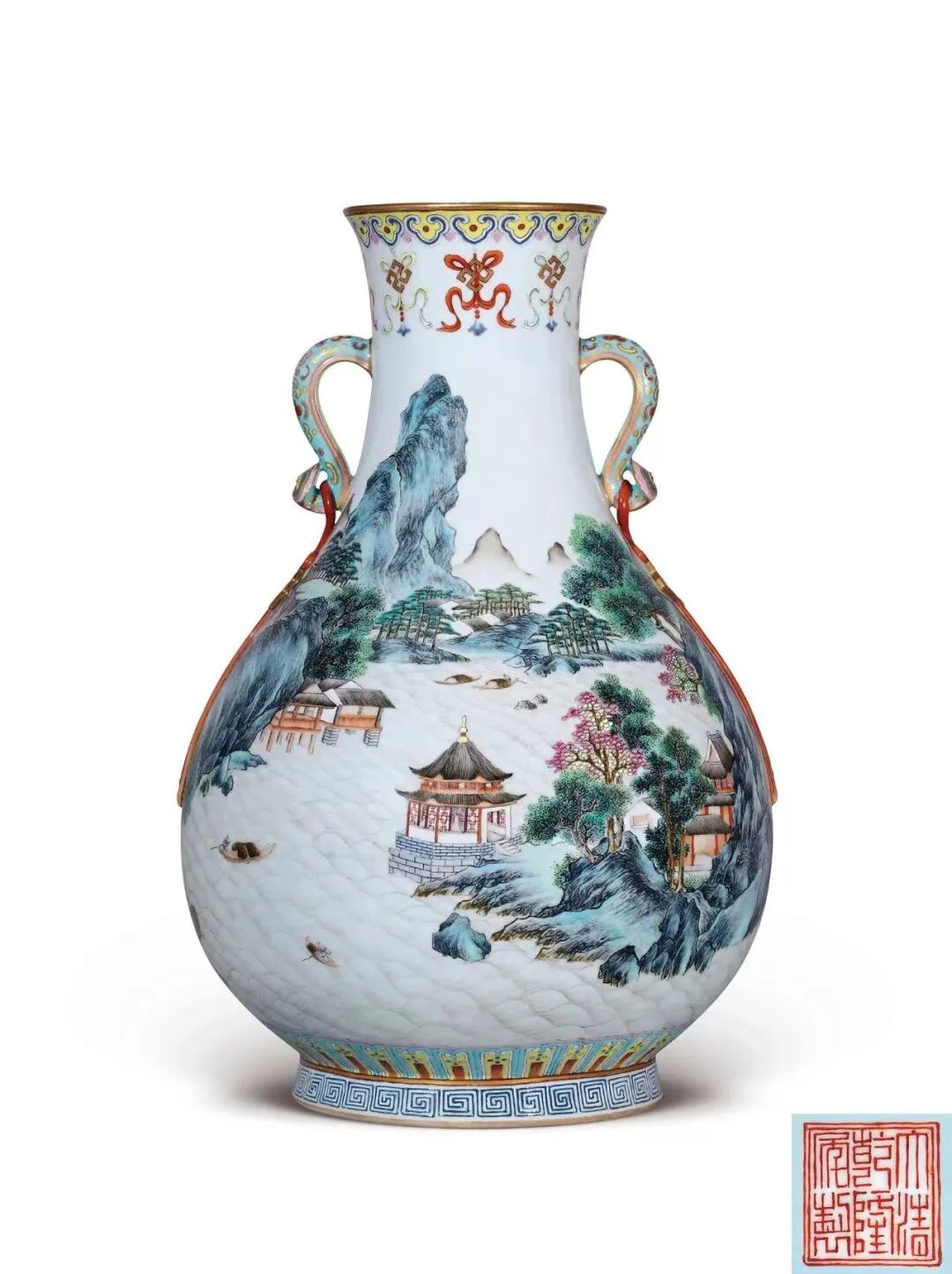 本品束颈两侧贴塑双龙耳,直筒鼓腹。颈、胫部施松石绿釉为地,以“锦上添花”技法锥剔花纹,其上以洋彩绘缠枝洋花纹,洋菊、百合、莲花层叠开敷,枝叶蔓丽婉转,大朵西番莲花心书团寿字,颈部中央一匝红地绘云蝠纹,寓意洪福齐天,福寿连绵,上承如意云头纹,下接方胜开光朵花纹及回纹,颈侧螭龙耳敷金描红,华贵非常。瓶腹外壁于白地上以洋彩绘通景十八罗汉图,山石嶙峋,古木参天,山花绽放,江水滔天,十八位罗汉神态动作各异,降龙、伏虎者夸张生动,沉思、静坐者闲逸自在,捧钵、执杵者描绘细腻,人物形象丰富,风景描绘秀丽,静中有动,动静结合,相互映衬。本品以洋彩绘通景十八罗汉图,神态动作各异,山水景致和谐,极为珍罕,展现艺匠画功,且全画早有腹稿,拉坯之前早已了然于胸,更见其造诣不凡。唐英善画,或由其本人直接画于器身、或由画师按其水墨画作绘于瓷器之上,现仍有带唐英款之乾隆早期珍品传世。从本瓶山水背景可见唐窑风范。乾隆时期罗汉画繁兴的主要原因,来自乾隆皇帝自身对佛教的信仰和对罗汉的崇拜。罗汉又称阿罗汉,为释迦牟尼的弟子,因其“不入涅槃,以神通力延寿命”,所以被人们视为神通广大和长寿的象征。唐代时主要流行十六罗汉,至宋代则开始盛行十八罗汉,此种增补或与中国传统文化中对十八的传统偏好有关。相类之乾隆年制瓷瓶,也多见中央绘人物图者,器形多样。如一对胭脂红地例,台北鸿禧美术馆收藏,载于James Spencer,《中国历代陶瓷选集》,鸿禧美术馆,台北,1990年,图版168;北京故宫博物院亦收藏两例,分别为胭脂红地及松石绿地,载于《故宫博物院藏文物珍品全集.珐琅彩.粉彩》,香港,1999年,图版128,以及《故宫珍藏康雍干瓷器图录》,前述出处,页353,图版34。