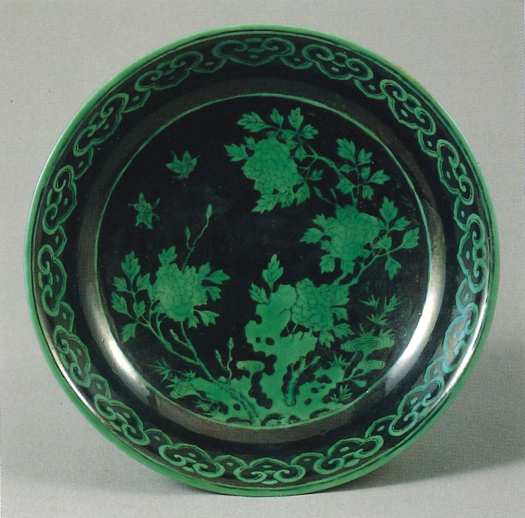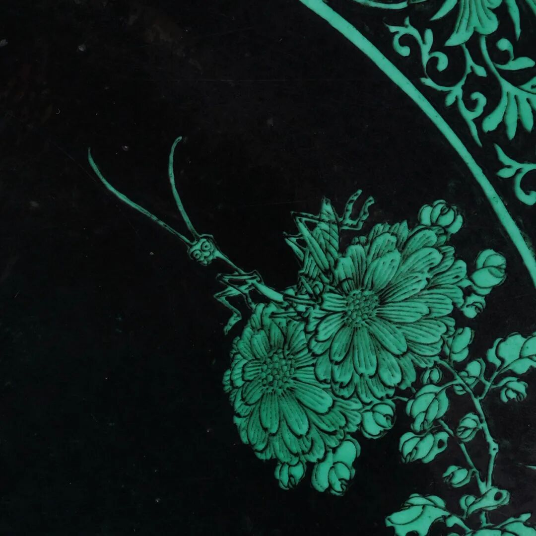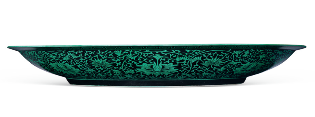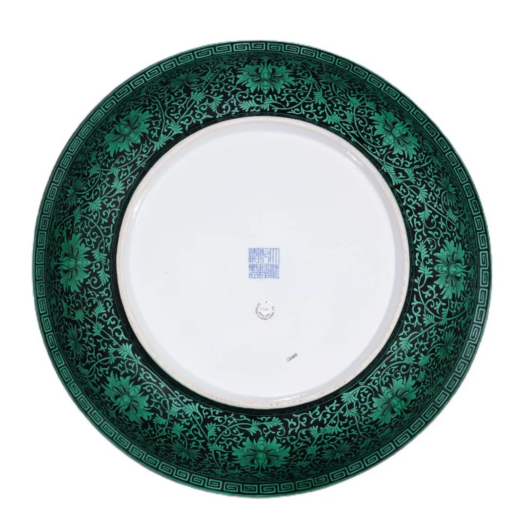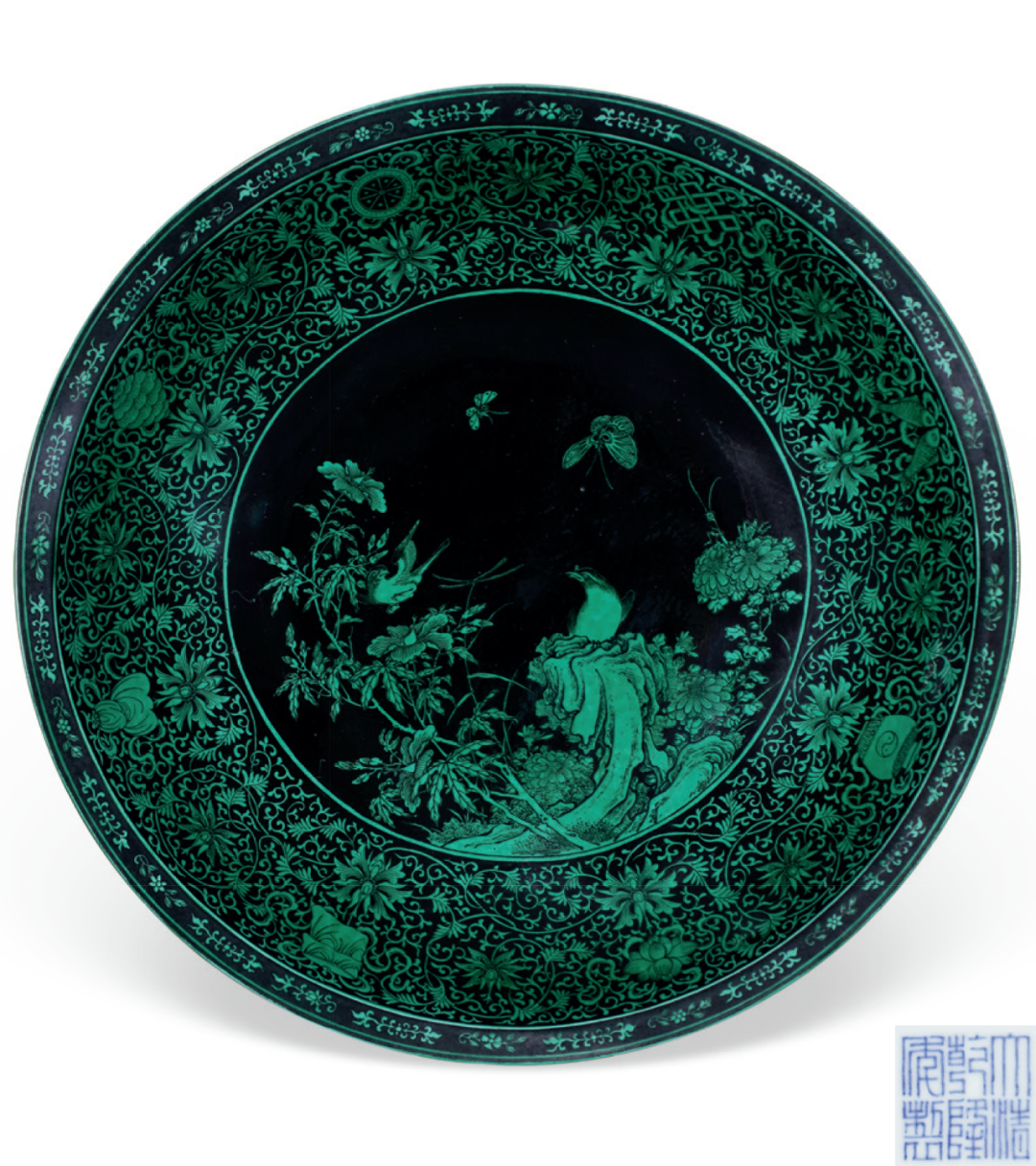 本品是为乾隆朝墨地绿彩瓷器寥寥可数的珍品之一,其体量巨大,为同类釉色装饰作品中传世所见最大一例。盘内与外心敷施墨彩为地,黑亮而匀净,盘壁一周缠枝花卉,并饰以八吉祥纹,画中洞石玲珑,上有花卉二枝横欹而出,在秋风的吹动下,枝干呈随风顺势倾斜。左边的两只喜鹊,一只展翅将坠于花蕊之上,正欲张嗉而鸣,另一只则遥遥相对,正欲抖翅。其画笔清秀细腻,构图颇得虚实之妙,实醉人心扉。当中洞石之绘画水平堪称乾隆御瓷之最,运笔苍劲,绘以细密的皴线体现出洞石的质感,又见玲珑之姿。底施白釉,正中书青花“大清乾隆年制”六字三行篆书款,圈足修整细腻。清乾隆 墨地绿彩“富贵白头”双喜图莲托八吉祥纹大盘本品尺寸之巨硕达47.7公分,其造型纹饰之隽美,绝无雍乾之类品所企及,疑为孤品。见有一18.3公分例,著录于《求知雅集-中国古陶瓷展》,香港中文大学文物馆,1981年,编号160,以蝶恋花为饰,画意与之较为舒朗;另有对乾隆例,整体延续了雍正之风,以天竺、水仙、洞石相结合,跃然纸上,尺寸较小为16.8公分,售于香港苏富比,1978年11月29日,编号363。另见有一梅瓶例,以缠枝花卉为饰,收藏于北京故宫博物院,著录于《故宫博物院藏文物真品大系·杂釉彩·素三彩》,页146,均可资参考。清乾隆 墨地绿彩“富贵白头”双喜图莲托八吉祥纹大盘查阅公私收藏,还见有一康熙葵瓣洗例,原为胡惠春旧藏,售于香港佳士得,1995年10月30日,编号721,由葛沃得购得,并著录于《佳士得二十周年回顾·中国瓷器及工艺品精选》,第187页,后售于香港佳士得,2010年12月1日,编号2814;见有一对雍正内绘过枝梅花,外壁八吉祥例,15.5公分,售于纽约佳士得,2000年9月21日,编号400,为香港望星楼收藏,另有一同等相似的类品为15.2公分,售自香港苏富比,1978年5月23日,编号164。《求知雅集-中国古陶瓷展》,香港中文大学文物馆,1981年,编号160