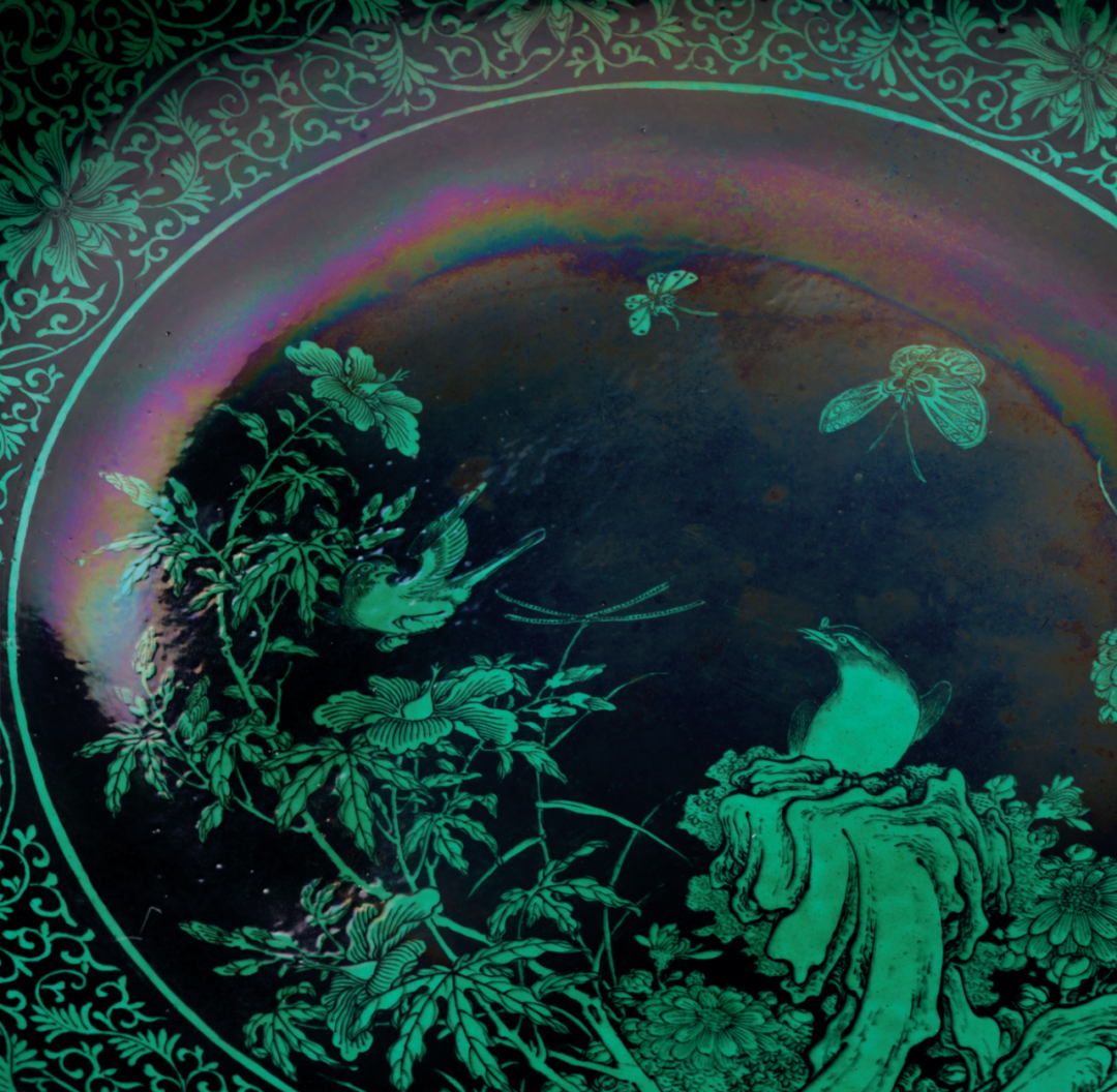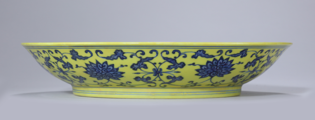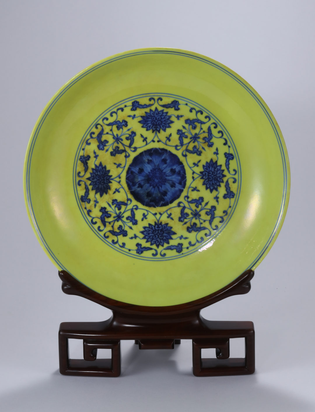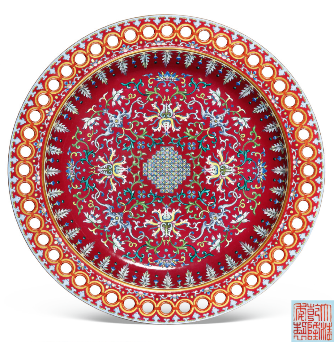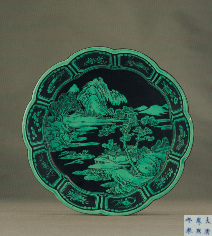 本品是为乾隆朝墨地绿彩瓷器寥寥可数的珍品之一,其体量巨大,为同类釉色装饰作品中传世所见最大一例。盘内与外心敷施墨彩为地,黑亮而匀净,盘壁一周缠枝花卉,并饰以八吉祥纹,画中洞石玲珑,上有花卉二枝横欹而出,在秋风的吹动下,枝干呈随风顺势倾斜。左边的两只喜鹊,一只展翅将坠于花蕊之上,正欲张嗉而鸣,另一只则遥遥相对,正欲抖翅。其画笔清秀细腻,构图颇得虚实之妙,实醉人心扉。当中洞石之绘画水平堪称乾隆御瓷之最,运笔苍劲,绘以细密的皴线体现出洞石的质感,又见玲珑之姿。底施白釉,正中书青花“大清乾隆年制”六字三行篆书款,圈足修整细腻。清乾隆 墨地绿彩“富贵白头”双喜图莲托八吉祥纹大盘本品尺寸之巨硕达47.7公分,其造型纹饰之隽美,绝无雍乾之类品所企及,疑为孤品。见有一18.3公分例,著录于《求知雅集-中国古陶瓷展》,香港中文大学文物馆,1981年,编号160,以蝶恋花为饰,画意与之较为舒朗;另有对乾隆例,整体延续了雍正之风,以天竺、水仙、洞石相结合,跃然纸上,尺寸较小为16.8公分,售于香港苏富比,1978年11月29日,编号363。另见有一梅瓶例,以缠枝花卉为饰,收藏于北京故宫博物院,著录于《故宫博物院藏文物真品大系·杂釉彩·素三彩》,页146,均可资参考。清乾隆 墨地绿彩“富贵白头”双喜图莲托八吉祥纹大盘查阅公私收藏,还见有一康熙葵瓣洗例,原为胡惠春旧藏,售于香港佳士得,1995年10月30日,编号721,由葛沃得购得,并著录于《佳士得二十周年回顾·中国瓷器及工艺品精选》,第187页,后售于香港佳士得,2010年12月1日,编号2814;见有一对雍正内绘过枝梅花,外壁八吉祥例,15.5公分,售于纽约佳士得,2000年9月21日,编号400,为香港望星楼收藏,另有一同等相似的类品为15.2公分,售自香港苏富比,1978年5月23日,编号164。《求知雅集-中国古陶瓷展》,香港中文大学文物馆,1981年,编号160