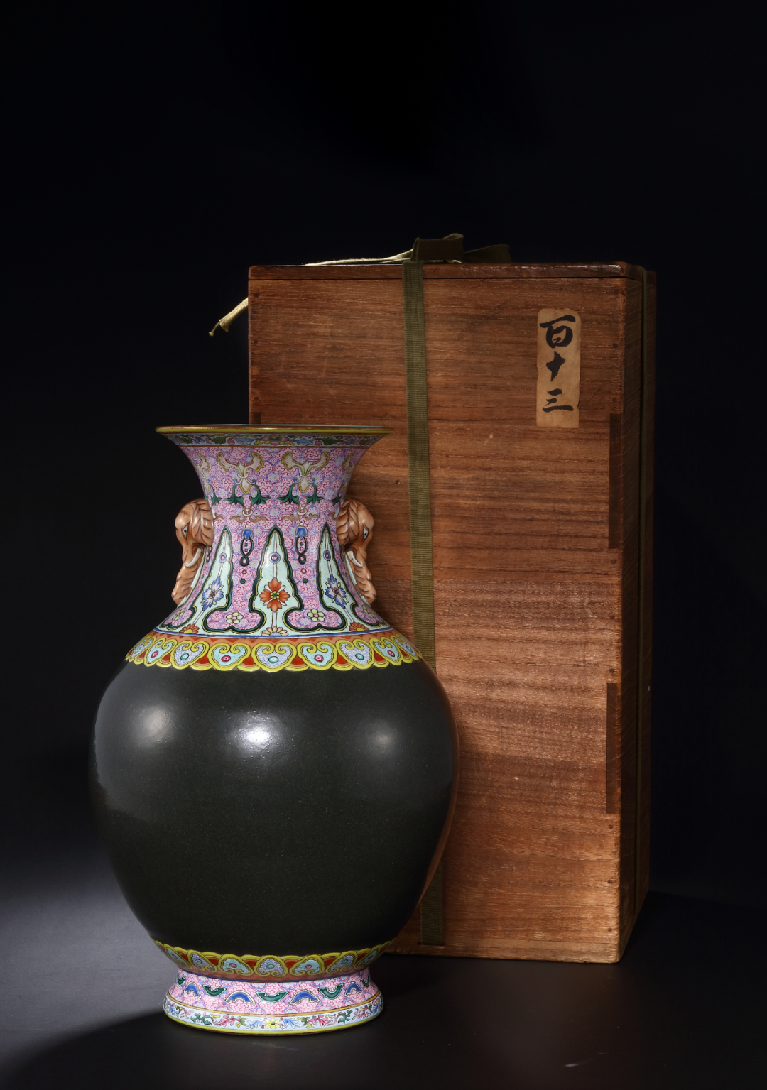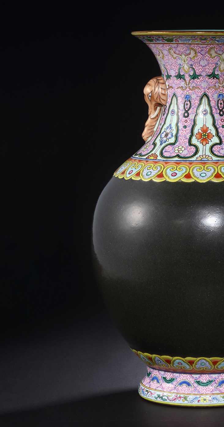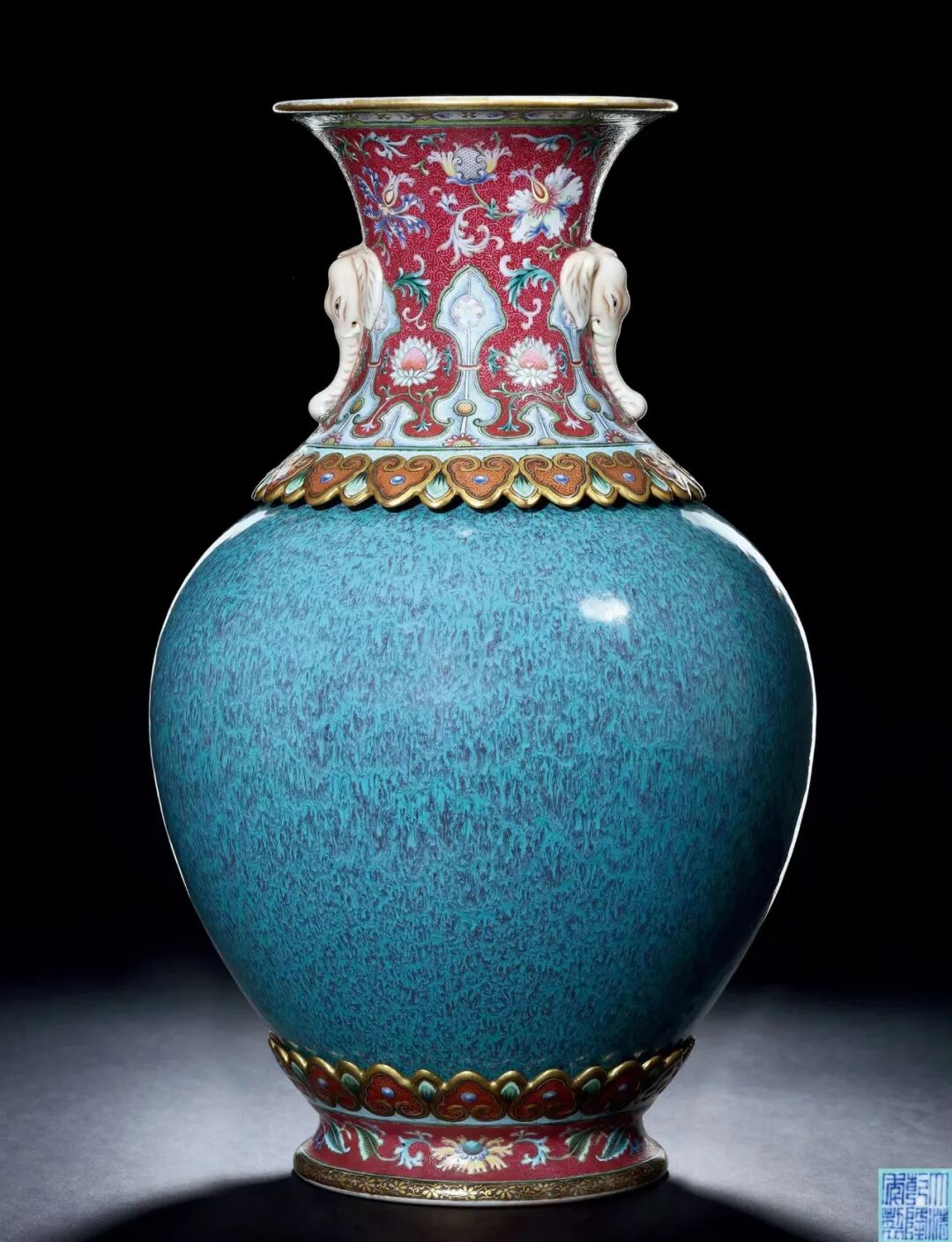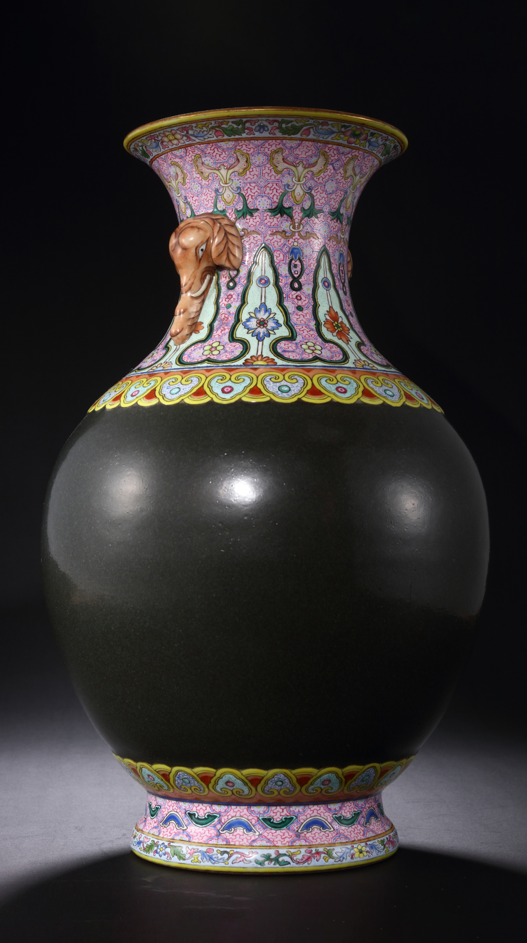 乾隆时期国力昌盛,故此时期烧造的佳器不惜工本,并以奢华著称,更兼有西洋装饰元素,技术之高超,空前绝后,堪称中国彩瓷之巅峰时代。以洋彩搭配茶叶末釉的本器正是工艺繁复的创新之作。颈部以胭脂红彩料为地,精心绘制的锦地细致且华美;其上衬独具西洋韵味的缠枝花卉并蝶纹,用色及纹饰精美至极,为典型的锦上添花技法。主体所施单色釉为厂官釉,俗称茶叶末釉。《南窑笔记》载:“(厂官窑)其色有鳝鱼黄、油绿、紫金诸色,出自直隶厂窑所烧,故名。多缸、钵之类,釉泽苍古,配合诸窑另成一家。今仿造者用紫金杂釉,白土配合,胜于旧窑”。文中所指胜于旧窑者,正是本器所属的清代本朝作品。当时为清代御窑厂所制的宫廷专属釉色,仅供皇室珍赏。至雍正更为看重,乾隆时期最为精纯。据乾隆八年闰四月二十一日《宫中档案朱砒奏折.唐英奏恭进奉发及新拟瓷器折》中唐英所言:“其新拟各种,系奴才愚昧之见,自行创造,恐未合式,且工料不无过费,故未敢多造。伏祈皇上教导改正,以便钦遵,再行成对。”可知,唐英在创制新款瓷器时,由于制瓷成本昂贵,必定先行制作瓷样供于乾隆,等待圣意确定后,再定夺后续。北京保利拍卖,2018年12月08日,编号5421此品底款为红彩“大清乾隆年制”六字篆书款,与北京保利18年秋拍一件“清乾隆 御制洋彩江山万代如意耳琵琶尊”红彩底款十分相似,以兹参考。据清宫档案载,光绪年间,“霁红、厂官……等釉均系父传子受,秘示外人”,可见清朝历代虽均见茶叶末器,但仅有个别家族掌握其釉料配方,父承子继,配方秘不示人,烧造也并非易事。本器之茶叶末釉釉色较为深沉,更显古雅肃穆,其衬托之下,器身上下之洋彩绘制愈发鲜丽明艳。右图:清乾隆磁胎画珐琅锦上添花绿地酒钟台北故宫博物院藏其颈部锦地纹样与台北故宫博物院藏“清乾隆磁胎画珐琅锦上添花绿地酒钟”相仿,其设计或有相互借鉴之处。![]()