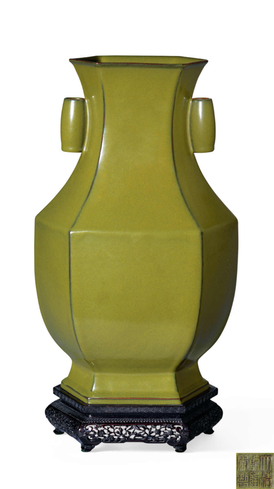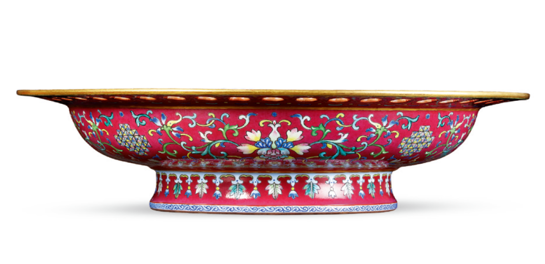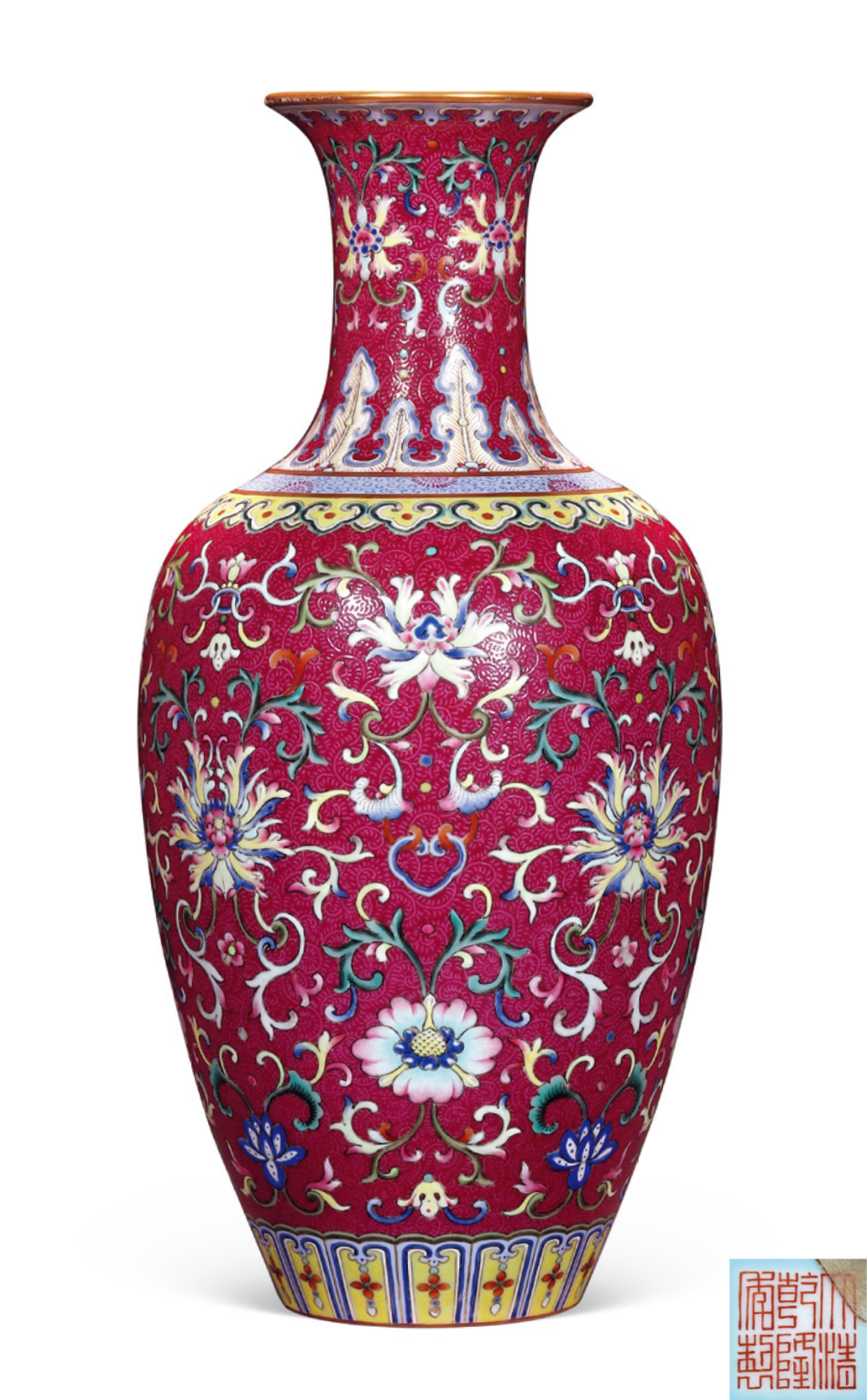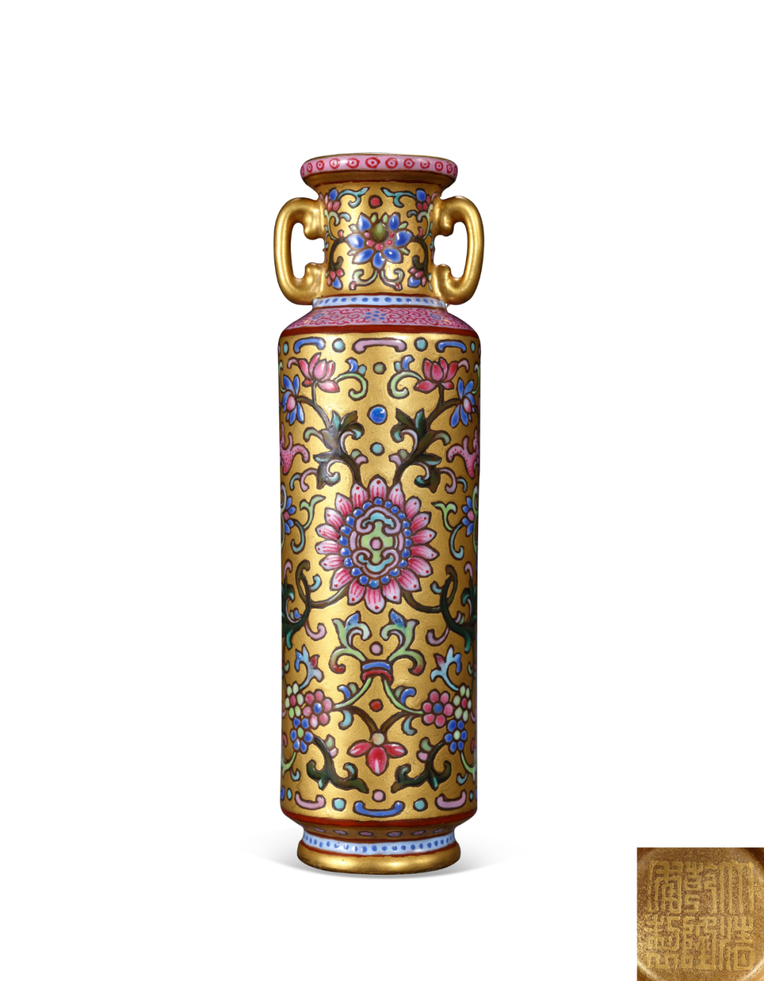 乾隆时期国力昌盛,故此时期烧造的佳器不惜工本,并以奢华著称,更兼有西洋装饰元素,技术之高超,空前绝后,堪称中国彩瓷之巅峰时代。以洋彩搭配茶叶末釉的本器正是工艺繁复的创新之作。颈部以胭脂红彩料为地,精心绘制的锦地细致且华美;其上衬独具西洋韵味的缠枝花卉并蝶纹,用色及纹饰精美至极,为典型的锦上添花技法。主体所施单色釉为厂官釉,俗称茶叶末釉。《南窑笔记》载:“(厂官窑)其色有鳝鱼黄、油绿、紫金诸色,出自直隶厂窑所烧,故名。多缸、钵之类,釉泽苍古,配合诸窑另成一家。今仿造者用紫金杂釉,白土配合,胜于旧窑”。文中所指胜于旧窑者,正是本器所属的清代本朝作品。当时为清代御窑厂所制的宫廷专属釉色,仅供皇室珍赏。至雍正更为看重,乾隆时期最为精纯。据乾隆八年闰四月二十一日《宫中档案朱砒奏折.唐英奏恭进奉发及新拟瓷器折》中唐英所言:“其新拟各种,系奴才愚昧之见,自行创造,恐未合式,且工料不无过费,故未敢多造。伏祈皇上教导改正,以便钦遵,再行成对。”可知,唐英在创制新款瓷器时,由于制瓷成本昂贵,必定先行制作瓷样供于乾隆,等待圣意确定后,再定夺后续。北京保利拍卖,2018年12月08日,编号5421此品底款为红彩“大清乾隆年制”六字篆书款,与北京保利18年秋拍一件“清乾隆 御制洋彩江山万代如意耳琵琶尊”红彩底款十分相似,以兹参考。据清宫档案载,光绪年间,“霁红、厂官……等釉均系父传子受,秘示外人”,可见清朝历代虽均见茶叶末器,但仅有个别家族掌握其釉料配方,父承子继,配方秘不示人,烧造也并非易事。本器之茶叶末釉釉色较为深沉,更显古雅肃穆,其衬托之下,器身上下之洋彩绘制愈发鲜丽明艳。右图:清乾隆磁胎画珐琅锦上添花绿地酒钟台北故宫博物院藏其颈部锦地纹样与台北故宫博物院藏“清乾隆磁胎画珐琅锦上添花绿地酒钟”相仿,其设计或有相互借鉴之处。![]()
