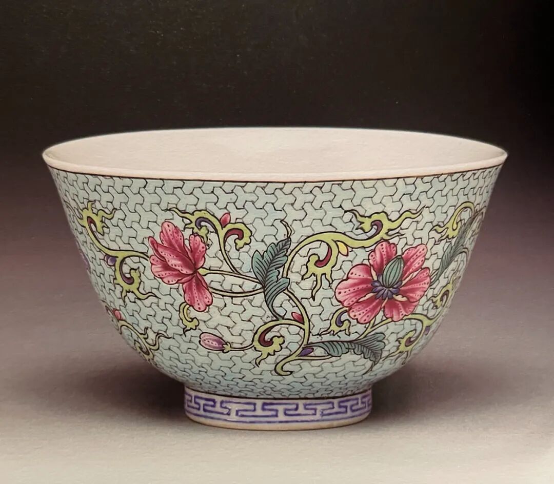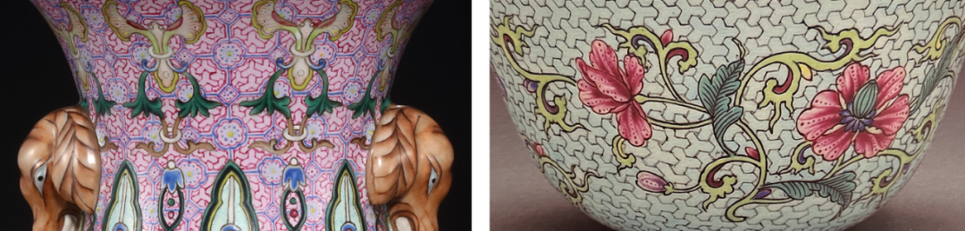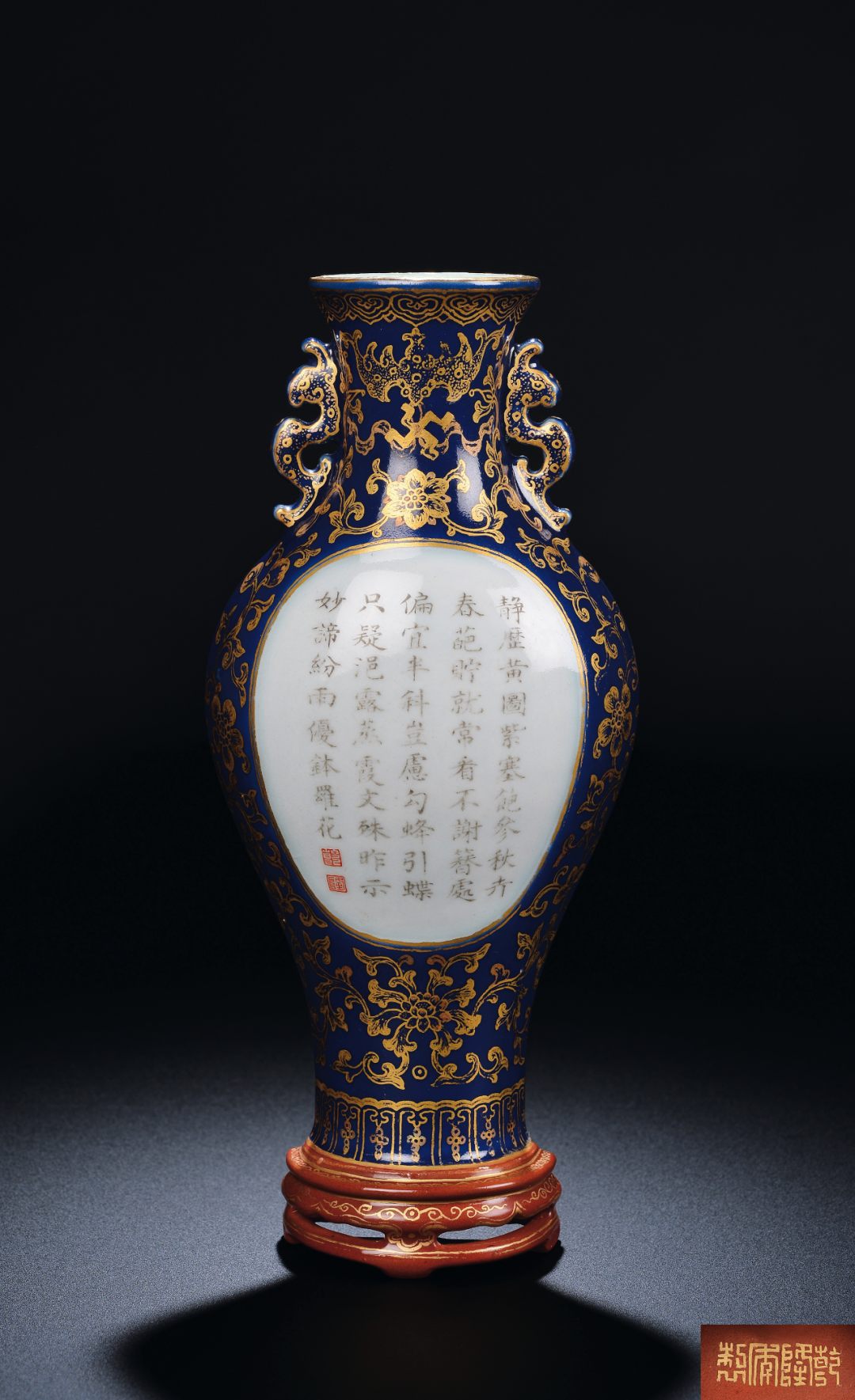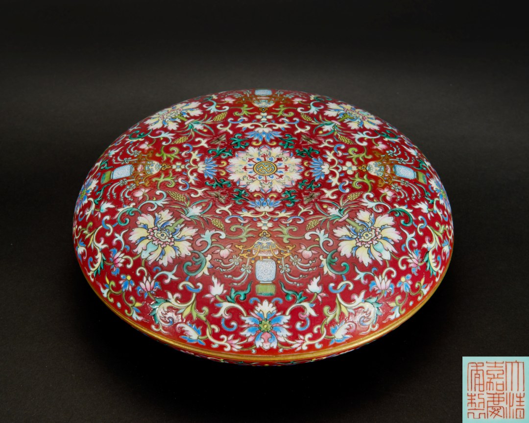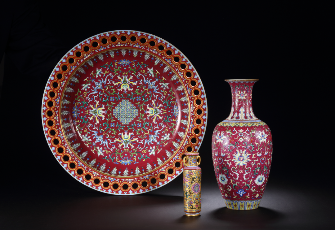 乾隆时期国力昌盛,故此时期烧造的佳器不惜工本,并以奢华著称,更兼有西洋装饰元素,技术之高超,空前绝后,堪称中国彩瓷之巅峰时代。以洋彩搭配茶叶末釉的本器正是工艺繁复的创新之作。颈部以胭脂红彩料为地,精心绘制的锦地细致且华美;其上衬独具西洋韵味的缠枝花卉并蝶纹,用色及纹饰精美至极,为典型的锦上添花技法。主体所施单色釉为厂官釉,俗称茶叶末釉。《南窑笔记》载:“(厂官窑)其色有鳝鱼黄、油绿、紫金诸色,出自直隶厂窑所烧,故名。多缸、钵之类,釉泽苍古,配合诸窑另成一家。今仿造者用紫金杂釉,白土配合,胜于旧窑”。文中所指胜于旧窑者,正是本器所属的清代本朝作品。当时为清代御窑厂所制的宫廷专属釉色,仅供皇室珍赏。至雍正更为看重,乾隆时期最为精纯。据乾隆八年闰四月二十一日《宫中档案朱砒奏折.唐英奏恭进奉发及新拟瓷器折》中唐英所言:“其新拟各种,系奴才愚昧之见,自行创造,恐未合式,且工料不无过费,故未敢多造。伏祈皇上教导改正,以便钦遵,再行成对。”可知,唐英在创制新款瓷器时,由于制瓷成本昂贵,必定先行制作瓷样供于乾隆,等待圣意确定后,再定夺后续。北京保利拍卖,2018年12月08日,编号5421此品底款为红彩“大清乾隆年制”六字篆书款,与北京保利18年秋拍一件“清乾隆 御制洋彩江山万代如意耳琵琶尊”红彩底款十分相似,以兹参考。据清宫档案载,光绪年间,“霁红、厂官……等釉均系父传子受,秘示外人”,可见清朝历代虽均见茶叶末器,但仅有个别家族掌握其釉料配方,父承子继,配方秘不示人,烧造也并非易事。本器之茶叶末釉釉色较为深沉,更显古雅肃穆,其衬托之下,器身上下之洋彩绘制愈发鲜丽明艳。右图:清乾隆磁胎画珐琅锦上添花绿地酒钟台北故宫博物院藏其颈部锦地纹样与台北故宫博物院藏“清乾隆磁胎画珐琅锦上添花绿地酒钟”相仿,其设计或有相互借鉴之处。![]()