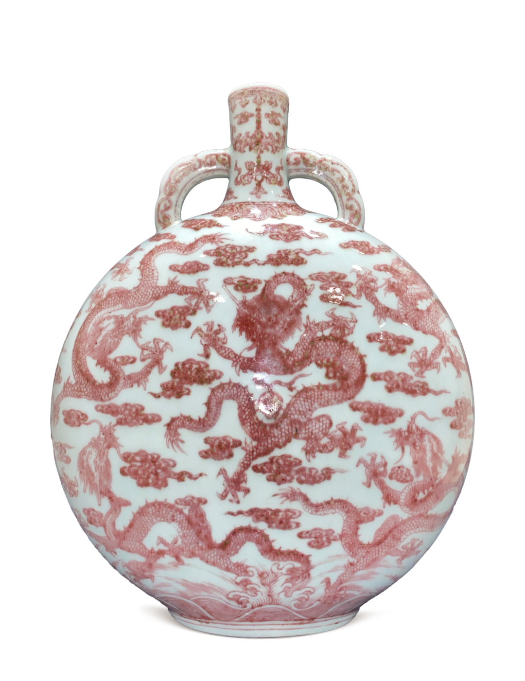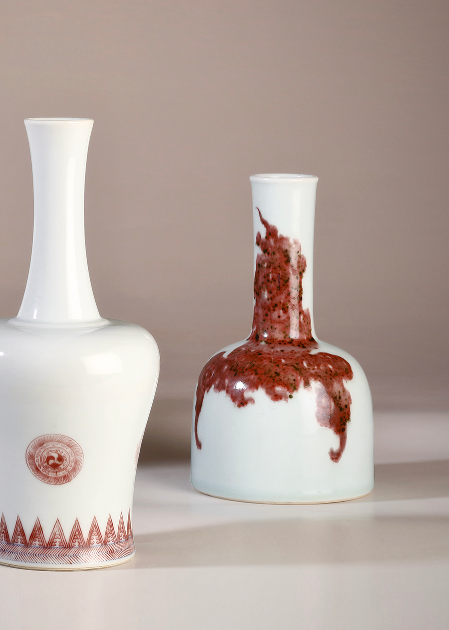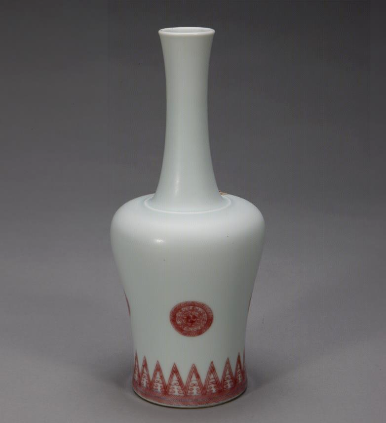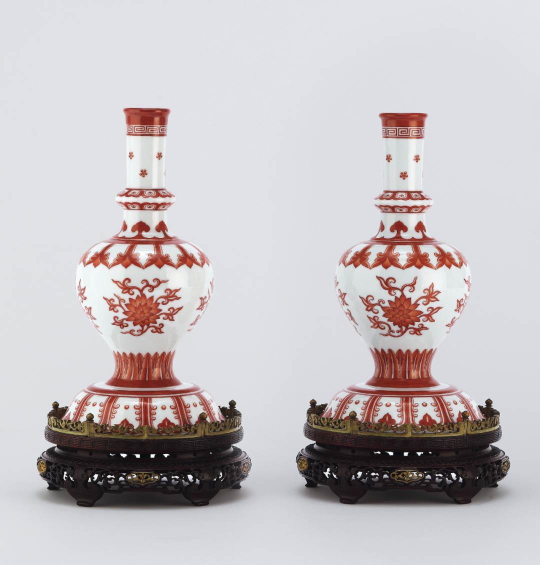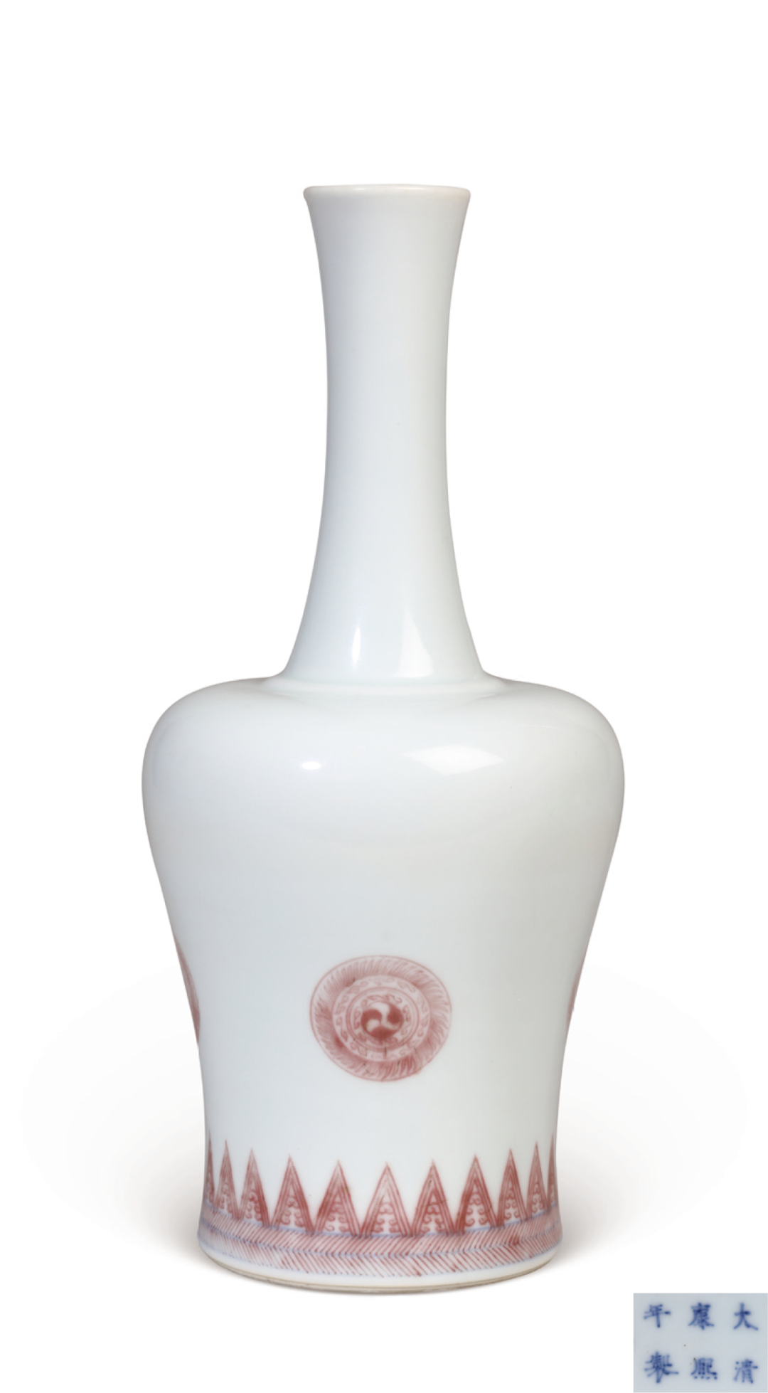 本品小口微撇,颈部细长,丰肩敛腹,腹部造型酷似梅瓶,底部略外展,平底浅圈足。本品为康熙时期景德镇官窑的创新样式,与北宋时期定窑烧造的佛教供奉之器——凈瓶形似,又与蒙藏地区的白塔颇为相似,反映出皇帝对于藏传佛教之虔诚信仰,为康熙朝独有,见有青花、青花釉里红和釉下三彩等三个品种,素为瓷中贵胄。底以青花书“大清康熙年制”六字三行楷书款。因其外形颇似藏传佛教的佛塔,光緖十四年二月二十日立《总管连英传运取陈设档》中录:「光緖十四年,上要如意洲分下金山观陈设档一本内:……六百二十二:红花白地瓷塔式瓶一件……。」及宣统二年五月初六日立《春字瓷器陈设账二册》中所载:「……九百五十九号:白地紫花瓷塔式瓶一件;……九百六十二号:青花白地瓷塔式瓶一件……」,或为本品此类器之清宫陈设、贮藏记录。此器腹部造型及纹饰取材商周青铜器,《宣和博古图》中刊录一件「周山纹錞」,与之极为相似,应为其蓝本原型。錞,为古代一种铜制的军乐器,形如圆筒,上大下小,顶上常做虎钮,可悬挂,常与鼓配合,用于战争中指挥进退。拍品撷取「錞」之式样作为腹部,釉里红描绘的漩涡状团花纹及胫部绘饰一周青花釉里红锯齿状纹样亦与「周山纹錞」上的纹饰如出一辙。其上设长颈,令整体造型形似摇铃,又近似佛塔。全器跨出材质本身的限制性,以瓷釉仿铜器而烧造,鉴古而求新,可谓匠心独具,堪称绝品。本品或与康熙朝名品柳叶瓶、莱菔尊等御用瓷器同为刘源设计。他与臧应选共同发展了康熙御窑瓷器,开创了与明代不同的风格,缔造了康熙官瓷的多样化与当朝特色。