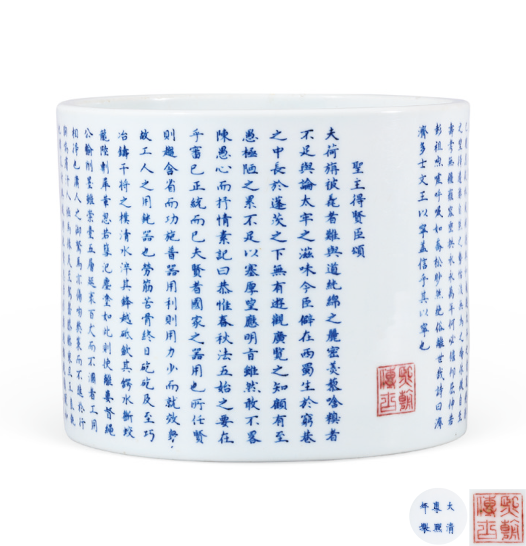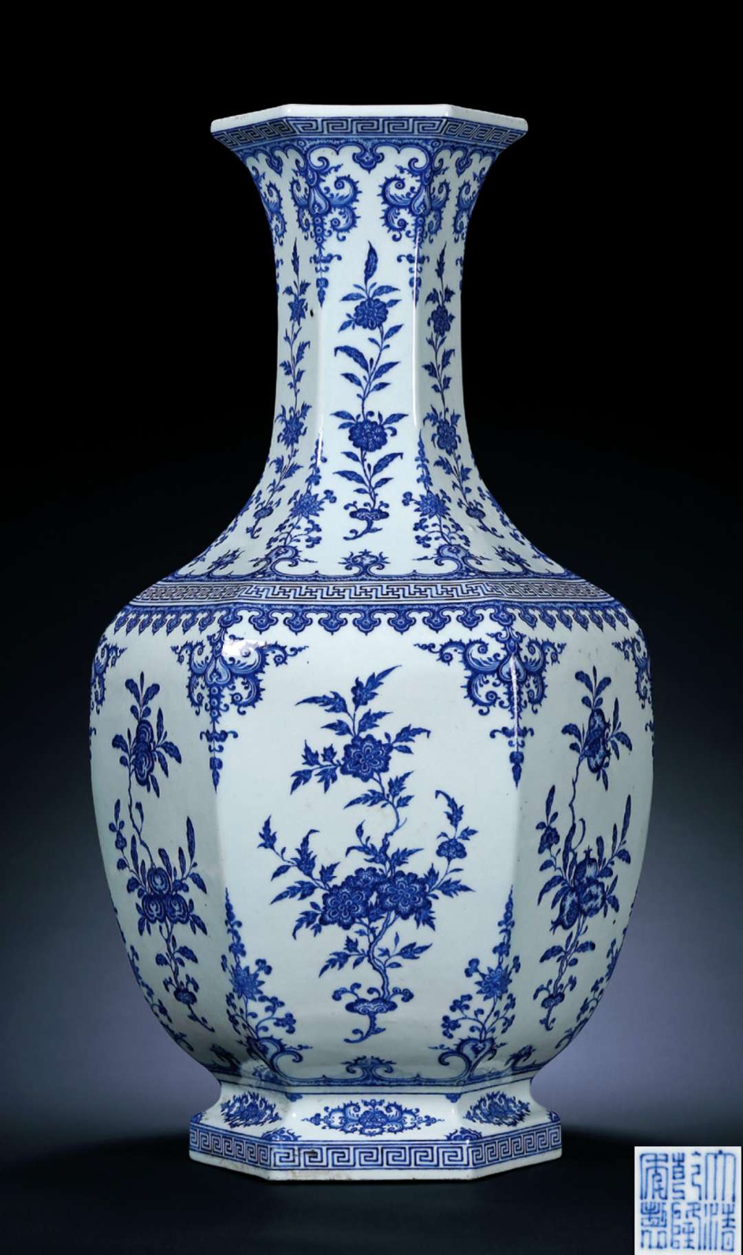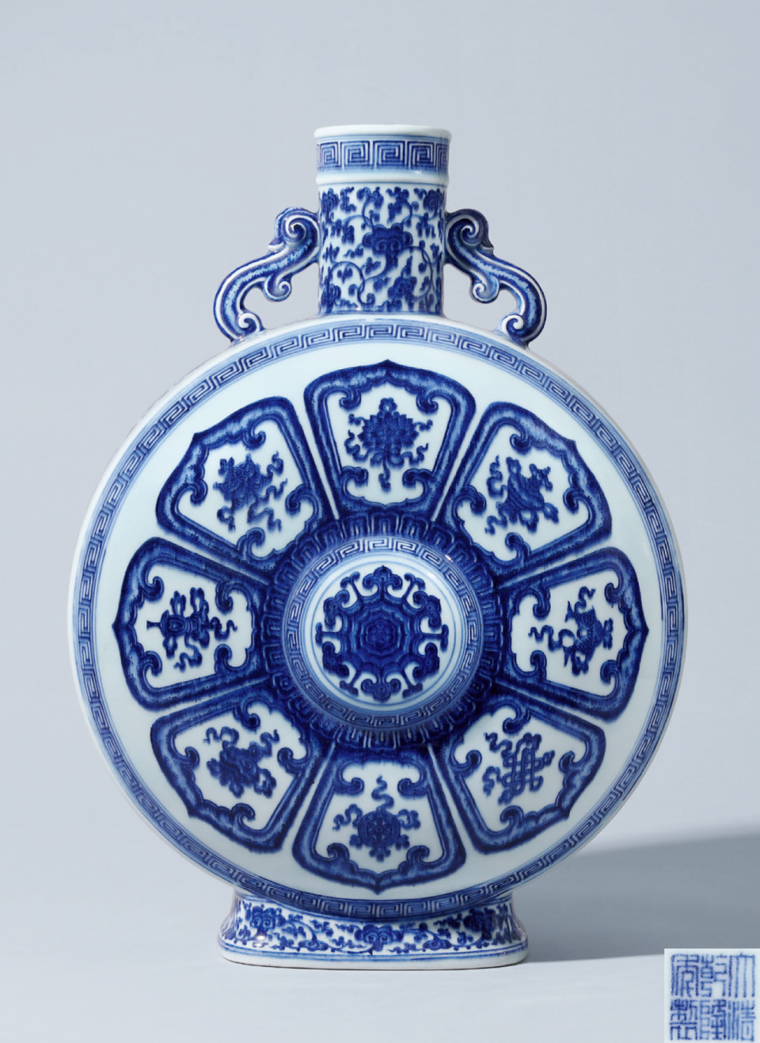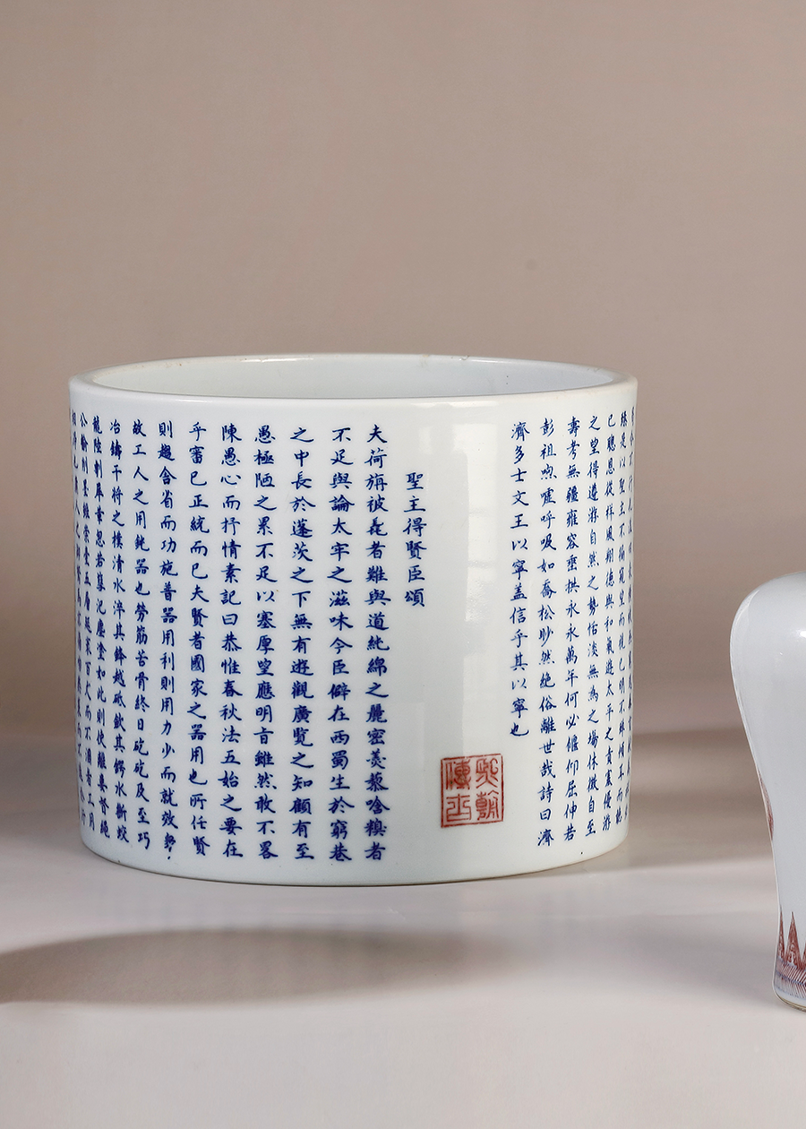 本品小口微撇,颈部细长,丰肩敛腹,腹部造型酷似梅瓶,底部略外展,平底浅圈足。本品为康熙时期景德镇官窑的创新样式,与北宋时期定窑烧造的佛教供奉之器——凈瓶形似,又与蒙藏地区的白塔颇为相似,反映出皇帝对于藏传佛教之虔诚信仰,为康熙朝独有,见有青花、青花釉里红和釉下三彩等三个品种,素为瓷中贵胄。底以青花书“大清康熙年制”六字三行楷书款。因其外形颇似藏传佛教的佛塔,光緖十四年二月二十日立《总管连英传运取陈设档》中录:「光緖十四年,上要如意洲分下金山观陈设档一本内:……六百二十二:红花白地瓷塔式瓶一件……。」及宣统二年五月初六日立《春字瓷器陈设账二册》中所载:「……九百五十九号:白地紫花瓷塔式瓶一件;……九百六十二号:青花白地瓷塔式瓶一件……」,或为本品此类器之清宫陈设、贮藏记录。此器腹部造型及纹饰取材商周青铜器,《宣和博古图》中刊录一件「周山纹錞」,与之极为相似,应为其蓝本原型。錞,为古代一种铜制的军乐器,形如圆筒,上大下小,顶上常做虎钮,可悬挂,常与鼓配合,用于战争中指挥进退。拍品撷取「錞」之式样作为腹部,釉里红描绘的漩涡状团花纹及胫部绘饰一周青花釉里红锯齿状纹样亦与「周山纹錞」上的纹饰如出一辙。其上设长颈,令整体造型形似摇铃,又近似佛塔。全器跨出材质本身的限制性,以瓷釉仿铜器而烧造,鉴古而求新,可谓匠心独具,堪称绝品。本品或与康熙朝名品柳叶瓶、莱菔尊等御用瓷器同为刘源设计。他与臧应选共同发展了康熙御窑瓷器,开创了与明代不同的风格,缔造了康熙官瓷的多样化与当朝特色。