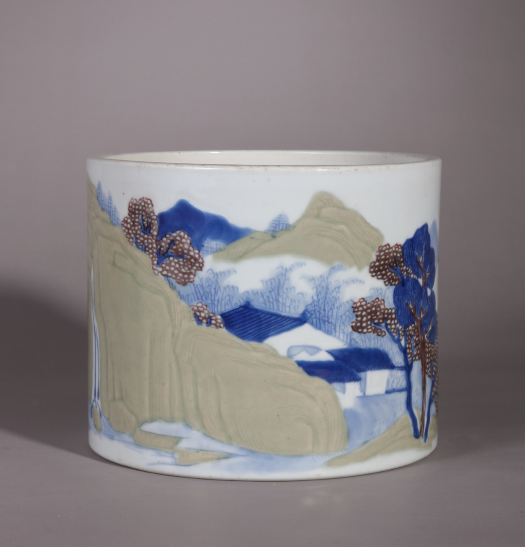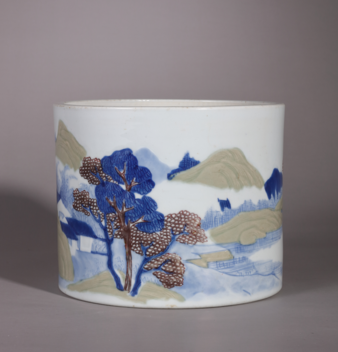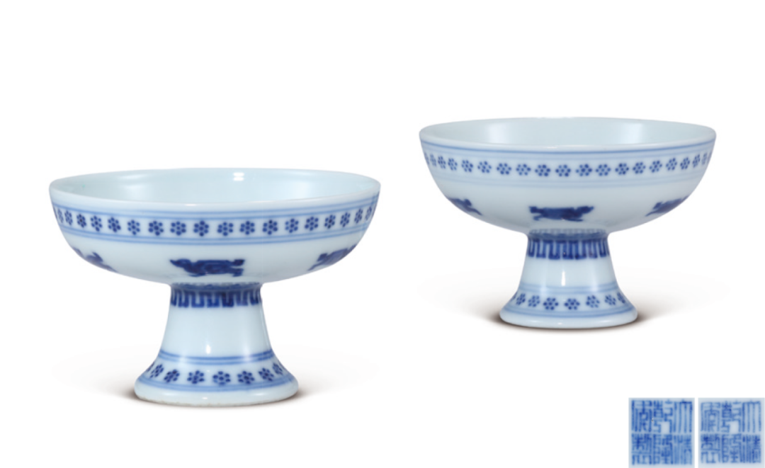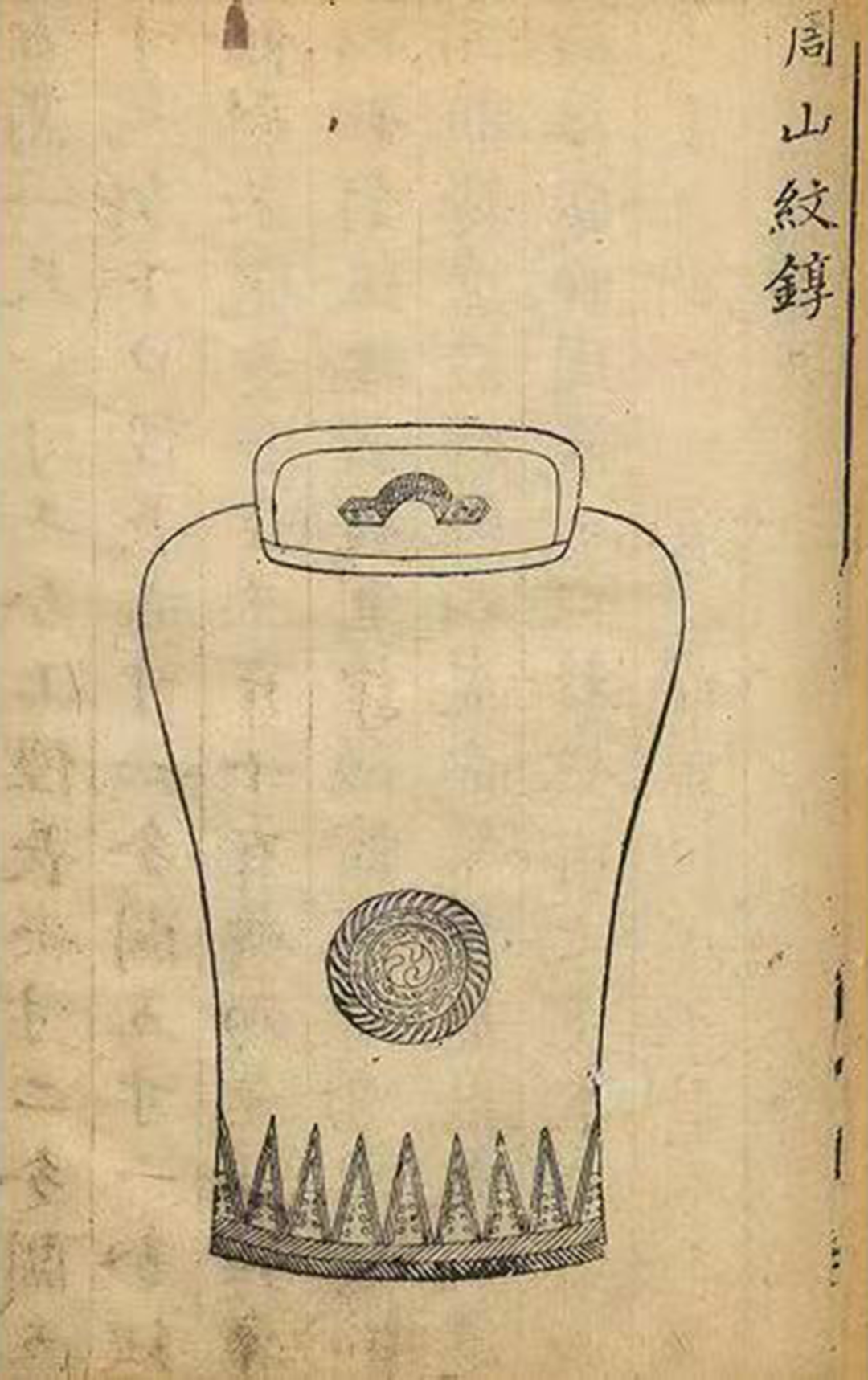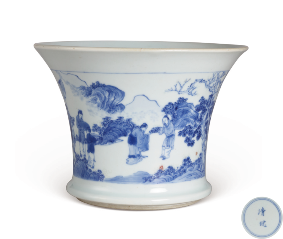 本品小口微撇,颈部细长,丰肩敛腹,腹部造型酷似梅瓶,底部略外展,平底浅圈足。本品为康熙时期景德镇官窑的创新样式,与北宋时期定窑烧造的佛教供奉之器——凈瓶形似,又与蒙藏地区的白塔颇为相似,反映出皇帝对于藏传佛教之虔诚信仰,为康熙朝独有,见有青花、青花釉里红和釉下三彩等三个品种,素为瓷中贵胄。底以青花书“大清康熙年制”六字三行楷书款。因其外形颇似藏传佛教的佛塔,光緖十四年二月二十日立《总管连英传运取陈设档》中录:「光緖十四年,上要如意洲分下金山观陈设档一本内:……六百二十二:红花白地瓷塔式瓶一件……。」及宣统二年五月初六日立《春字瓷器陈设账二册》中所载:「……九百五十九号:白地紫花瓷塔式瓶一件;……九百六十二号:青花白地瓷塔式瓶一件……」,或为本品此类器之清宫陈设、贮藏记录。此器腹部造型及纹饰取材商周青铜器,《宣和博古图》中刊录一件「周山纹錞」,与之极为相似,应为其蓝本原型。錞,为古代一种铜制的军乐器,形如圆筒,上大下小,顶上常做虎钮,可悬挂,常与鼓配合,用于战争中指挥进退。拍品撷取「錞」之式样作为腹部,釉里红描绘的漩涡状团花纹及胫部绘饰一周青花釉里红锯齿状纹样亦与「周山纹錞」上的纹饰如出一辙。其上设长颈,令整体造型形似摇铃,又近似佛塔。全器跨出材质本身的限制性,以瓷釉仿铜器而烧造,鉴古而求新,可谓匠心独具,堪称绝品。本品或与康熙朝名品柳叶瓶、莱菔尊等御用瓷器同为刘源设计。他与臧应选共同发展了康熙御窑瓷器,开创了与明代不同的风格,缔造了康熙官瓷的多样化与当朝特色。