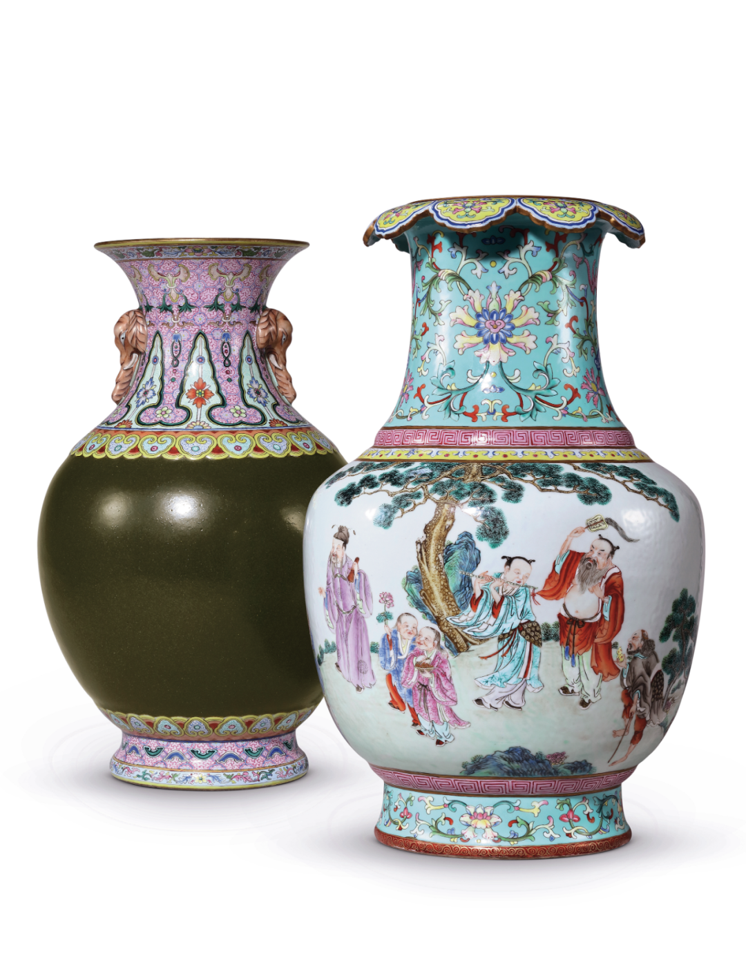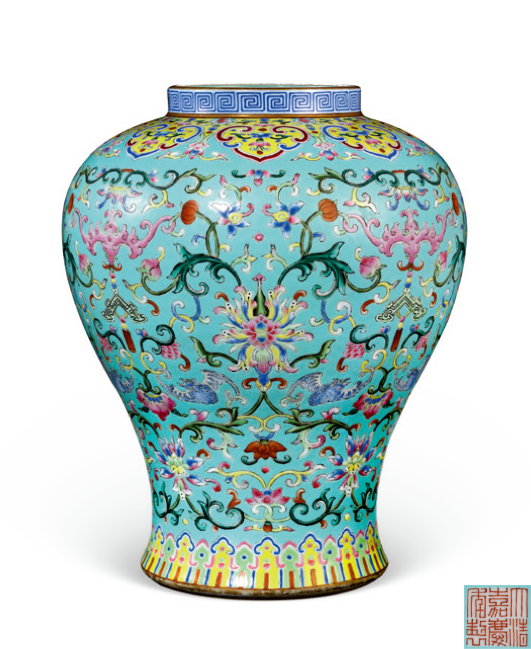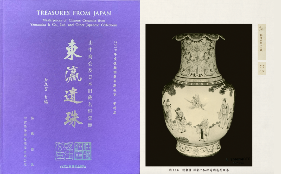 本器或为清宫档案中载“翡翠地洋彩八仙如意尊”,由督陶官穆克登于乾隆五十年所进贡。穆克登曾于乾隆四十九至五十年任九江关监督,督理景德镇陶务。此当其为讨乾隆欢心,自行筹资所制作的捐制贡瓷,较之大运瓷器更富新意,数量也更为稀少,属御用瓷中最为精美之类。“翡翠地洋彩八仙如意尊”进贡于乾隆五十年七月二十九日。由于乾隆皇帝出生于康熙五十年八月十三日,此批进贡极有可能是专为乾隆75岁生日所烧制,即万寿节贺礼。乾隆五十年为乾隆帝登基五十年的大庆之年。本年乾隆喜得五世元孙、举办千叟宴盛典、《四库全书》编篡功成、弘历七十五岁大寿,可谓喜事连连。千叟宴是清代宫廷的大宴之一,最早始于康熙,盛于乾隆时期,是清宫中的规模最大,与宴者最多的盛大皇家御宴,在清代共举办过4次。乾隆五十年(公元1785年)正月初六日,四海承平,天下富足。适逢乾隆喜添五世元孙,乾隆帝为表示其皇恩浩荡,在乾清宫如期举行了千叟宴。宴会场面之大,实为空前。自宗室王贝勒以下,内外文武大臣官员、致仕大臣官员、受封文武官阶过60者约有3000余人,共聚一堂。据清宫档案记载,当时进贡一对。若确为本器,其另一只当为现藏故宫博物院之相似器(故00152448),见著汪庆正编,《中国陶瓷全集 15 清》下,页65。两者于器型、纹样、尺寸(故宫藏品高38cm)皆如出一辙,款识亦极为相仿,或即穆克登为乾隆74岁特意烧制进贡的寿礼之一对。此类器极受珍视,故宫所藏曾作为全书封面,出版于叶佩兰著《中国彩瓷》中,见《中国彩瓷》,上海古籍出版社,2005年,封面及页230。本器外卷之如意云口造型别致,于制胎、烧制工艺上更具难度,至早或可追溯至宋元时期北方之钧窑、磁州窑器,后亦见于景德镇青白器上,口如花绽放,线条灵动,如皇家安大略博物馆藏宋青白釉划花花口盘,见《宋元青白瓷器》,伦敦,2002年,页136-137,图版71。此种装饰之风时见于乾隆晚期,并延续至嘉庆时期,如颐和园藏【清嘉庆 粉彩紫地八仙庆寿云口瓶】,虽整体造型有别,但如意云口、纹样层次及八仙祝寿之题材如出一辙,见《御苑英华——慈禧文物精品集》,沈阳出版社,2014年,页23。另如上海博物馆藏【清嘉庆 绿地粉彩螭龙穿枝花卉纹双耳瓶】,同样于松石绿地上绘粉彩花卉,口沿外折如意云头,见《清代雍正-宣统官窑瓷器》,上海人民出版社,2014年,图3-82。山中商会为20世纪早期日本知名古董商,鼎盛时期在北京、上海、伦敦、波士顿等地皆有分店。如今珍藏于欧美各大博物馆的诸多精品,皆经由山中商会之手入藏。其于1912年购得恭王府旧藏,并在伦敦、纽约两地举办恭王府专场拍卖,取得了巨大成功。此拍品曾多次在山中商会主办的重要活动展览中出现,并出版著录于山中商会编写图册中,由此可见山中商会对于此物极为重视。