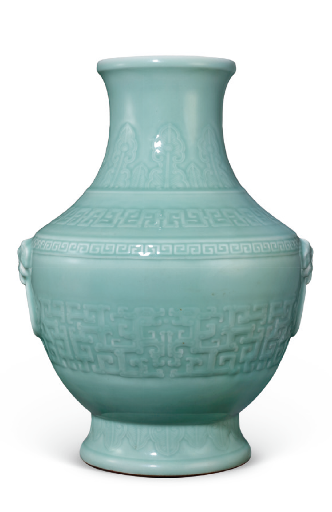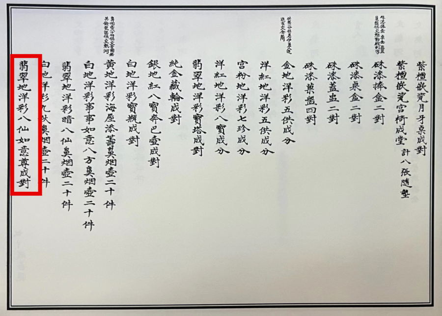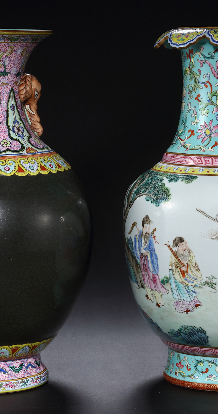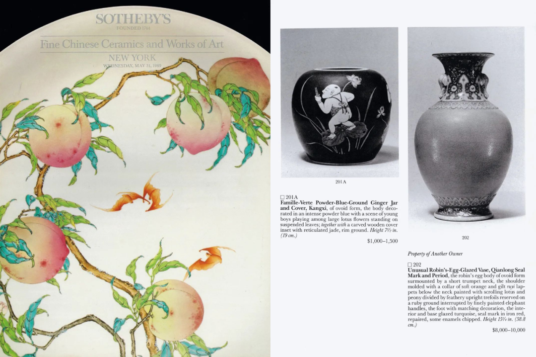 本器或为清宫档案中载“翡翠地洋彩八仙如意尊”,由督陶官穆克登于乾隆五十年所进贡。穆克登曾于乾隆四十九至五十年任九江关监督,督理景德镇陶务。此当其为讨乾隆欢心,自行筹资所制作的捐制贡瓷,较之大运瓷器更富新意,数量也更为稀少,属御用瓷中最为精美之类。“翡翠地洋彩八仙如意尊”进贡于乾隆五十年七月二十九日。由于乾隆皇帝出生于康熙五十年八月十三日,此批进贡极有可能是专为乾隆75岁生日所烧制,即万寿节贺礼。乾隆五十年为乾隆帝登基五十年的大庆之年。本年乾隆喜得五世元孙、举办千叟宴盛典、《四库全书》编篡功成、弘历七十五岁大寿,可谓喜事连连。千叟宴是清代宫廷的大宴之一,最早始于康熙,盛于乾隆时期,是清宫中的规模最大,与宴者最多的盛大皇家御宴,在清代共举办过4次。乾隆五十年(公元1785年)正月初六日,四海承平,天下富足。适逢乾隆喜添五世元孙,乾隆帝为表示其皇恩浩荡,在乾清宫如期举行了千叟宴。宴会场面之大,实为空前。自宗室王贝勒以下,内外文武大臣官员、致仕大臣官员、受封文武官阶过60者约有3000余人,共聚一堂。据清宫档案记载,当时进贡一对。若确为本器,其另一只当为现藏故宫博物院之相似器(故00152448),见著汪庆正编,《中国陶瓷全集 15 清》下,页65。两者于器型、纹样、尺寸(故宫藏品高38cm)皆如出一辙,款识亦极为相仿,或即穆克登为乾隆74岁特意烧制进贡的寿礼之一对。此类器极受珍视,故宫所藏曾作为全书封面,出版于叶佩兰著《中国彩瓷》中,见《中国彩瓷》,上海古籍出版社,2005年,封面及页230。本器外卷之如意云口造型别致,于制胎、烧制工艺上更具难度,至早或可追溯至宋元时期北方之钧窑、磁州窑器,后亦见于景德镇青白器上,口如花绽放,线条灵动,如皇家安大略博物馆藏宋青白釉划花花口盘,见《宋元青白瓷器》,伦敦,2002年,页136-137,图版71。此种装饰之风时见于乾隆晚期,并延续至嘉庆时期,如颐和园藏【清嘉庆 粉彩紫地八仙庆寿云口瓶】,虽整体造型有别,但如意云口、纹样层次及八仙祝寿之题材如出一辙,见《御苑英华——慈禧文物精品集》,沈阳出版社,2014年,页23。另如上海博物馆藏【清嘉庆 绿地粉彩螭龙穿枝花卉纹双耳瓶】,同样于松石绿地上绘粉彩花卉,口沿外折如意云头,见《清代雍正-宣统官窑瓷器》,上海人民出版社,2014年,图3-82。山中商会为20世纪早期日本知名古董商,鼎盛时期在北京、上海、伦敦、波士顿等地皆有分店。如今珍藏于欧美各大博物馆的诸多精品,皆经由山中商会之手入藏。其于1912年购得恭王府旧藏,并在伦敦、纽约两地举办恭王府专场拍卖,取得了巨大成功。此拍品曾多次在山中商会主办的重要活动展览中出现,并出版著录于山中商会编写图册中,由此可见山中商会对于此物极为重视。