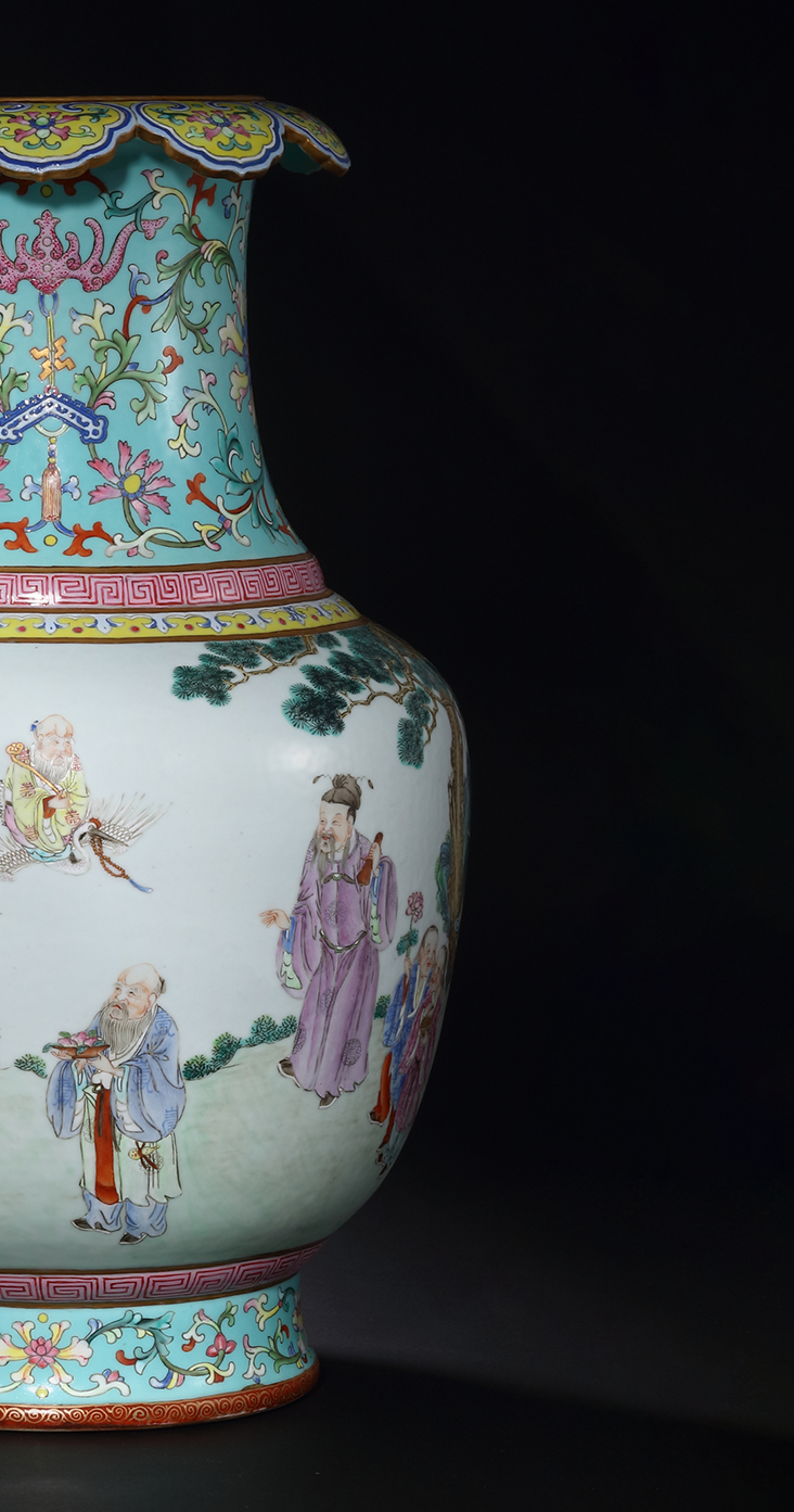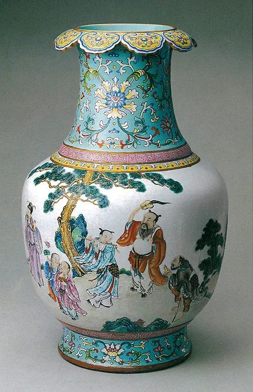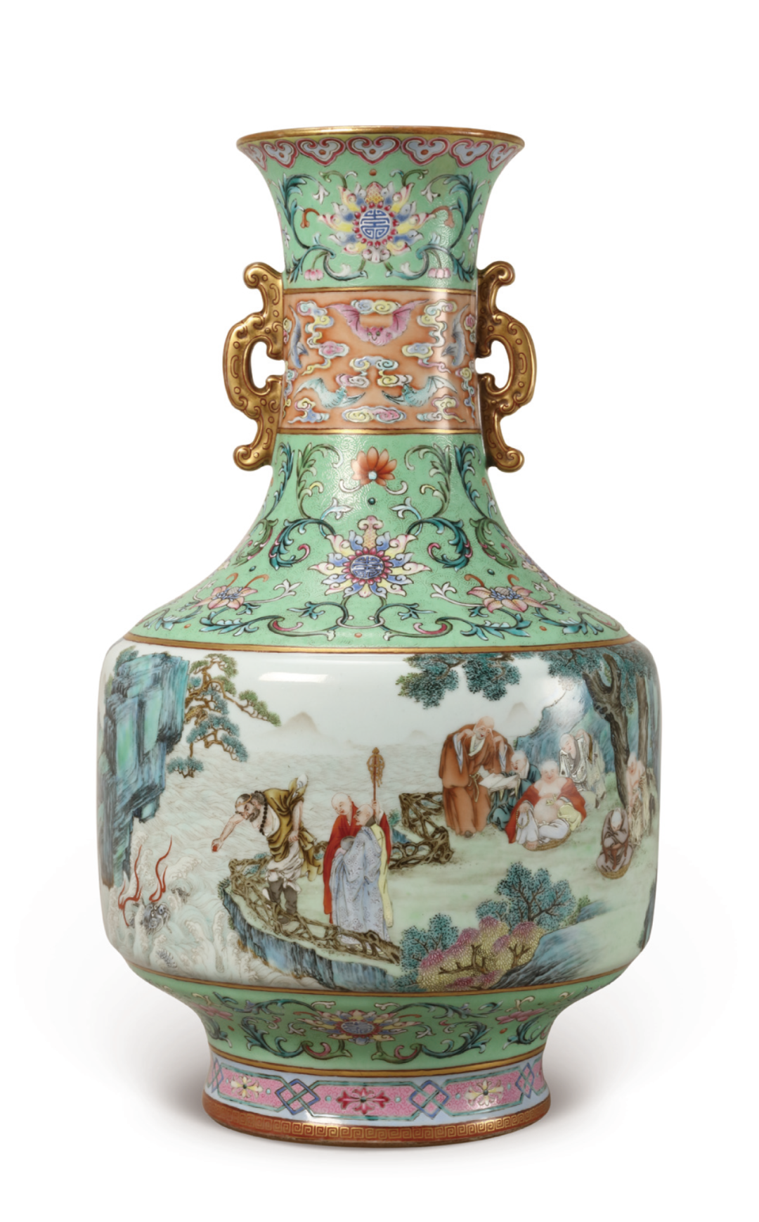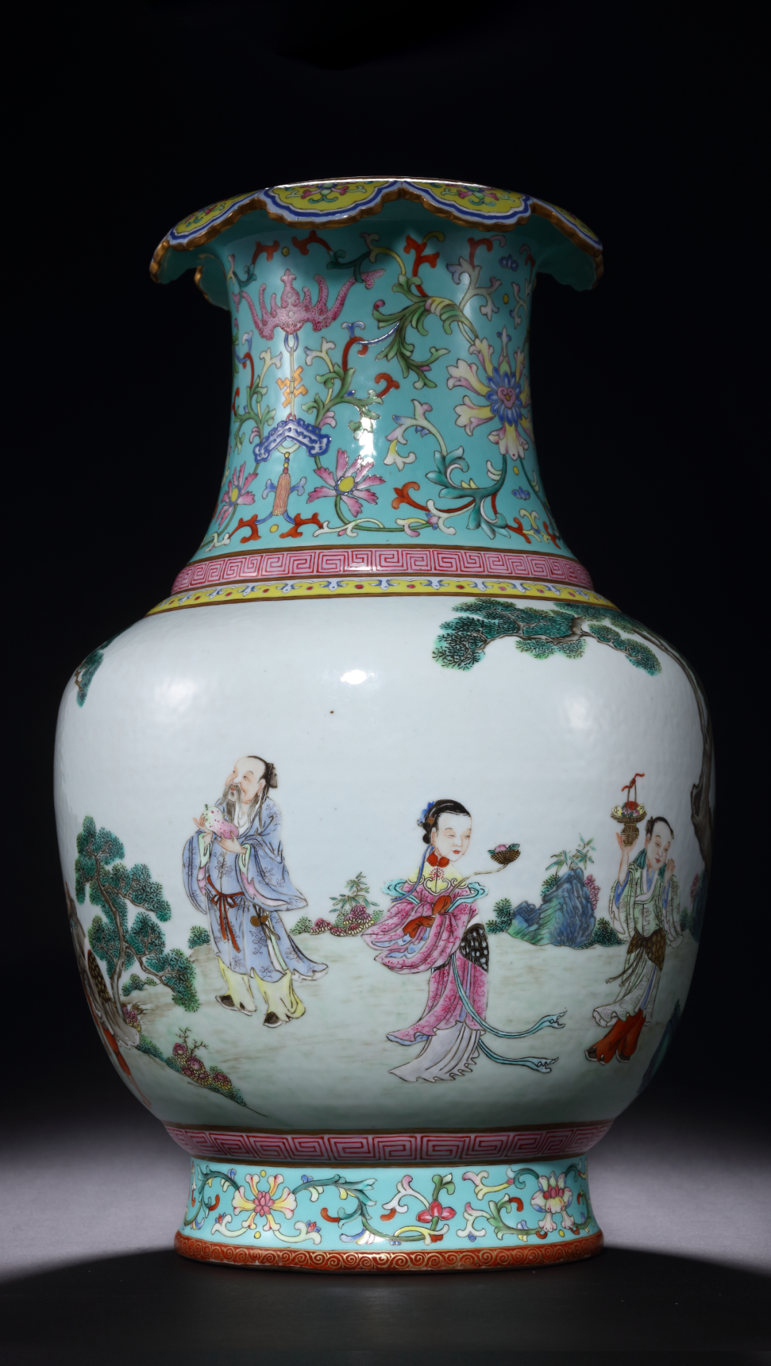 此瓶撇口束颈,丰肩鼓腹,下敛至足,足部外撇。器身主体以洋彩绘群仙祝寿通景纹样,南极仙翁手持如意,乘鹤翩翩而来;福禄寿三星齐聚一堂,八仙各持法器,笑意盈盈,神采奕奕;寒山、拾得和合二仙一持荷花,一持宝盒,寓意家庭和美、社会和谐。众人皆向乘鹤而来的寿老方向。器型别致处,乃于口沿装饰相连的八个翻口如意云头,于黄地上彩绘花卉纹;颈部及足皆以松石绿为地,绘花卉纹样,上下呼应,如卷轴之画绫,使主体纹样更为凸显;颈部间饰蝙蝠衔磬及「卍」字,寓意吉庆有余。足内亦施松石绿釉,中间以红彩书“大清乾隆年制”六字三行篆书款。八仙之神话故事最早或见于唐宋,但人物组成不定,直到明代才形成了如今家喻户晓之八仙组合,其流行或与明代帝王崇信道教有关。时至清代,八仙的宗教意味渐弱,而以庆寿之意广为流传。清代宫廷承应戏中,八仙庆寿是最重要的一类,在帝后、皇子及公主寿诞时,常作为开场戏,以表帝王圣寿之时,神仙送仙物祝寿,得长生之喜,场面盛大华丽,并以此歌功颂德,赞颂太平盛景。