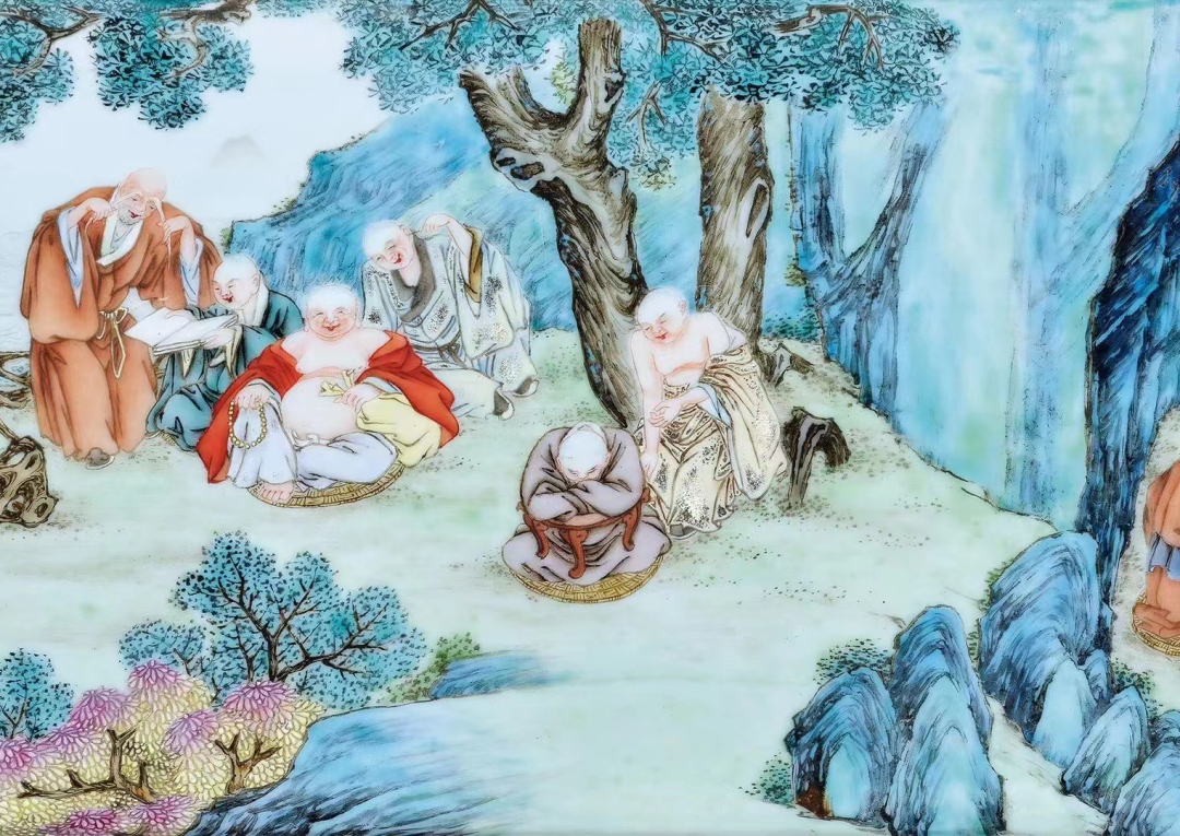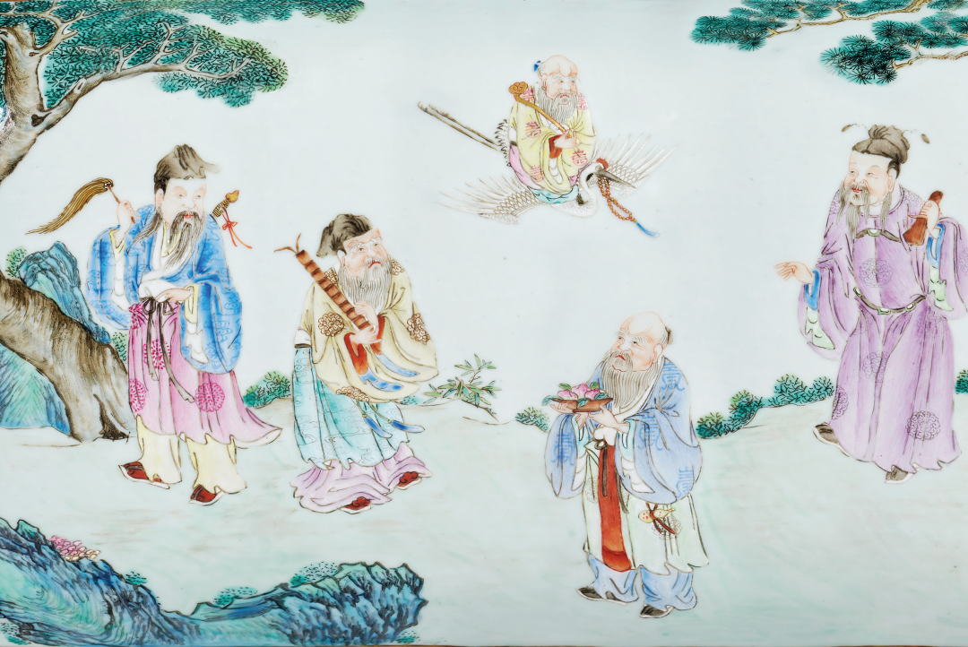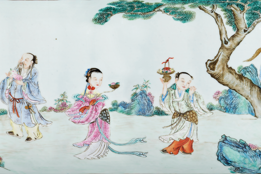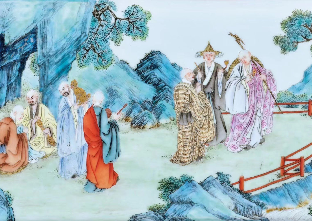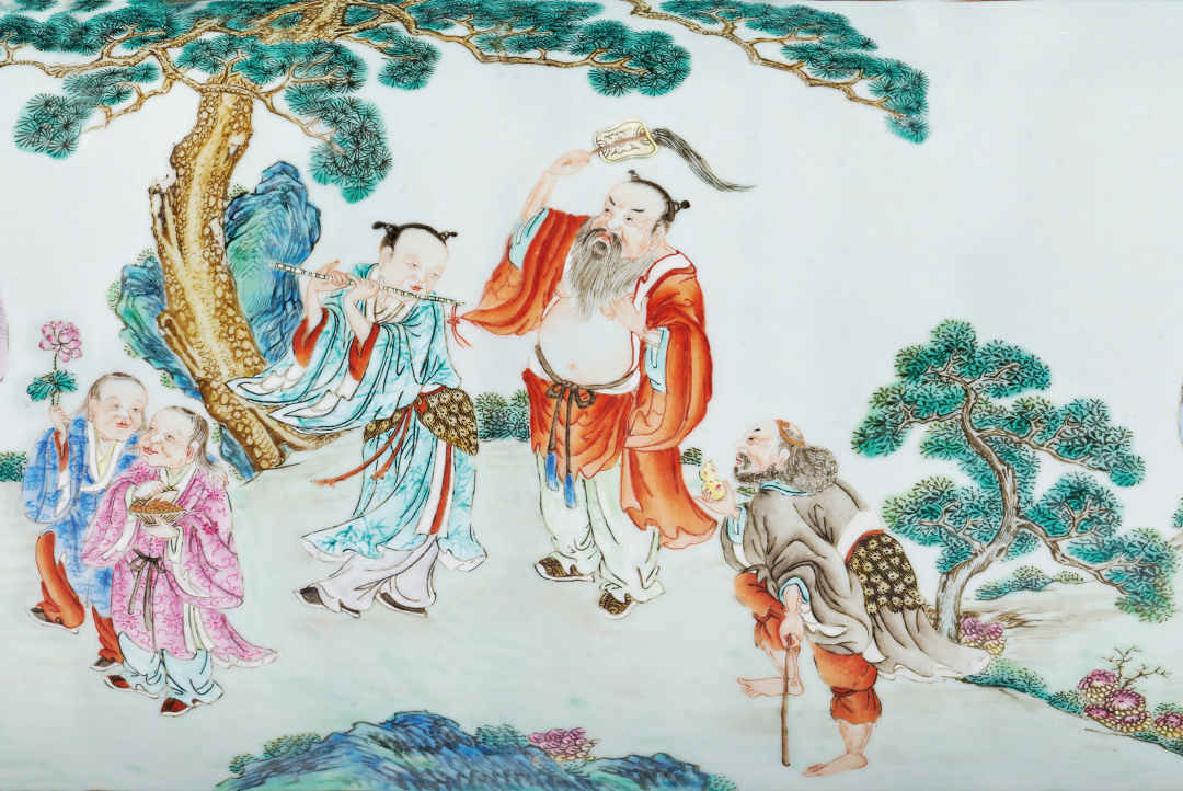 此瓶撇口束颈,丰肩鼓腹,下敛至足,足部外撇。器身主体以洋彩绘群仙祝寿通景纹样,南极仙翁手持如意,乘鹤翩翩而来;福禄寿三星齐聚一堂,八仙各持法器,笑意盈盈,神采奕奕;寒山、拾得和合二仙一持荷花,一持宝盒,寓意家庭和美、社会和谐。众人皆向乘鹤而来的寿老方向。器型别致处,乃于口沿装饰相连的八个翻口如意云头,于黄地上彩绘花卉纹;颈部及足皆以松石绿为地,绘花卉纹样,上下呼应,如卷轴之画绫,使主体纹样更为凸显;颈部间饰蝙蝠衔磬及「卍」字,寓意吉庆有余。足内亦施松石绿釉,中间以红彩书“大清乾隆年制”六字三行篆书款。八仙之神话故事最早或见于唐宋,但人物组成不定,直到明代才形成了如今家喻户晓之八仙组合,其流行或与明代帝王崇信道教有关。时至清代,八仙的宗教意味渐弱,而以庆寿之意广为流传。清代宫廷承应戏中,八仙庆寿是最重要的一类,在帝后、皇子及公主寿诞时,常作为开场戏,以表帝王圣寿之时,神仙送仙物祝寿,得长生之喜,场面盛大华丽,并以此歌功颂德,赞颂太平盛景。