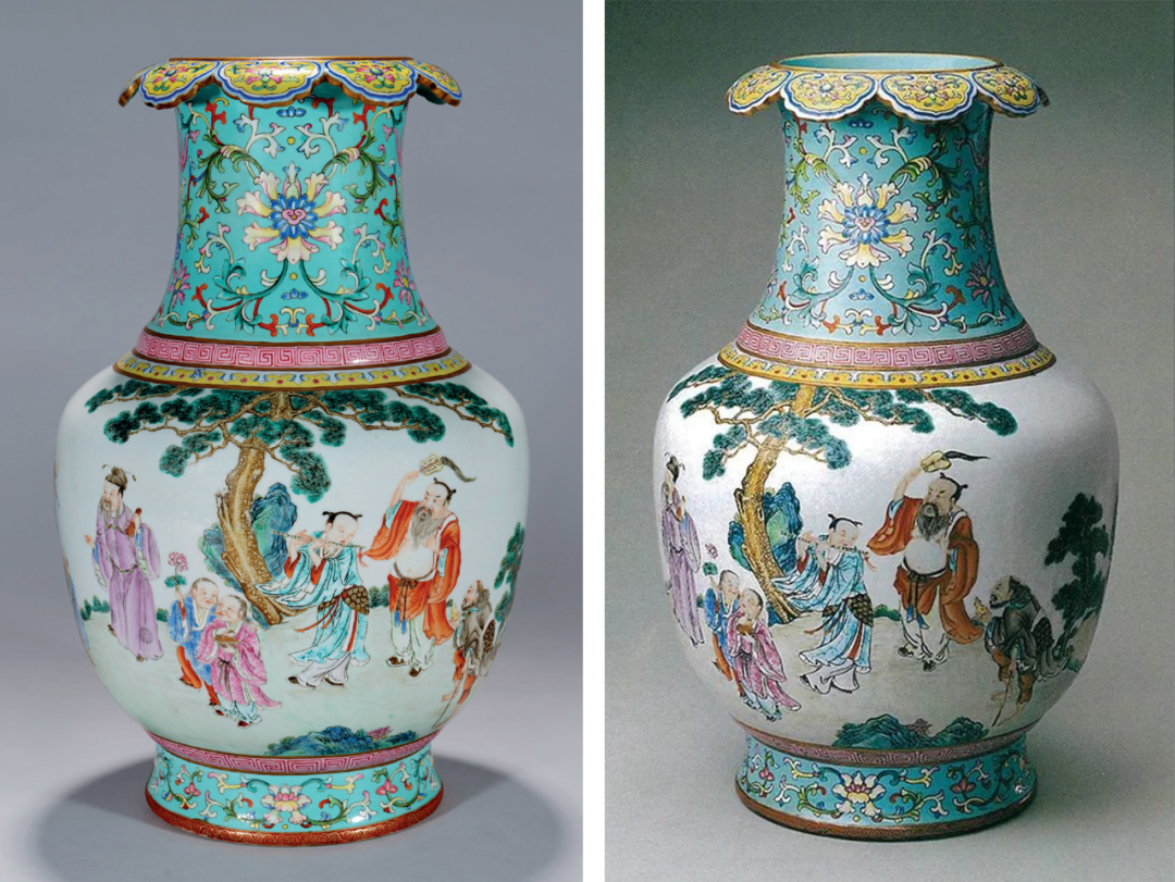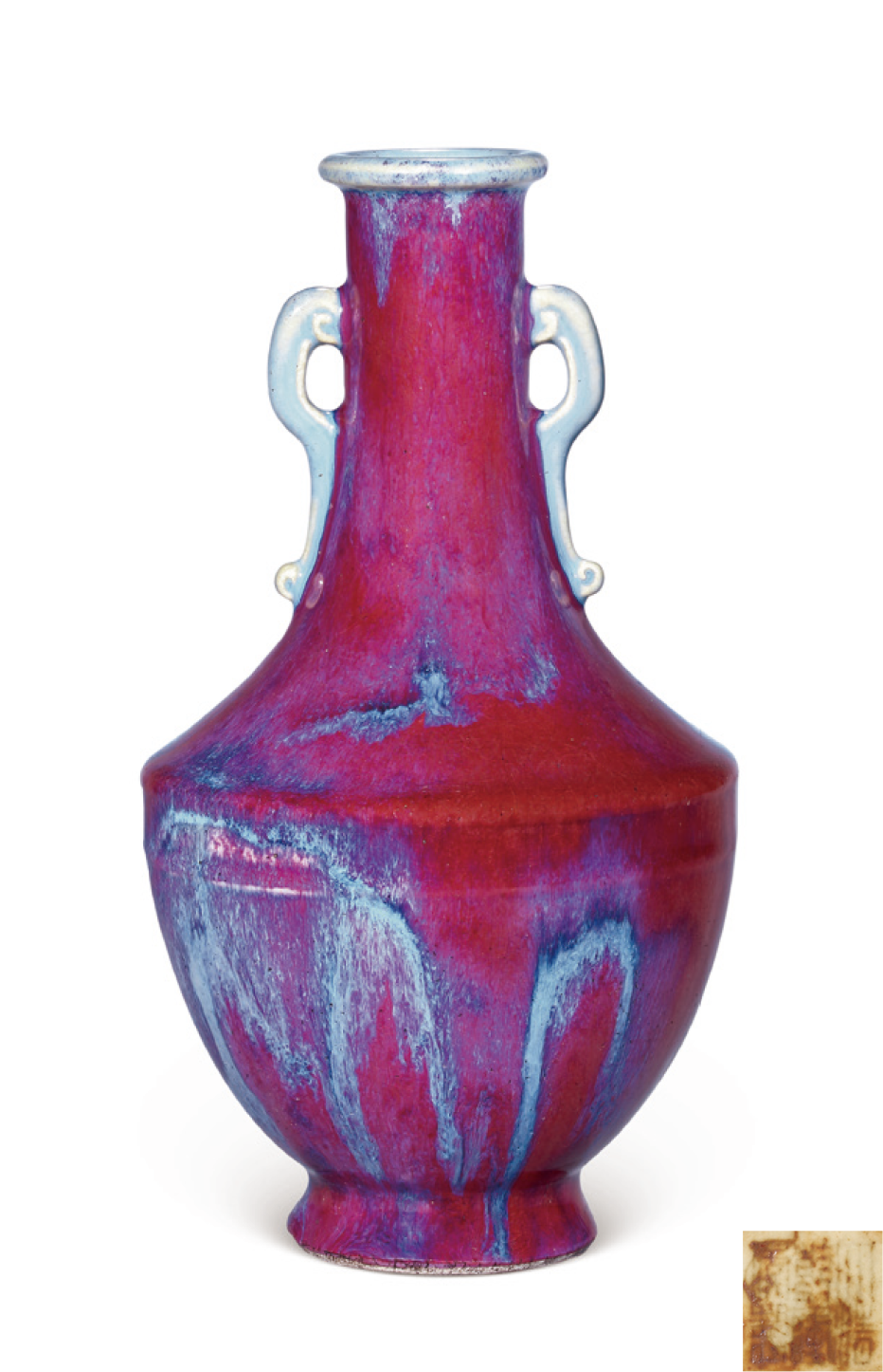 有一例与本器酷似之转心瓶曾先后上拍纽约佳士得与香港苏富比。此二者密切关联。与此器物相似的洋彩加单色釉非转心瓶,尚有一件曾于1989年售于纽约苏富比,为洋彩炉钧釉,可供参考。而洋彩炉钧釉的转心瓶版本曾于2011年售于香港苏富比,2021年再次售于北京保利拍卖秋拍,编号5537,成交价为82,225,000人民币。北京保利拍卖,2021年12月05日,编号5537,成交价:82,225,000人民币在 S.W. Bushell,《Oriental Ceramic Art》,伦敦,1896年,图版108中可见一洋彩炉钧釉双象首瓶,亦不可转动。S.W. Bushell,《Oriental Ceramic Art》,伦敦,1896年,图版108