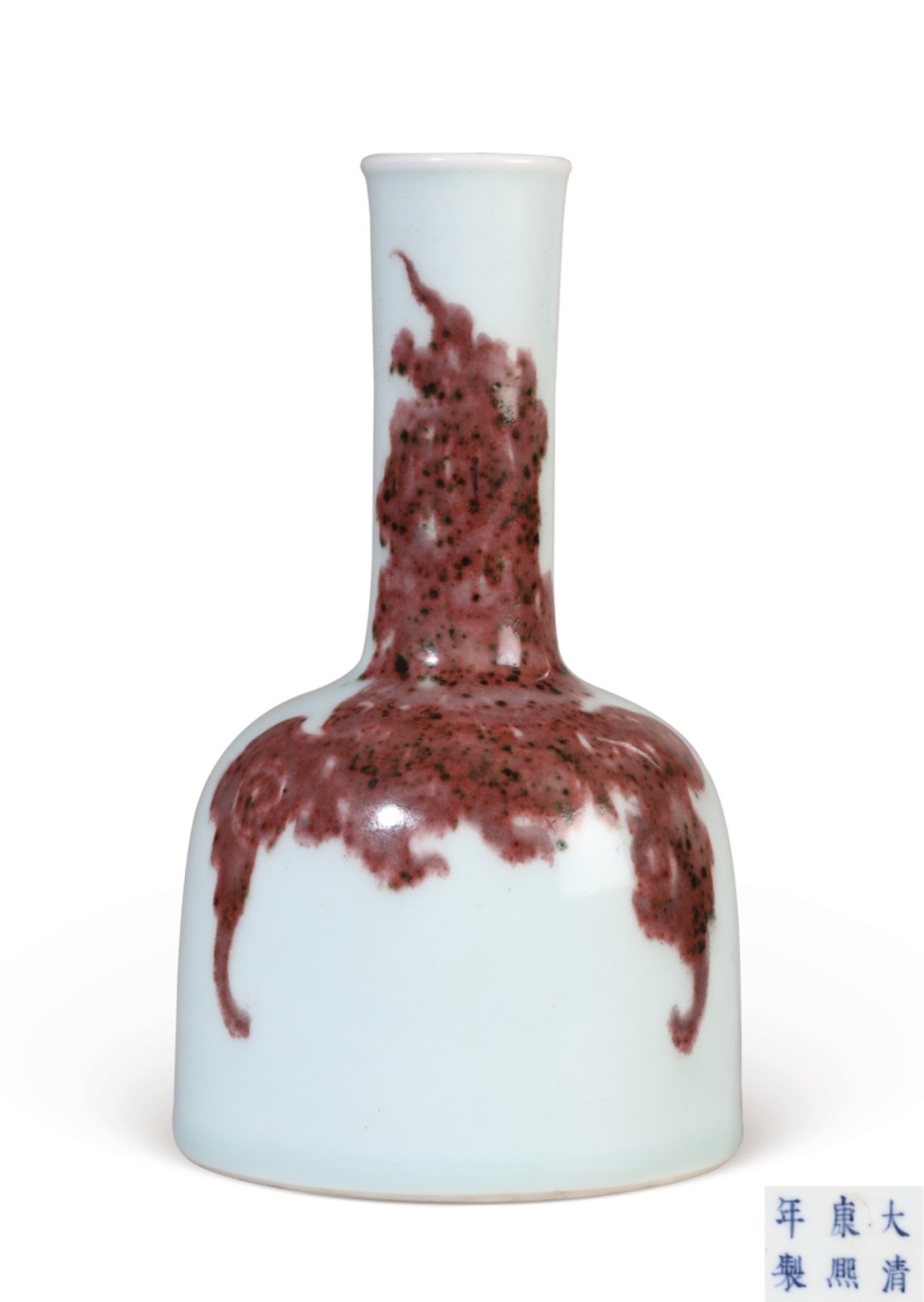本品唇口微撇,长直颈,圆肩,直腹,圈足。主题纹饰以釉里红绘夔凤纹,一对夔凤展翅自肩部伸延到底部,各口衔一环,尾羽华丽。底足青花书“大清康熙年制”楷书款。康熙夔凤纹摇铃尊是由康熙御窑场创烧,且深得皇帝青睐的御瓷,多见以青花装饰,亦有罕见的釉里红范例,且色釉质量出众者,世间罕矣。至雍正朝,因此尊锋芒毕现,霸气外露,缺乏含蓄内敛之韵,遂不复制矣。釉里红以铜着色,烧制中温度稍有不稳极易造成釉色发乌焦黑或生涩泛青。在康熙年间,釉里红制器属铮铮有名的贵品。