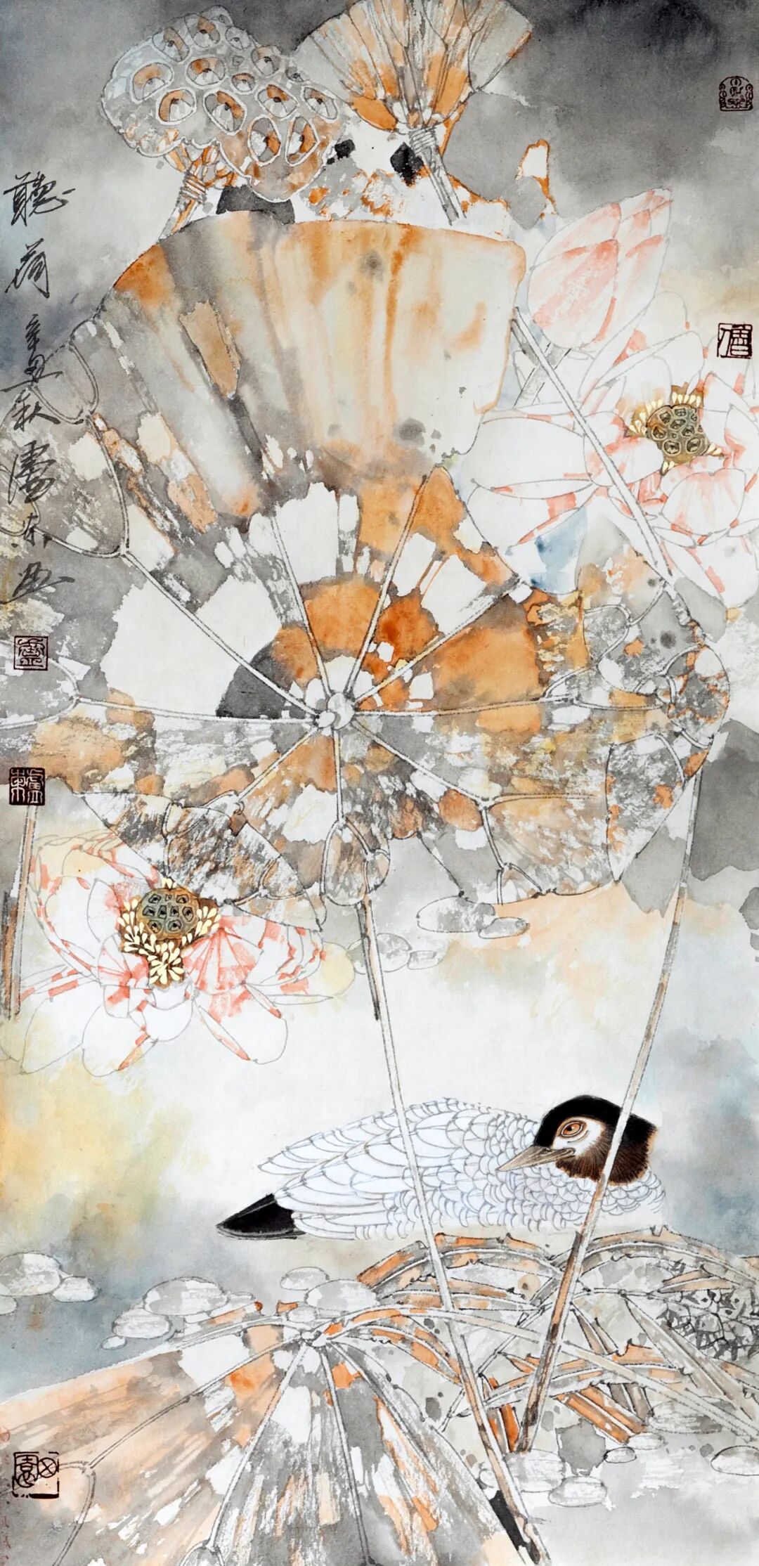 在卢东的笔下,荷塘变得生气勃勃、气象万千,其中还充斥着很出众的境界,使得整幅画的观感变得更加深远静逸,展现出画家悠然自乐的心境。他沉浸于自然之境中,借用自然中的意象,将艺术之趣演绎得淋漓尽致。