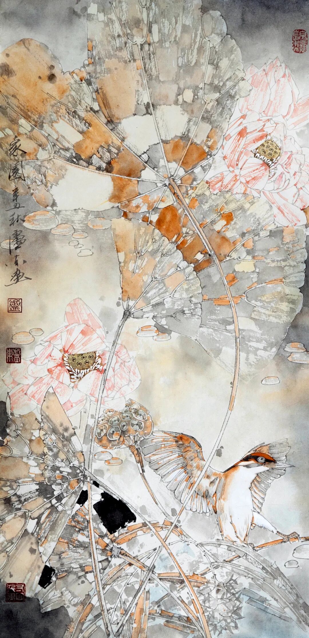 至于对于意境的塑造,卢东借用于自己的情感造势,让画中的意境变得十分深邃。他的画既有精心雕琢的笔触,又有泼墨绘就的写意式风格,使得画中工写兼备,在两种笔墨特点中游离,将画中景致变得更富有艺术气息。虽然画的内容大多是小小的荷塘,却能让人从中感受到天地之趣。