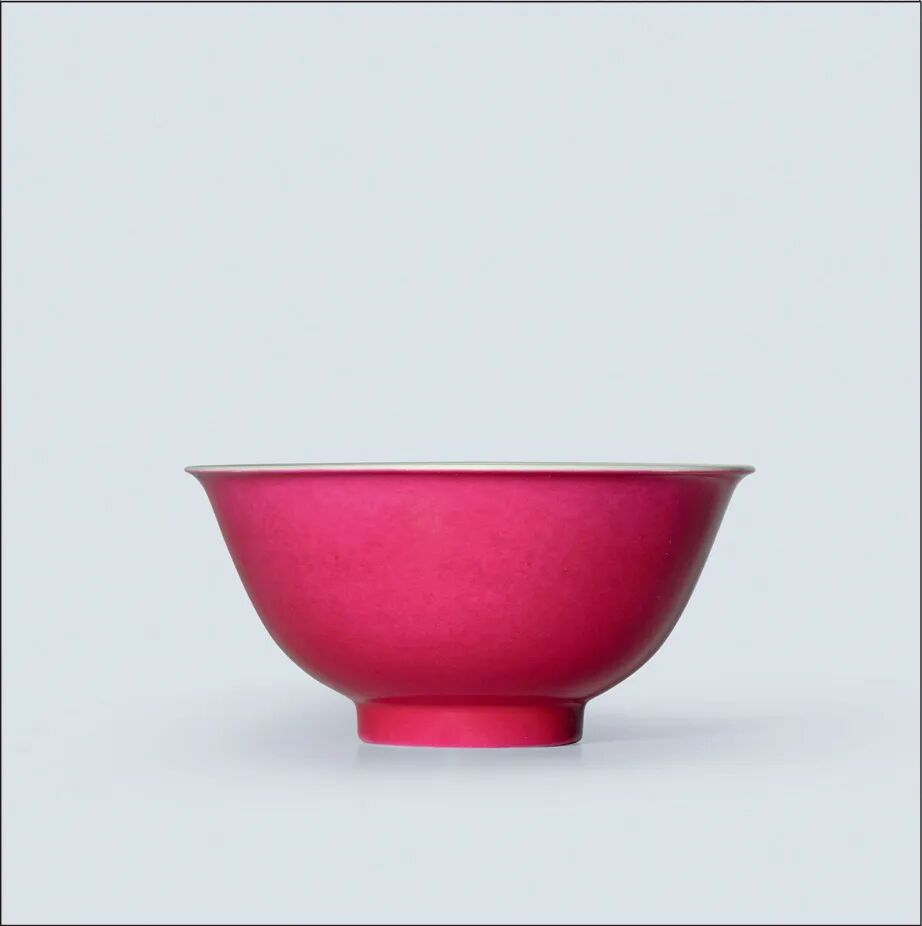 胭脂红釉料以金为呈色剂,由欧洲传入中国,清宫档案内皆称其为“西洋红”,又由于这种红釉颇如女子化妆用的胭脂之色,故又名“胭脂红”。雍正十三年(1735年)督陶官唐英所撰《陶成纪事》中记载当时岁例贡御的五十七种釉、彩瓷器中即有“西洋红色器皿”。胭脂红釉创烧于康熙末年,雍正、乾隆,乃至晚清各朝均有烧造,但其中尤以雍正作品质量最精。从传世品看,雍正朝胭脂红釉瓷器造型有瓶、罐、盘、碗、杯等,均胎体轻薄,玲珑隽秀,多数为内白釉,外胭脂红釉,其中有些如本品锥拱纹饰,或描绘粉彩花果,档次又高于其他同类作品。![]()