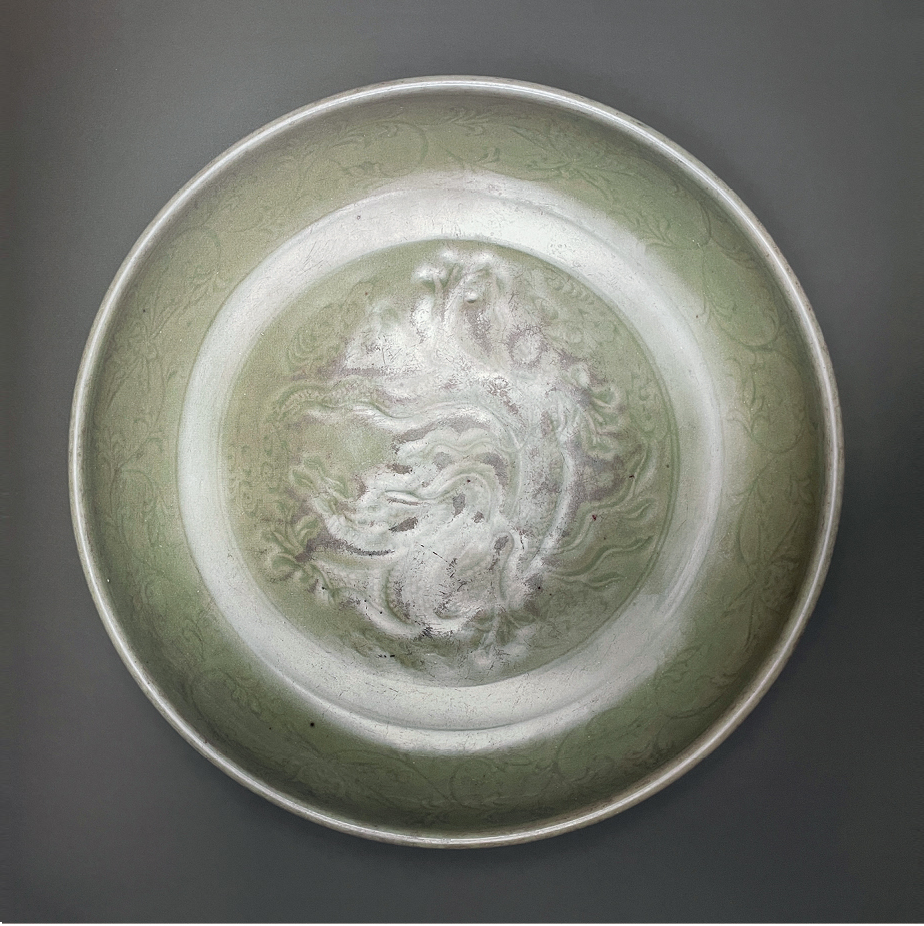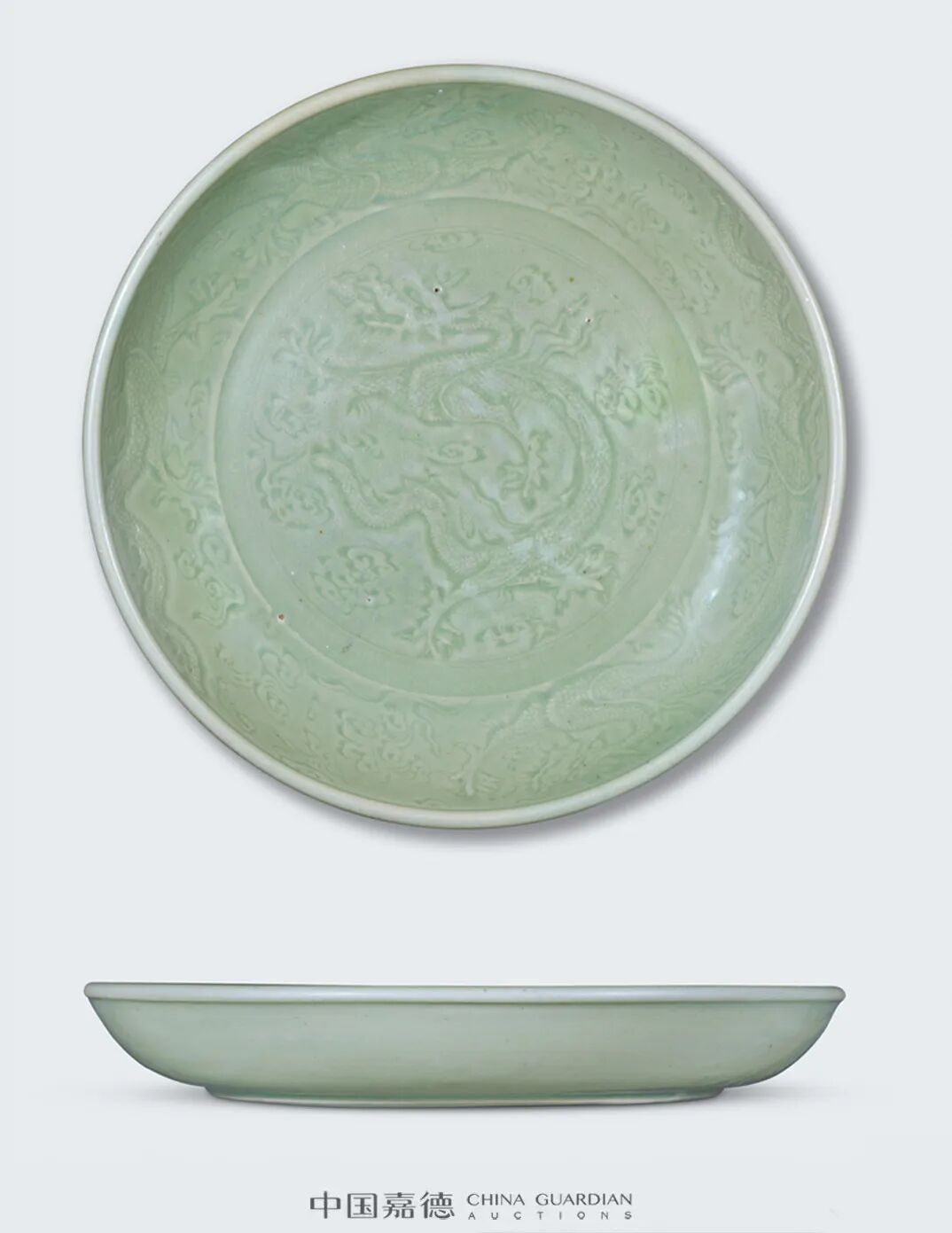 龙泉古称处州,窑业久负盛名,《大明会典》载:“洪武二十六年(1393)定,凡烧造供用器皿等物,须要定夺制样,计算人工物料。如果数多,起取人匠赴京,置窑兴工,或数少,行移饶、处等府烧造。”说明在明代初期,龙泉窑与饶州景德镇窑具有同等重要的地位。将二者并置的文献还有《明宪宗实录》,成化元年(1465)颁布诏书:“江西饶州府、浙江处州府,见差内官在役烧造瓷器,诏书到日,除已烧完者照数起解,未完者悉皆停止,差委官员即便回京,违者罪之。”此盘即为明代早期处州龙泉官窑之精品。同类型器物还见于故宫博物院所藏及龙泉大窑枫洞岩窑址出土明代早期残器,可资比较。![]()