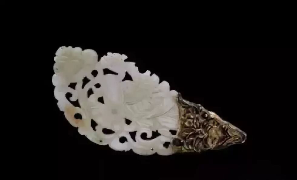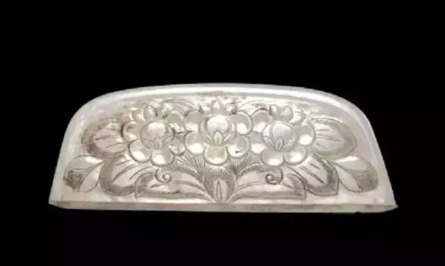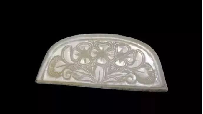 玉梳始见于殷商,此后各代每有所见,唯早期多呈圆首圭形或长方形。及至唐代.这一形式已消失,新出现的有宽长半月形。这种玉梳也有两式,一是整体都由玉科制作,半圆形,上端为梳柄,下端为梳齿,整体用一块玉制成,它与前期玉梳相比,齿牙加宽并变短,从而更方便使用。另一式玉梳也如前述玉簪同,即一部分为玉质,另一部分为金银等金属,玉质作梳柄(或名梳背),金属质作梳齿且多已无存。