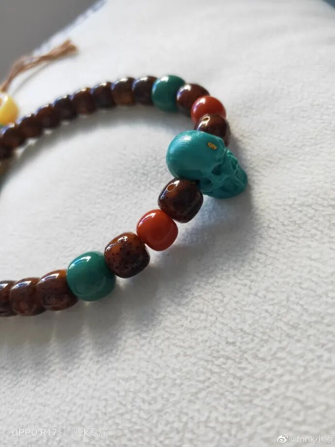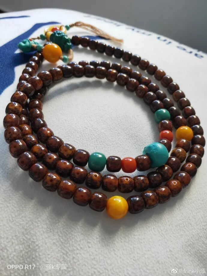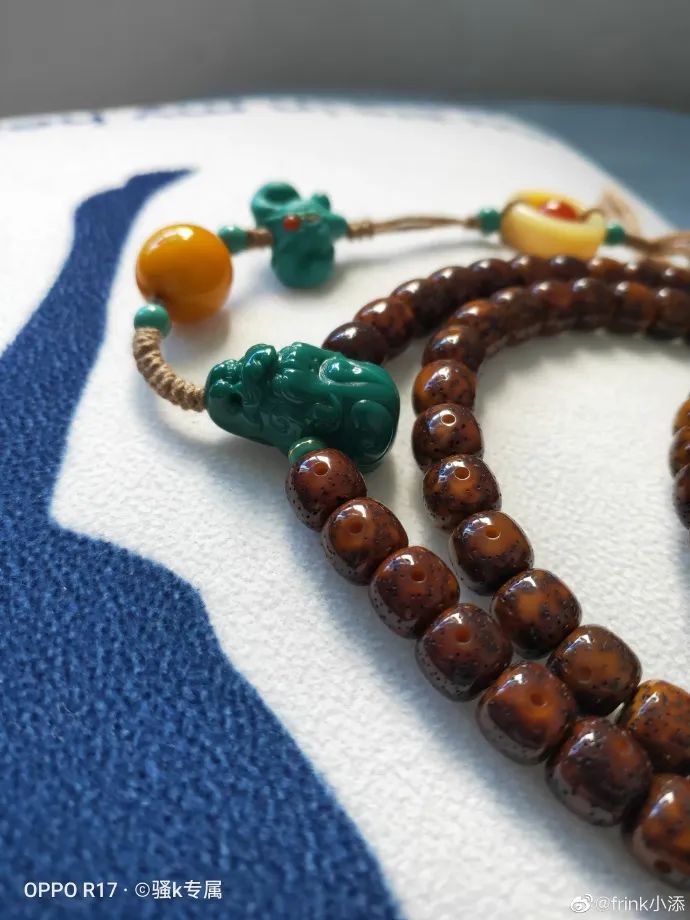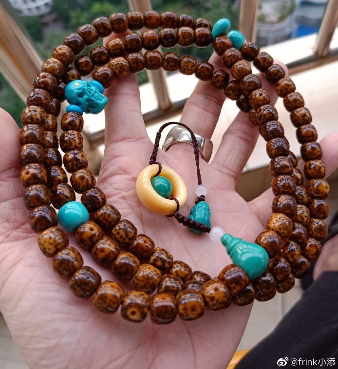 这一整套配饰配下来,尤其是绿松石的高瓷玉化料配精致雕工,2万块钱并不过分。俗话说:好马配好鞍。文玩人在经济能力允许的范围内,通常会从玩包浆向玩配饰过渡,那好串配好配饰,也不是不能理解的。而且,小添的这条108原生态星月菩提,入手时才200块钱,并不是多贵的精品串,经他的大干手盘了3年,这才盘得透亮。这一手盘玩的功夫,比配饰更值得羡慕!初见,无论是从价格还是从所谓月朗星稀的品相判断看,这条星月都是一条普普通通,甚至是品质比较差的星月,但他就是喜欢得不得了。▲一年零三个月,开始加配饰,绿松石顶珠、佛头款式简单。