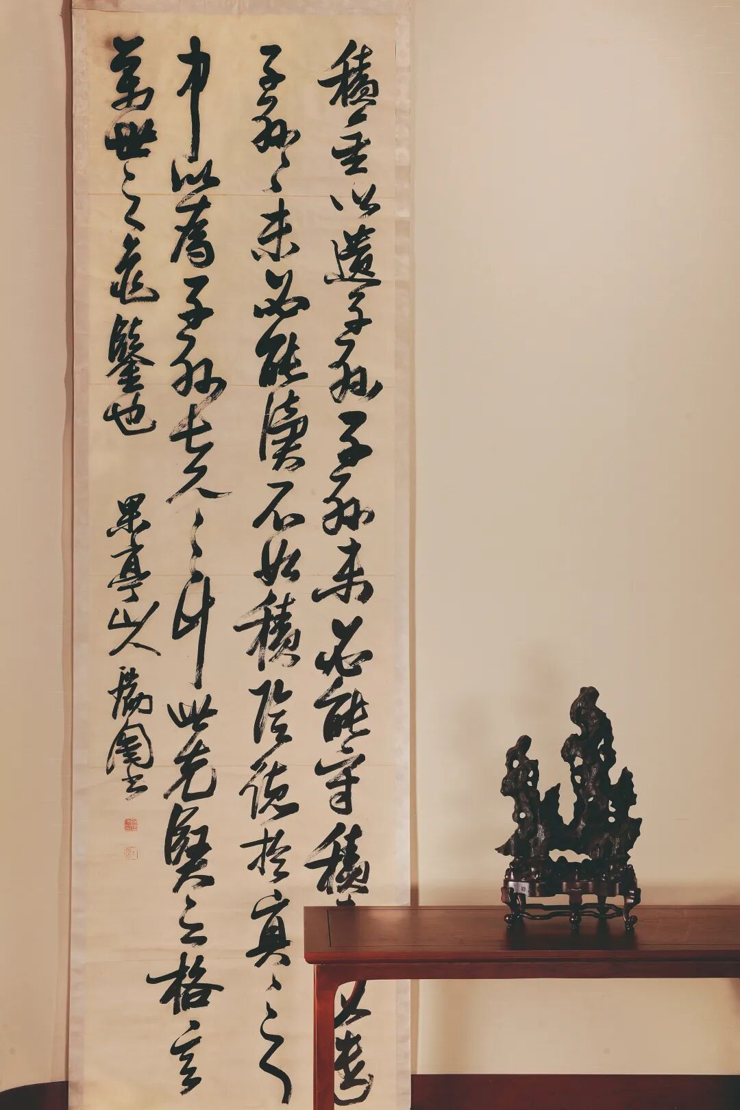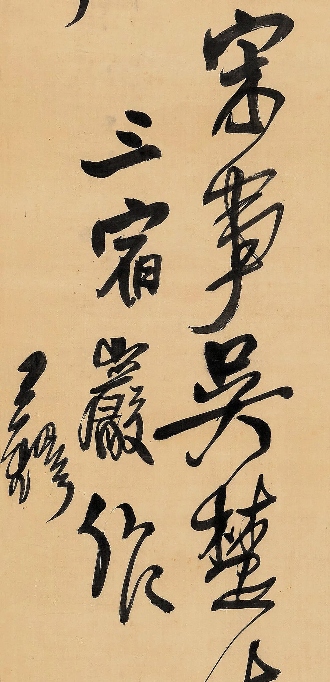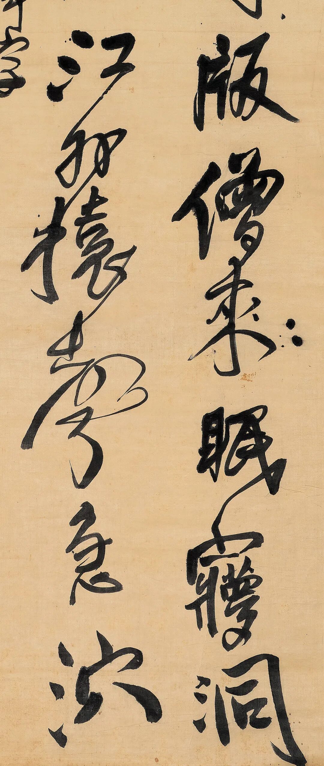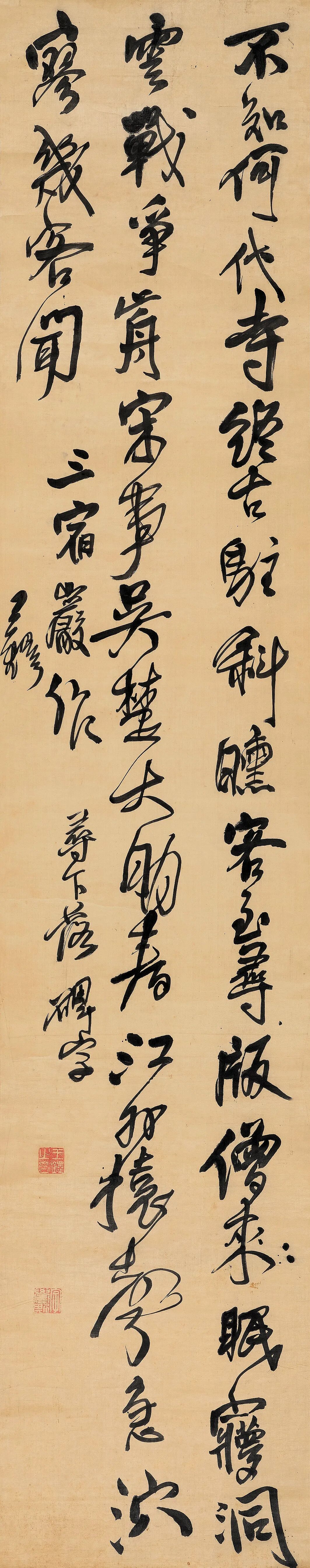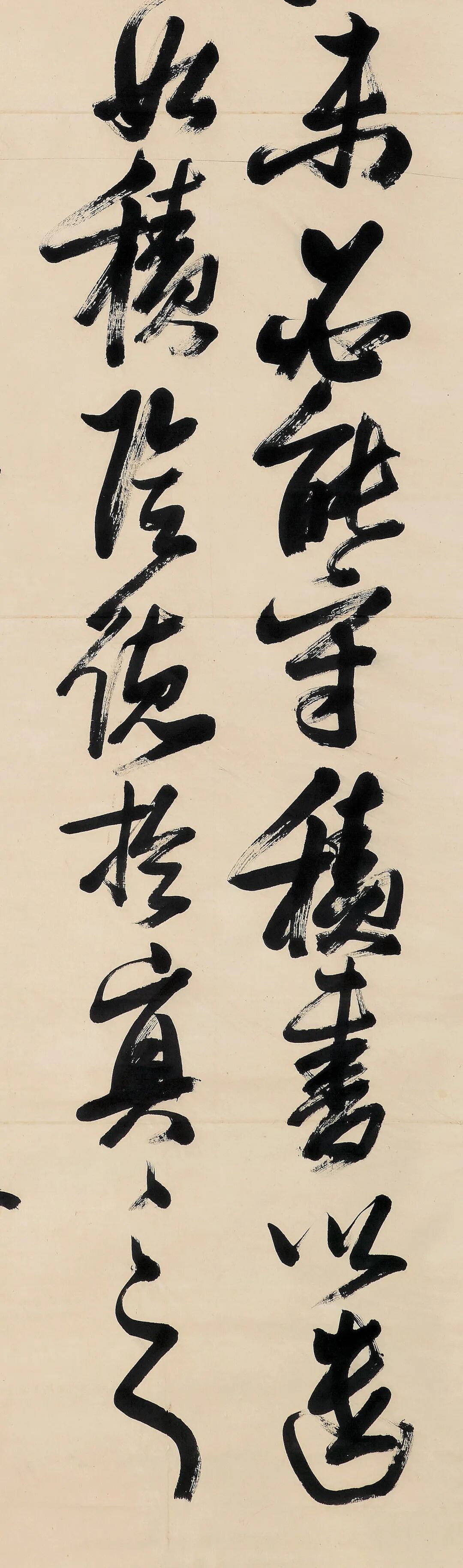 本件自作诗《三宿岩》巨轴,用笔或方或圆,时见折笔顿挫,结字奇崛险茂而富于变化,章法恣纵错落而不失法度,笔势连绵流畅而大气磅礴,于秀逸婉转之中追求刚健豪迈、苍郁雄畅的“气骨”。本轴尺幅巨大,晚明及清初巨轴书画的风行,并非仅仅关乎审美趋向或趣味,更与诸多外在因素密切相关。建筑结构的演进、厅堂样式的发展,致使悬画和室内空间的关系发生变化,进而催生了长轴或巨轴书画。文震亨《长物志》曾记录彼时的风尚:悬画宜高,斋中仅可置一轴于上,若悬两壁及左右对列,最俗。长画可挂高壁,不可用挨画竹曲挂画......堂中宜挂大幅、横批。想必此《三宿岩》诗轴曾悬高堂素壁之间,读之心神畅快,似游海外奇山,风恬浪定,天光水像,空荡无岸。