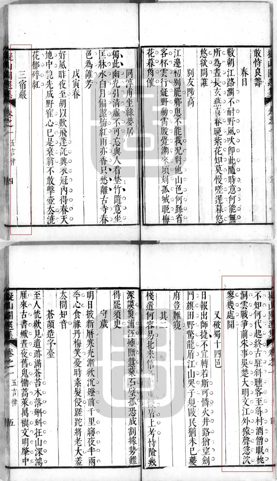 《拟山园选集》诗集卷之一·五言律诗,第四页,国家图书馆藏清顺治十年刻本。王铎草书自作诗《三宿岩》,绫本巨轴,诗见《拟山园选集》,文句略有不同。清代初期的书法主要延续明代的帖学传统,但风貌大相径庭,一些由明入清的书家承接明末张瑞图、倪元璐、黄道周等人的书风,以个性鲜明、直抒胸怀、狂放朴拙的行草书风名极一时,其中尤以王铎、傅山、八大山人最为重要。遗憾的是,这一路书风未能得到很好的传承,消失在书法史演进的洪流中,成为乱世绝响。王铎,与倪元璐、黄道周为同榜进士,入清后官至礼部尚书,书法胎出二王,旁参米芾,尤以行草大字见长。王铎对二王书风有着深刻的喜好和理解,从所作宋拓《圣教序》跋文中可见一斑:每遇烦惫,一披瞩辄有清气拂人,似游海外奇山,风恬浪定,天光水像,空荡无岸。此中消息,如文如诗。口之晓泠,不可单也。即强形容,他人未必喻。故曰:可为知者道。对二王法书的勤奋钻研一直持续到晚年,“一日临帖,一日应索”。就内容而言,王铎书法大致分作“临帖”和“应索”两类。从临帖作品中,能够窥探他对于古代经典的研习和取舍;从应索作品中,能够体会他熔古人精粹,进而突规破矩,自立风标,表现出强烈鲜明的个人风格。故而名重于时,友人彭而述尝为王铎《拟山园选集》作序:四十年来,荐绅士大夫罘罳绮疏,无先生一字,则以为其人鄙不足道。文辞虽略有夸张,却道出了王铎在当时备受推重的事实。黄道周赞之:行草近推王觉斯。觉斯方盛年,看其五十自化。(《黄漳浦集,卷十四,《书品论》)同为书法巨匠,傅山对于王铎的书风变化有着清醒的观察:四十年前字极力造作,四十年后无意合拍,遂能大家。(《霜红龛书论》)